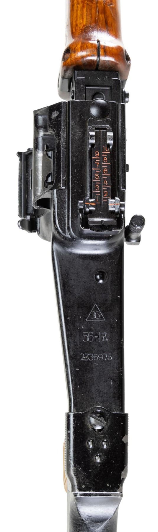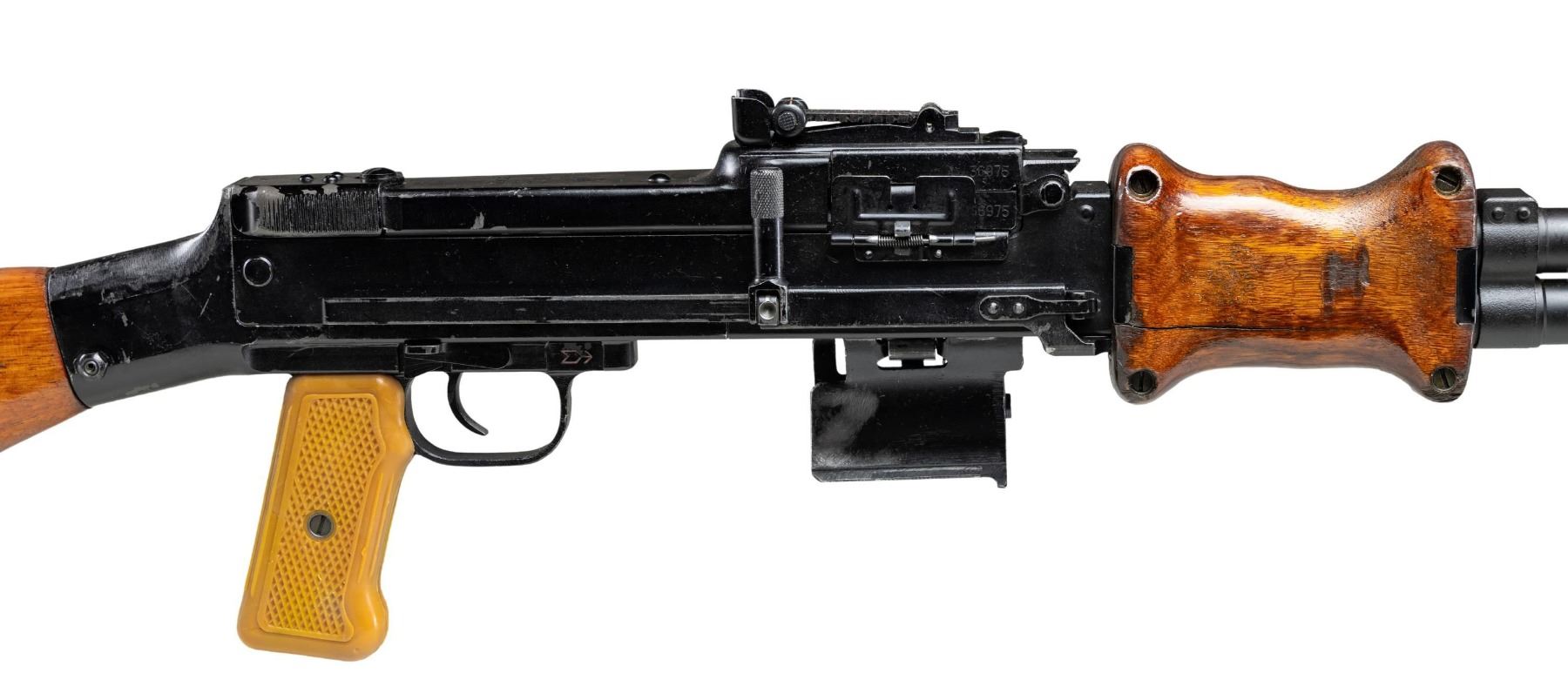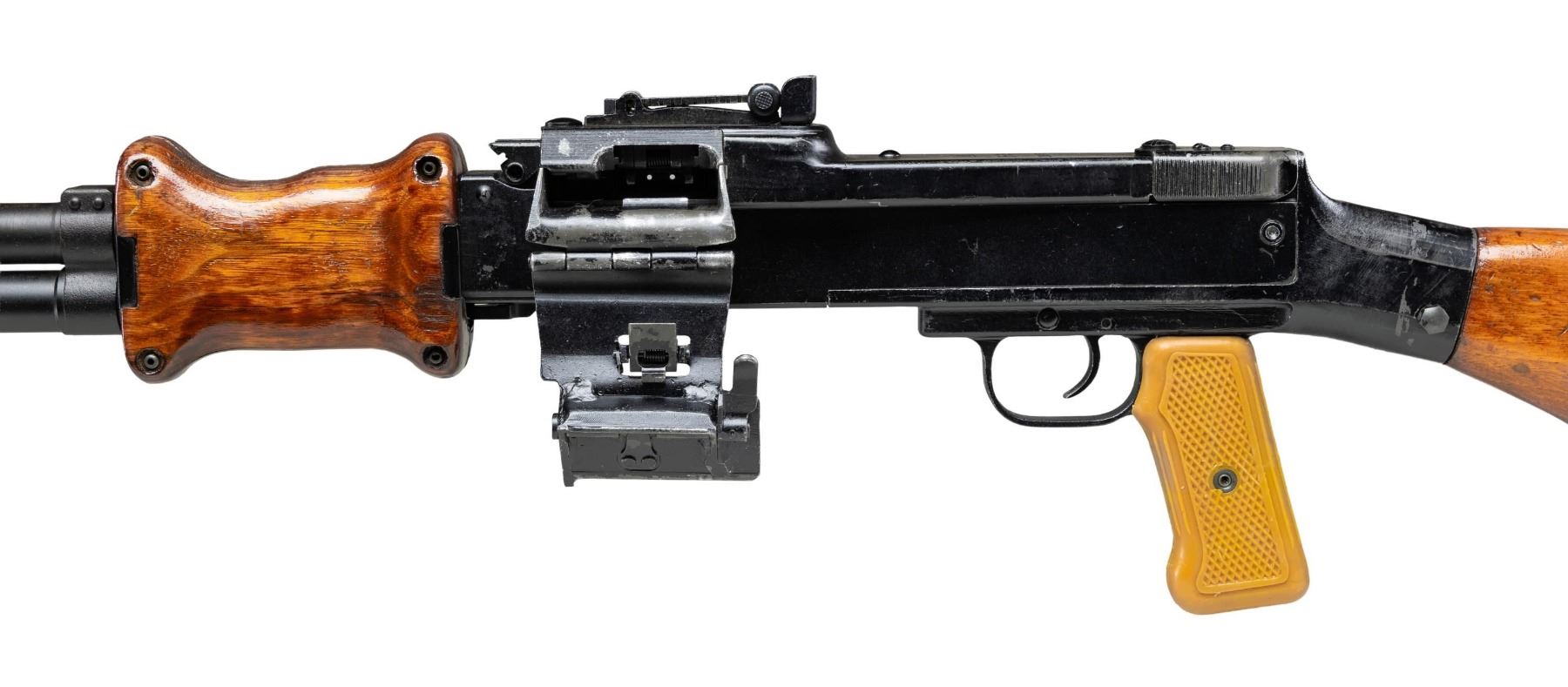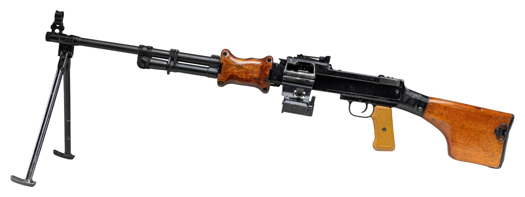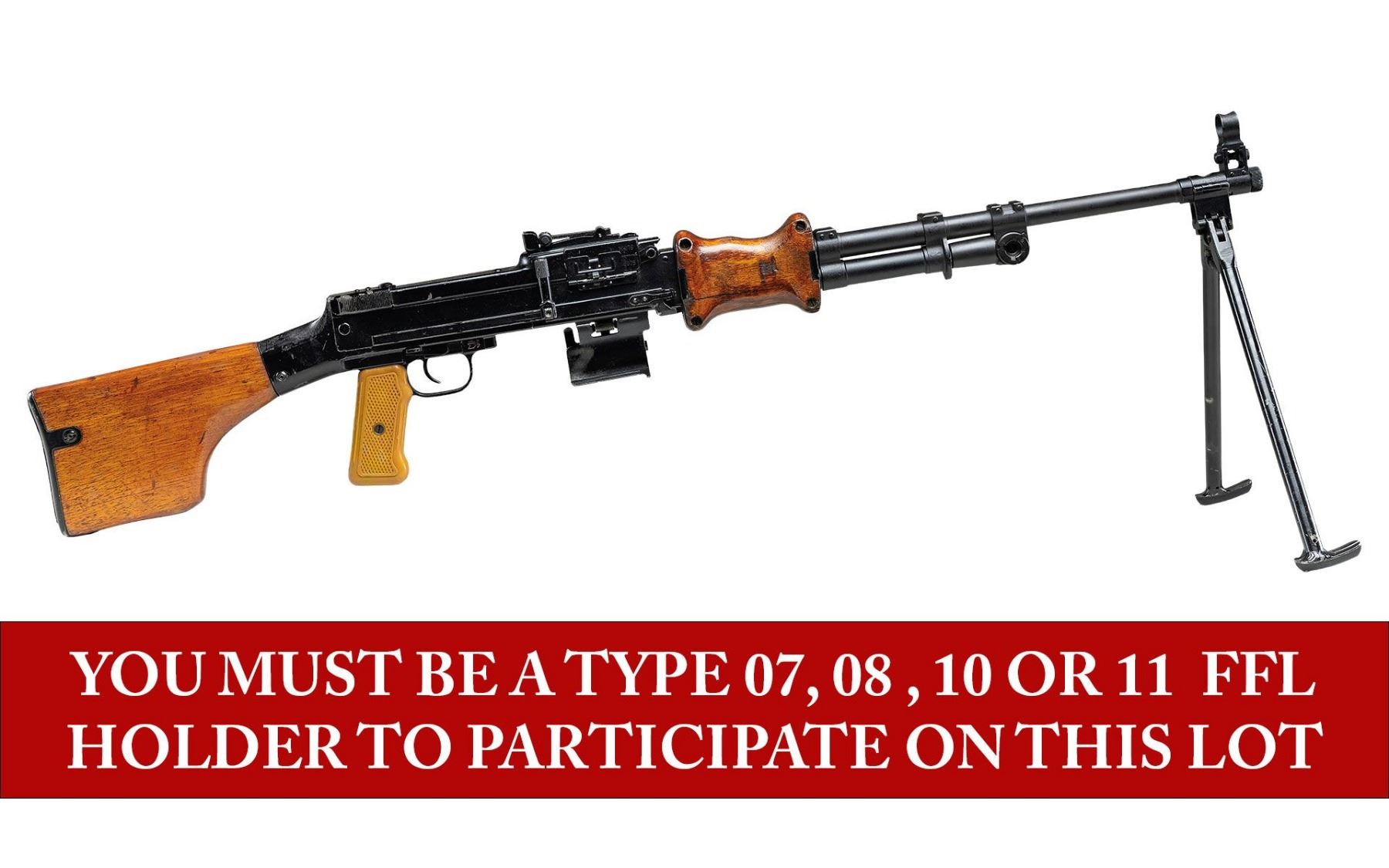 MACHINE GUN. ***BIDDERS INTERESTED IN THIS LOT MUST CURRENTLY HOLD A TYPE 07, 08, 10, OR 11 FFL.*** Cal. 7.62x39. S#2336975. Rear sight graduated to 1000 meters. Top cover marked with a 36 within a triangle. 2 piece hardwood hand guard. Hard wood butt stock with compartmentalized butt plate. Polymer pistol grip. Folding bipod. CONDITION: overall fair with moderate action wear showing light scratches and handling marks with high edge rub., thinning finish on barrel. Furniture shows scattered dings and handling marks with both hand guard panels exhibiting cracks and chips with moderate heavy gouges. Shiny bore with sharp rifling. POST 1986 DEALER SAMPLE MACHINE GUN WITH NO LAW (DEMO) LETTER REQUIRED TO TRANSFER. RESTRICTED REGISTRATION POSSESSION LIMITED TO CONTINUED COMPLIANCE WITH PROVISIONS OF PUBLIC LAW 99-308. IF YOU ARE AN 07, 08, 10, or 11 FFL/SOT YOU MAY TAKE TRANSFER OF THIS FIREARM UPON APPROVAL OF TRANSFER. PROVENANCE: Military Museum Collection of Shooters Outpost, Hooksett NH. THIS ITEM WILL BE AVAILABLE FOR PREVIEW BY APPOINTMENT AT THE SHOOTERS OUTPOST MUSEUM IN HOOKSETT, NH. TO SET UP AN APPOINTMENT, PLEASE CALL 207-453-2114. (50-1832/ZAL). MODERN. CLASS III. $3,500-5,500.