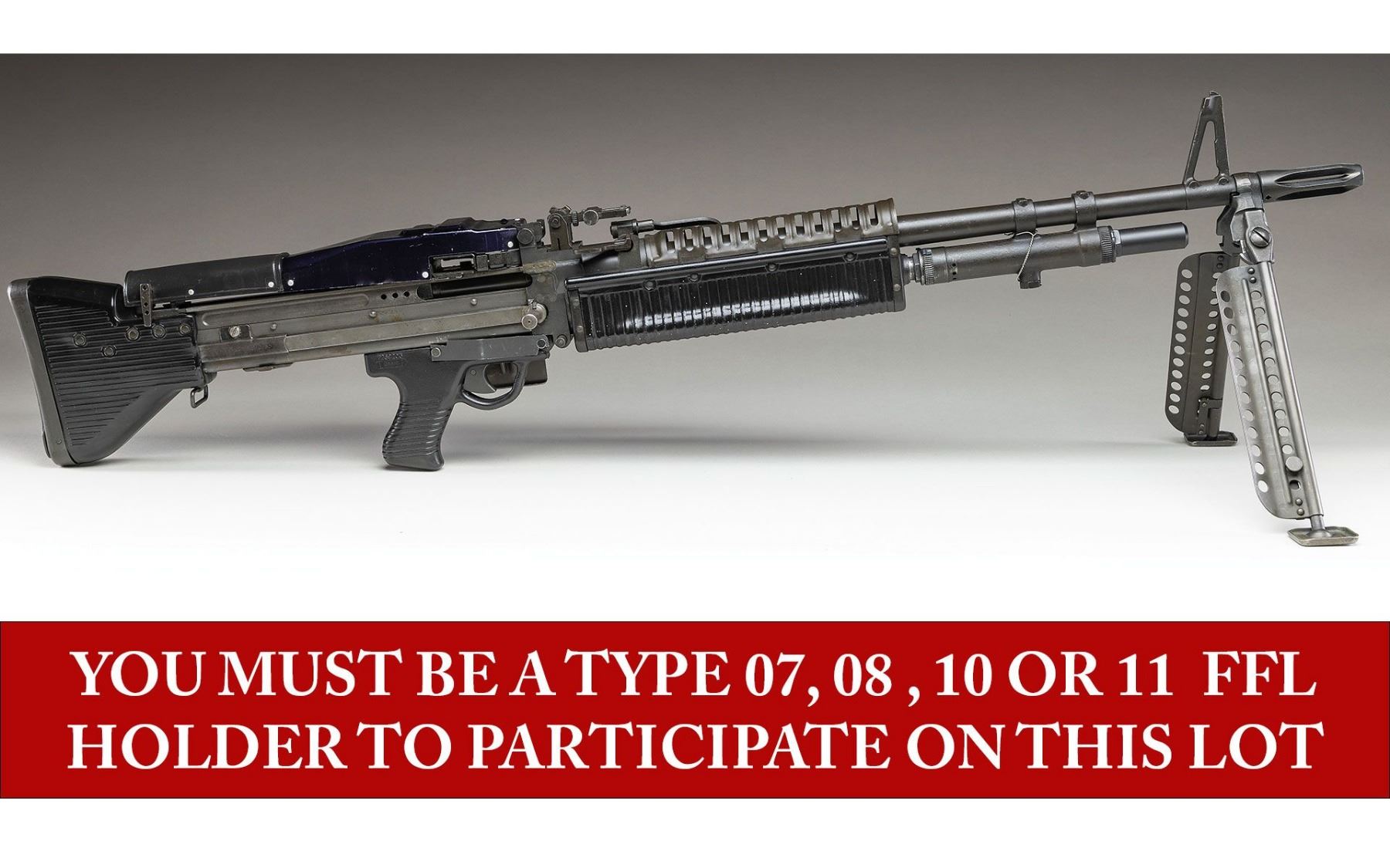 Collecting Class III Weapons can be a very enjoyable and rewarding experience. In the United States, many but not all citizens of the U.S. have the right to purchase and own machine guns. This is true in most states of the United States, but not all states. It is your specific responsibility to determine your right to own and possess a Class III weapon before you bid on it. Once you have bid on a lot and won it, you are responsible for payment of that lot, regardless of whether you can own it or not. If you have purchased a lot and later find out that because of the state you live in or for other reasons that you cannot personally own it yourself, you will still be required to pay for the object and we will obviously have to sell it for you again at a future sale.