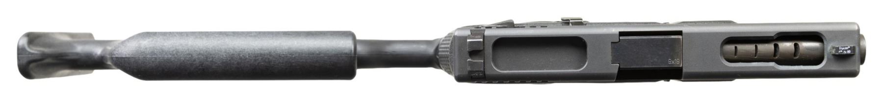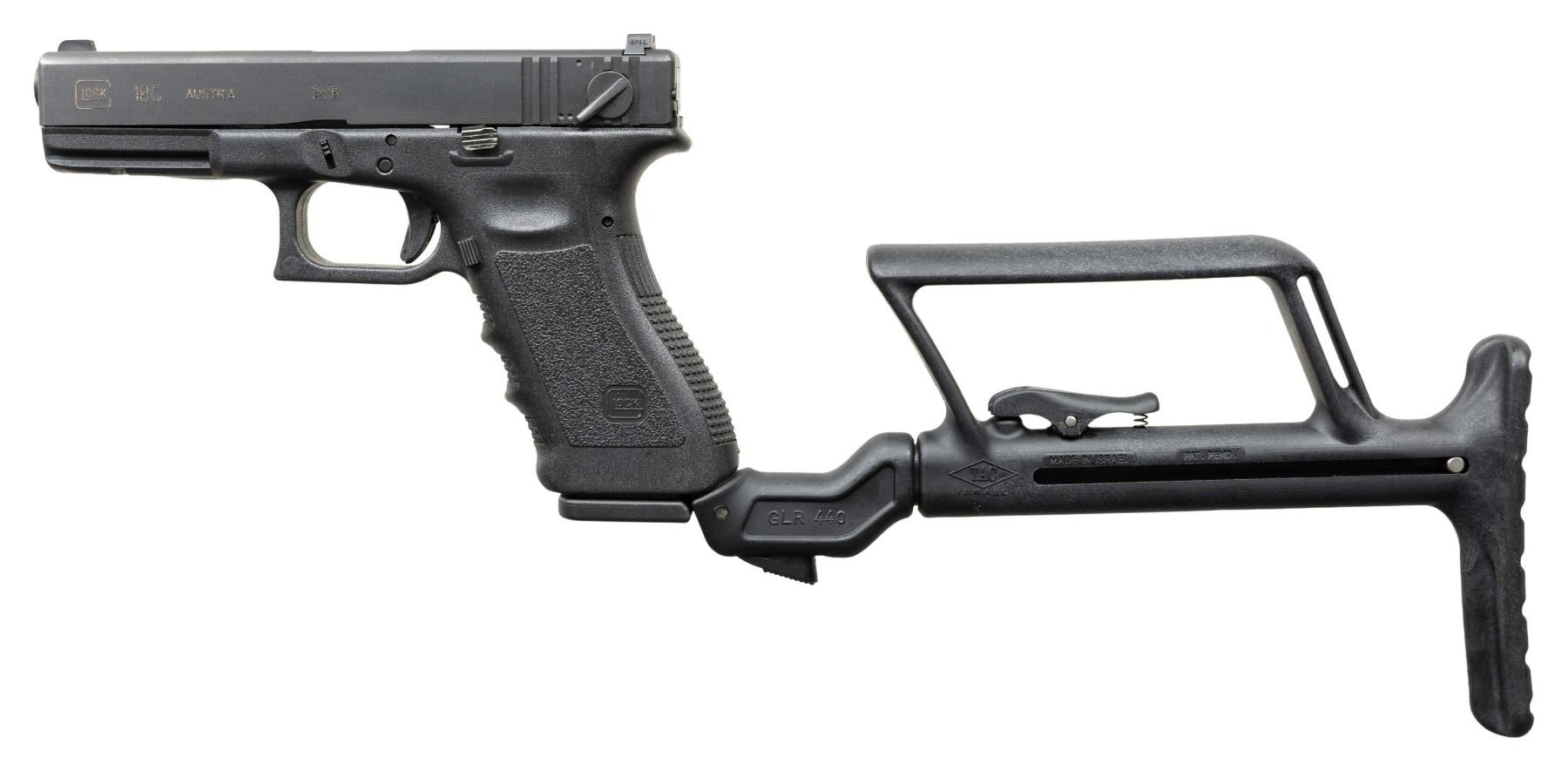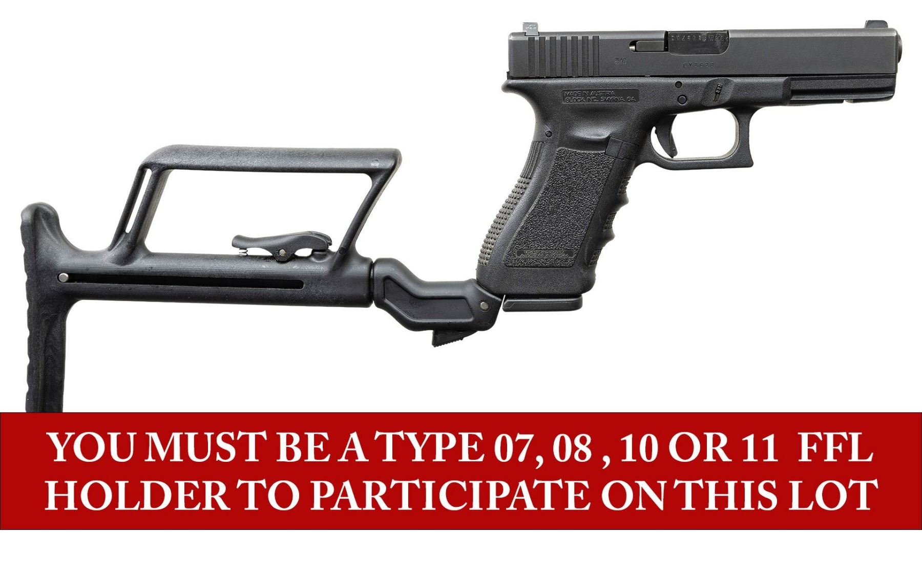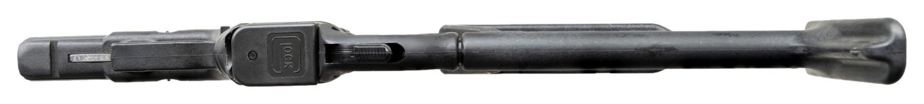 MODEL 18C FULL AUTO WITH TELESCOPIC STOCK. ***BIDDERS INTERESTED IN THIS LOT MUST CURRENTLY HOLD A TYPE 07, 08, 10, OR 11 FFL.*** Cal. 9x19. S#CYZ628US. Bbl 4.5" The fully automatic, legendary "Big Brother" of the popular Glock Model 17. This is not someone's conversion of a Model 17, but a factory, full auto, Glock Model 18. Low light sights. Slide marked "Glock 18C, Austria 9-19" with selector switch. Stippled finger groove. Composite lower. CACLTD Israel DLR 440 Telescopic stock with cheek rest. MAGS: 1-17 round. CONDITION: overall very good with matching numbers showing only a few minor handling marks. Barrel finish remains in protected area. Shiny bore with moderately worn rifling. POST 1986 DEALER SAMPLE MACHINE GUN WITH NO LAW (DEMO) LETTER REQUIRED TO TRANSFER. RESTRICTED REGISTRATION POSSESSION LIMITED TO CONTINUED COMPLIANCE WITH PROVISIONS OF PUBLIC LAW 99-308. IF YOU ARE AN 07, 08, 10, or 11 FFL/SOT YOU MAY TAKE TRANSFER OF THIS FIREARM UPON APPROVAL OF TRANSFER. PROVENANCE: Military Museum Collection of Shooters Outpost, Hooksett NH. THIS ITEM WILL BE AVAILABLE FOR PREVIEW BY APPOINTMENT AT THE SHOOTERS OUTPOST MUSEUM IN HOOKSETT, NH. TO SET UP AN APPOINTMENT, PLEASE CALL 207-453-2114. (50-1834/ZAL). MODERN CLASS III. $6,000-10,000.