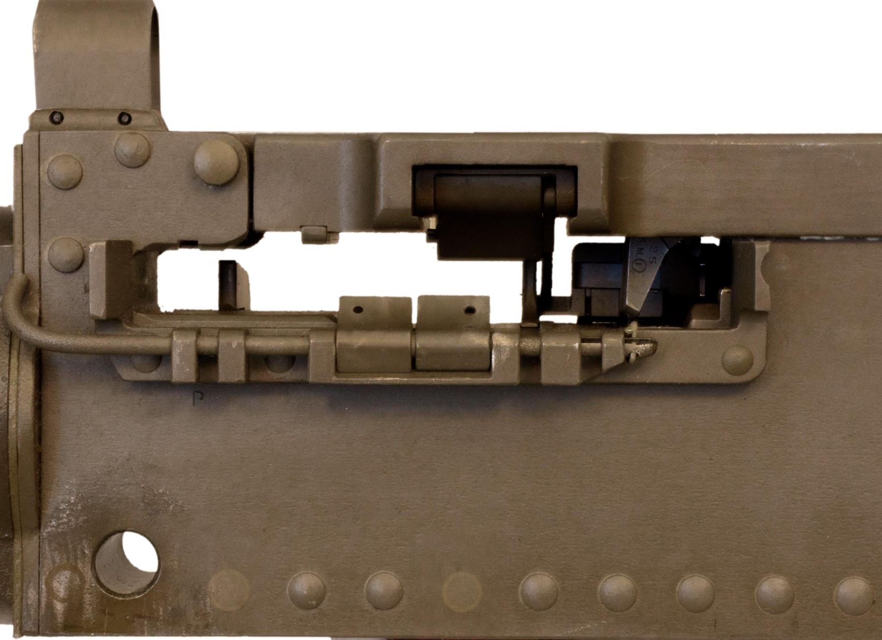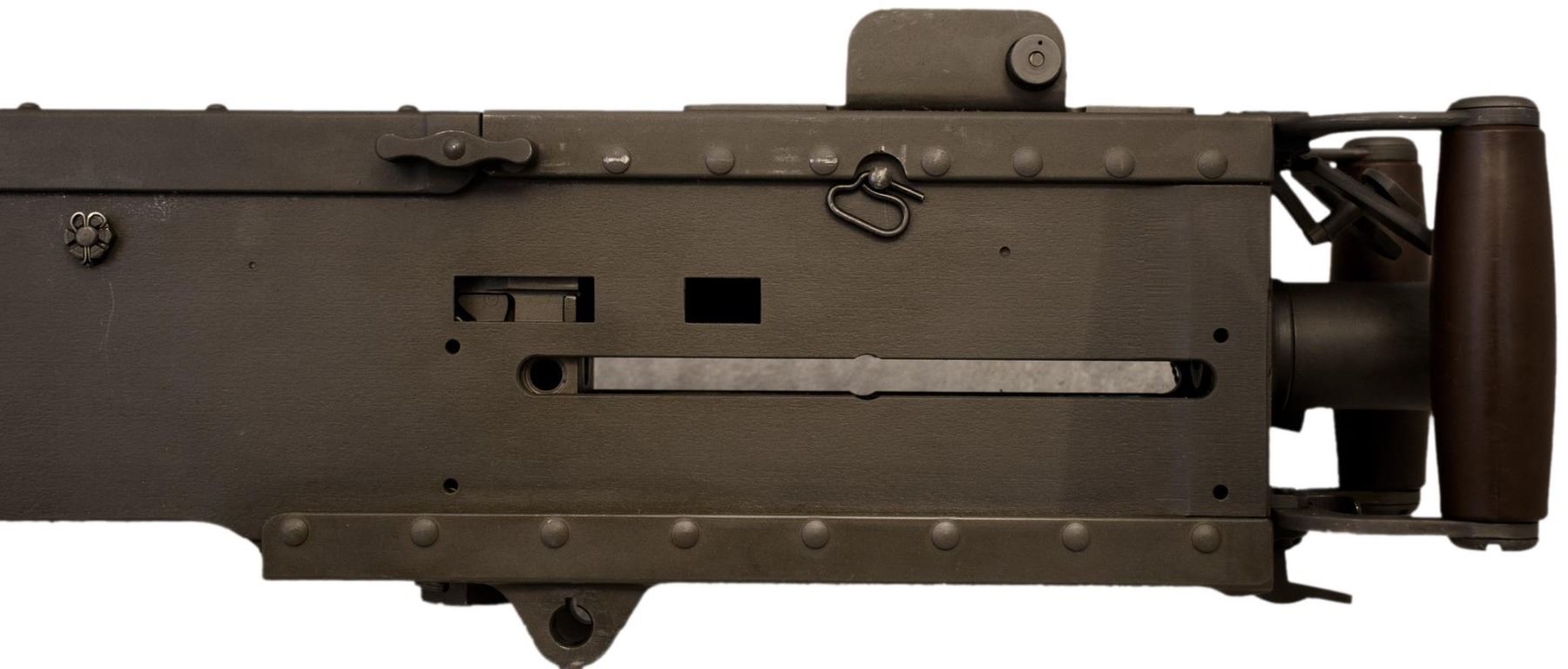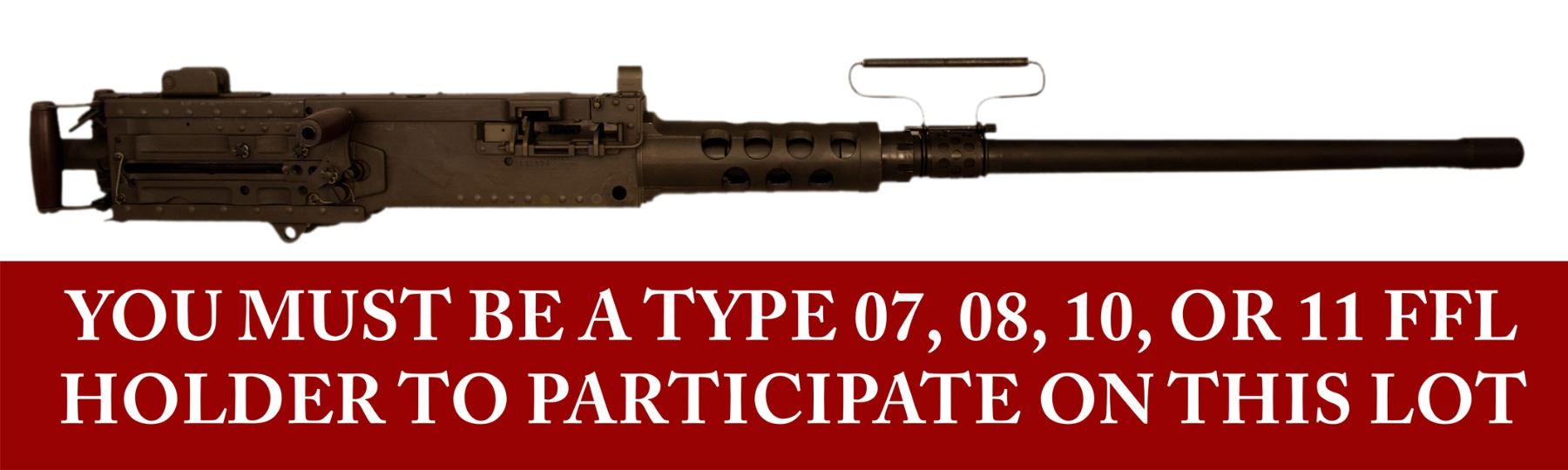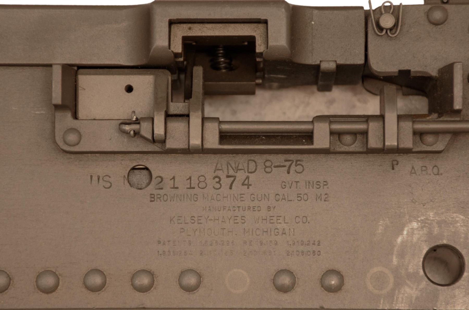 CAL. 50 M2 MANUFACTURED BY KELSEY-HAYES WHEEL CO. IMPORTED BY OOW. ***BIDDERS INTERESTED IN THIS LOT MUST CURRENTLY HOLD AN 07 OR 10 MANUFACTURERS FFL OR AN 08 OR 11 IMPORTERS FFL WITH PAID SOT*** Cal. 50M2. S# 2118374. Bbl. 40". Right plate is marked "Browning Machine Gun Cal. 50 M2 / Manufactured by / KELSEY-HAYES WGEEL CO. / PLYMOUTH, MICHIGAN" & patent markings. Inspector markings A.B.O. above US Ordnance bomb. Also marked "ANAD 8-75" above SN. Also marked & registered by OHIO ORDNANCE WORKS / "CHARDON, OHIO". CONDITION: There is no obvious sign of prior use. Overall very fine original finish. Minty bore in Stellite barrel. POST 1986 DEALER SAMPLE MACHINE GUN WITH NO LAW (DEMO) LETTER REQUIRED TO TRANSFER. RESTRICTED REGISTRATION POSSESSION LIMITED TO CONTINUED COMPLIANCE WITH PROVISIONS OF PUBLIC LAW 99-308. IF YOU ARE AN 07, 08,10 or 11 FFL/SOT YOU MAY TAKE TRANSFER OF THIS FIREARM UPON APPROVAL OF TRANSFER. PROVENANCE: Military Museum Collection of Shooters Outpost, Hooksett NH. THIS ITEM WILL BE AVAILABLE FOR PREVIEW BY APPOINTMENT AT THE SHOOTERS OUTPOST MUSEUM IN HOOKSETT, NH. TO SET UP AN APPOINTMENT, PLEASE CALL 207-453-2114. (50-1939/ZAL). MODERN CLASS III. $22,000-26,000.