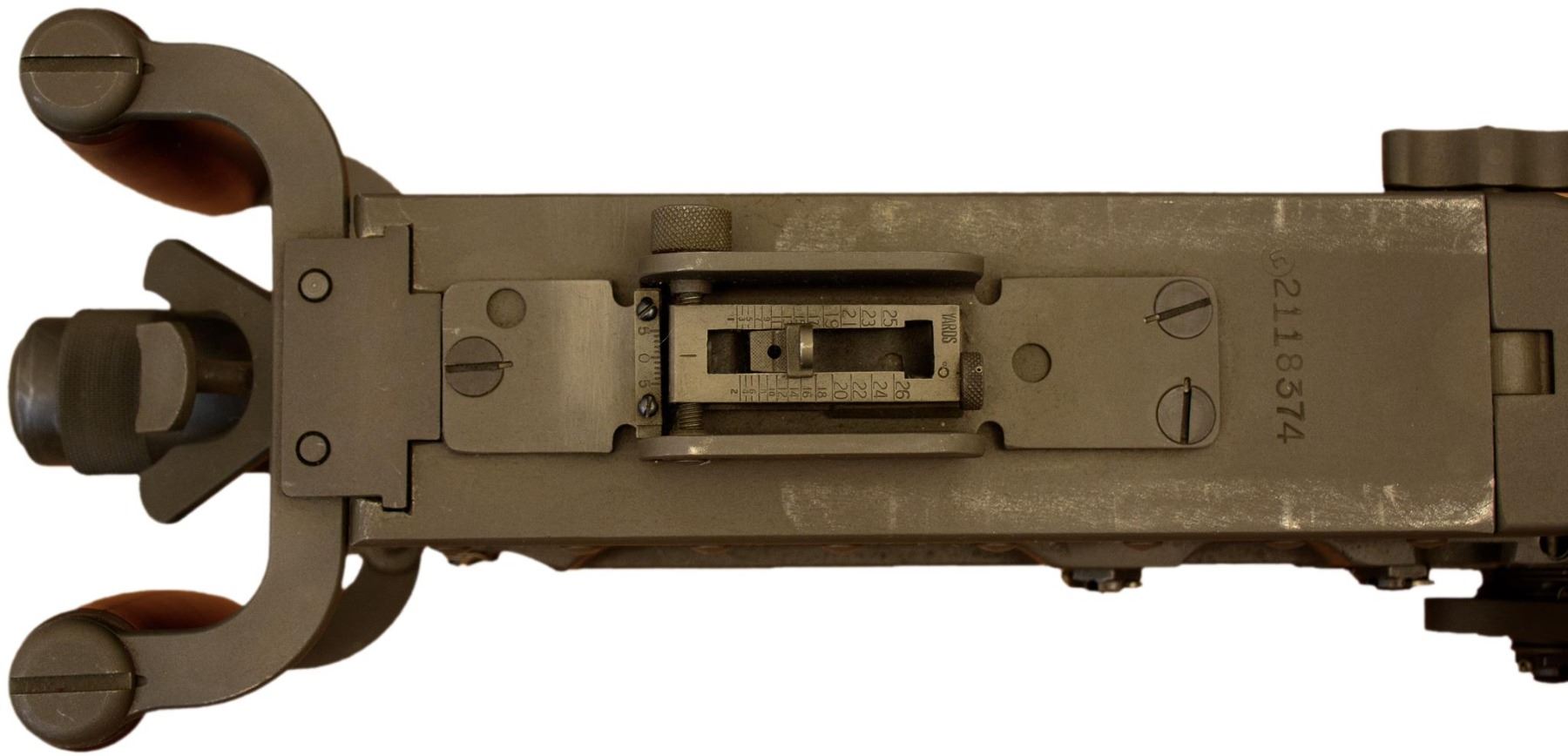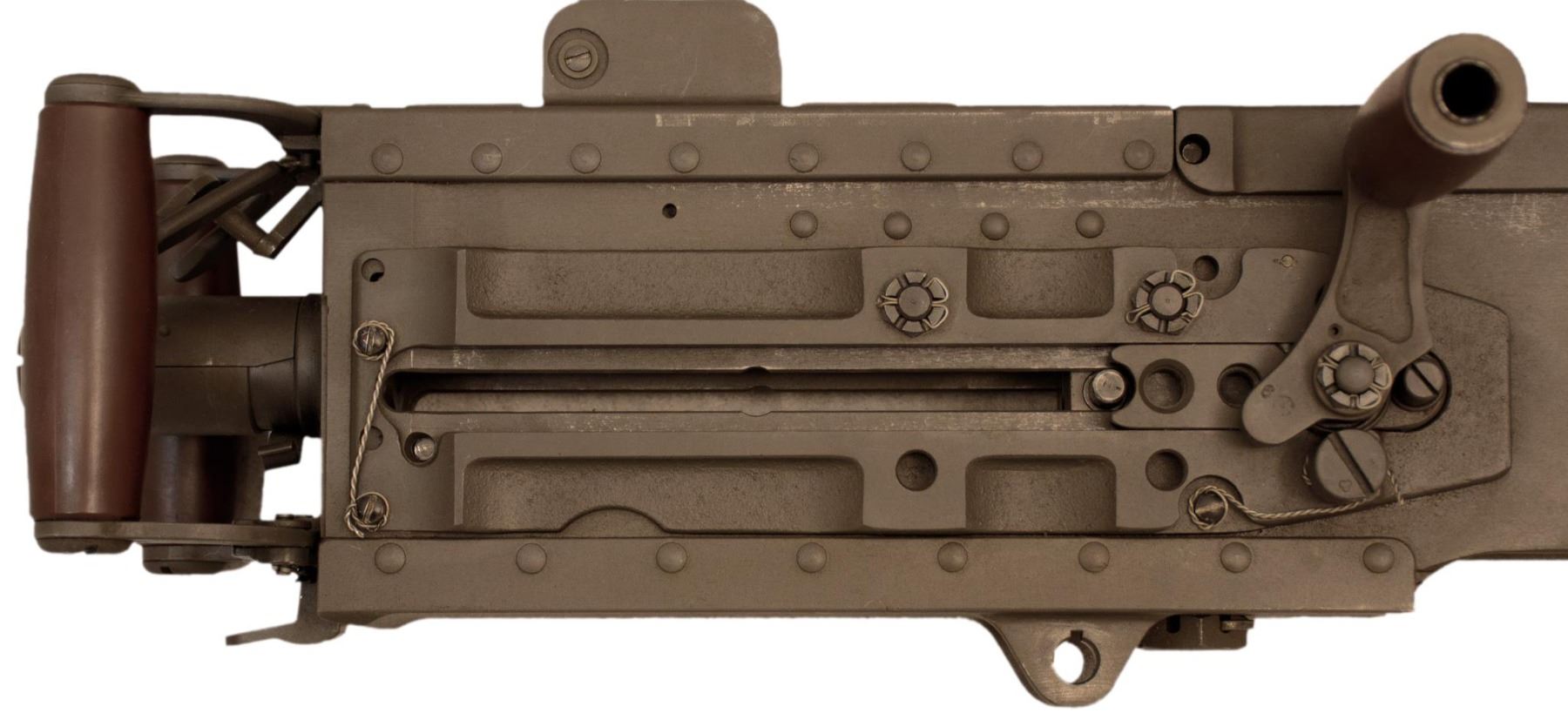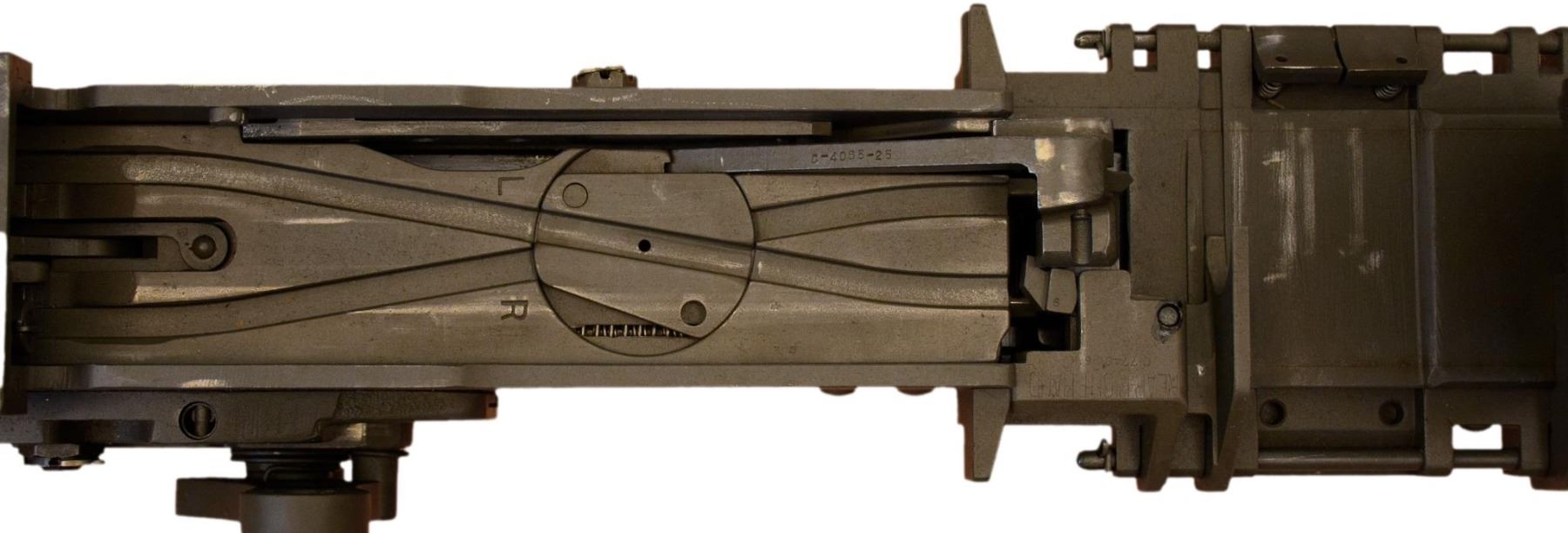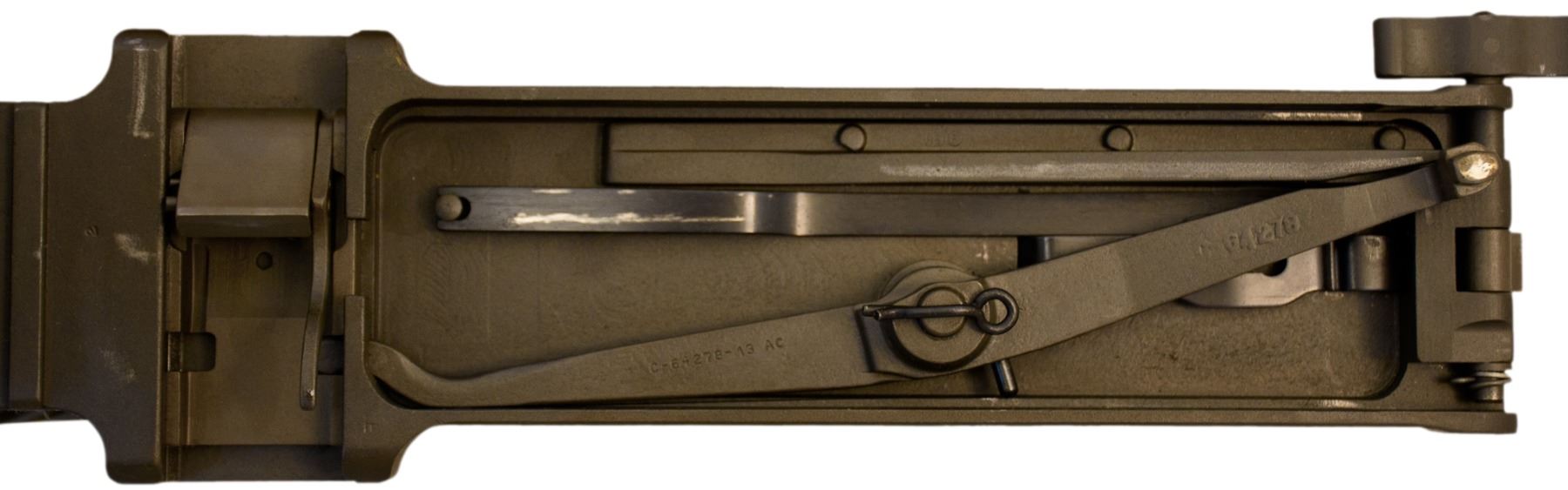 CAL. 50 M2 MANUFACTURED BY KELSEY-HAYES WHEEL CO. IMPORTED BY OOW. ***BIDDERS INTERESTED IN THIS LOT MUST CURRENTLY HOLD AN 07 OR 10 MANUFACTURERS FFL OR AN 08 OR 11 IMPORTERS FFL WITH PAID SOT*** Cal. 50M2. S# 2118374. Bbl. 40". Right plate is marked "Browning Machine Gun Cal. 50 M2 / Manufactured by / KELSEY-HAYES WGEEL CO. / PLYMOUTH, MICHIGAN" & patent markings. Inspector markings A.B.O. above US Ordnance bomb. Also marked "ANAD 8-75" above SN. Also marked & registered by OHIO ORDNANCE WORKS / "CHARDON, OHIO". CONDITION: There is no obvious sign of prior use. Overall very fine original finish. Minty bore in Stellite barrel. POST 1986 DEALER SAMPLE MACHINE GUN WITH NO LAW (DEMO) LETTER REQUIRED TO TRANSFER. RESTRICTED REGISTRATION POSSESSION LIMITED TO CONTINUED COMPLIANCE WITH PROVISIONS OF PUBLIC LAW 99-308. IF YOU ARE AN 07, 08,10 or 11 FFL/SOT YOU MAY TAKE TRANSFER OF THIS FIREARM UPON APPROVAL OF TRANSFER. PROVENANCE: Military Museum Collection of Shooters Outpost, Hooksett NH. THIS ITEM WILL BE AVAILABLE FOR PREVIEW BY APPOINTMENT AT THE SHOOTERS OUTPOST MUSEUM IN HOOKSETT, NH. TO SET UP AN APPOINTMENT, PLEASE CALL 207-453-2114. (50-1939/ZAL). MODERN CLASS III. $22,000-26,000.