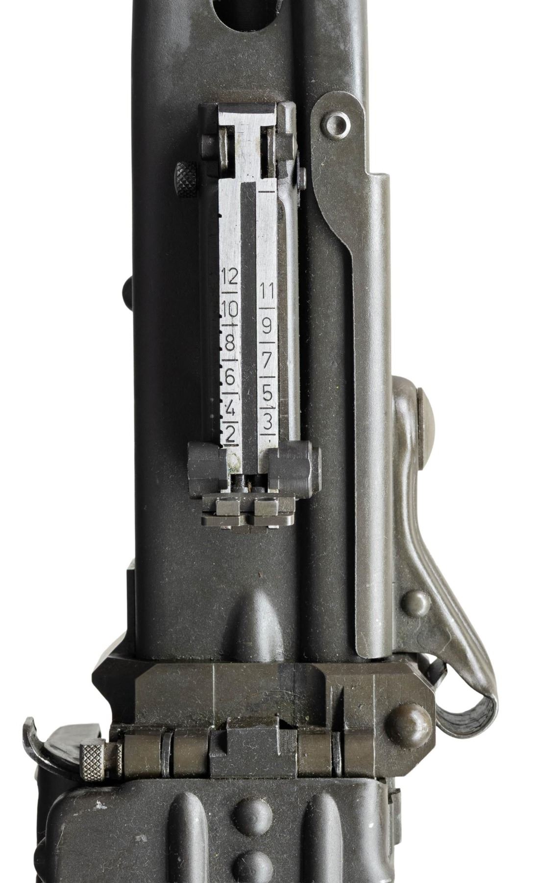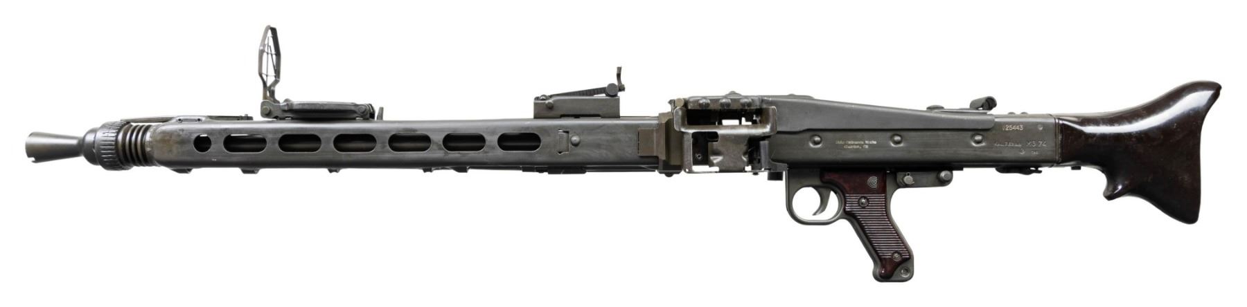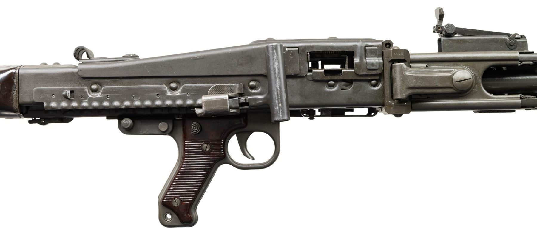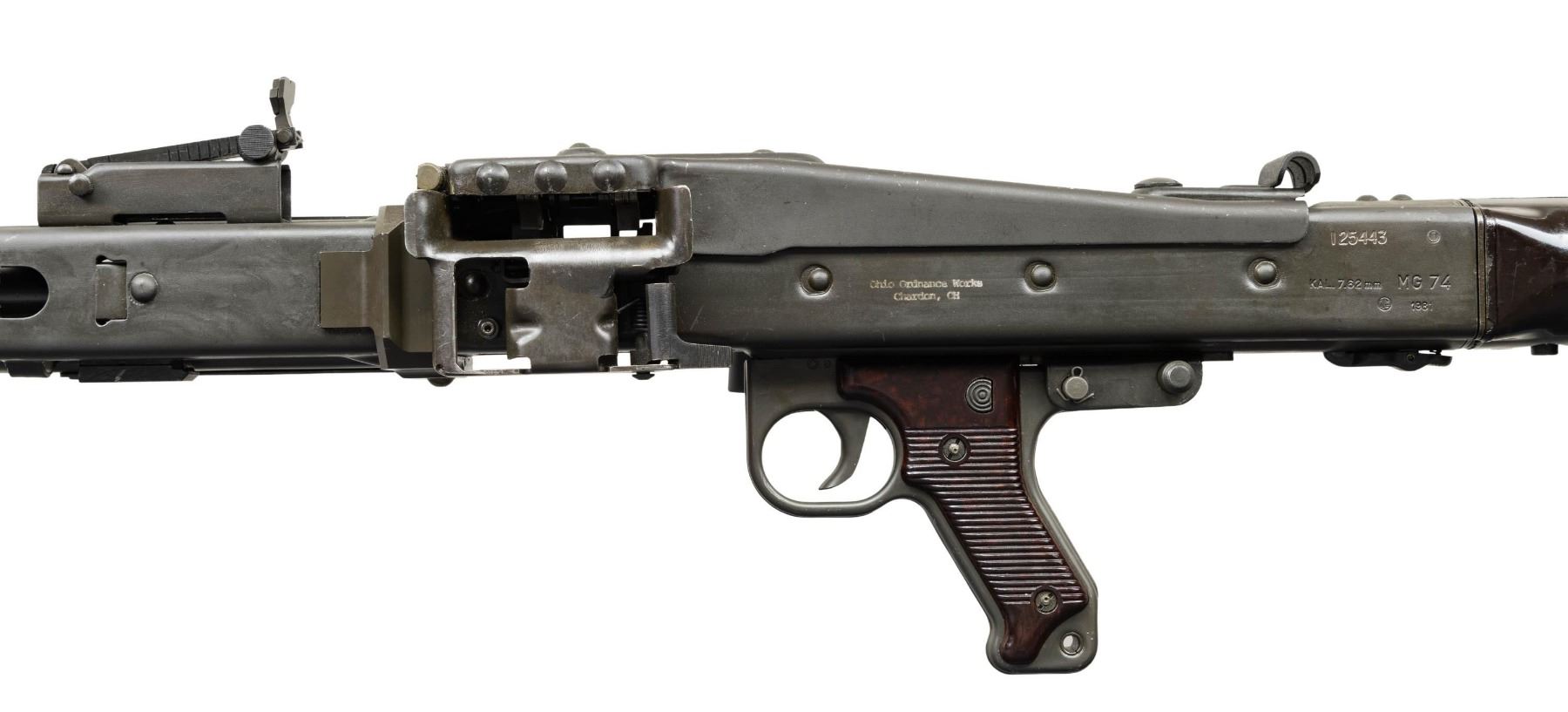 FULL AUTO BELT FED MACHINE GUN. ***BIDDERS INTERESTED IN THIS LOT MUST CURRENTLY HOLD A TYPE 07, 08, 10, OR 11 FFL.*** Cal 7.62mm (7.62x51). S# 125443. Bbl 26" over flash hider. Left side of receiver is engraved with the Ohio Ordinance Works markings. Serial number/Cal marking. MG74/1981 manufacture date. Rear sight is graduated through 1200 meters. Forward sight is a foldable anti-aircraft sight with protective cover. Bakelite butt stock and grip. CONDITION: overall very fine with only few minor blemishes and handling marks. Buttstock is very good with some minor chipping where it attaches to the receiver. Mechanically sound when cycled by hand. Overall very good bright shiny bore with good rifling. POST 1986 DEALER SAMPLE MACHINE GUN WITH NO LAW (DEMO) LETTER REQUIRED TO TRANSFER. RESTRICTED REGISTRATION POSSESSION LIMITED TO CONTINUED COMPLIANCE WITH PROVISIONS OF PUBLIC LAW 99-308. IF YOU ARE AN 07, 08, 10, or 11 FFL/SOT YOU MAY TAKE TRANSFER OF THIS FIREARM UPON APPROVAL OF TRANSFER. PROVENANCE: Military Museum Collection of Shooters Outpost, Hooksett NH. THIS ITEM WILL BE AVAILABLE FOR PREVIEW BY APPOINTMENT AT THE SHOOTERS OUTPOST MUSEUM IN HOOKSETT, NH. TO SET UP AN APPOINTMENT, PLEASE CALL 207-453-2114. (50-1918/ZAL). MODERN CLASS III. $12,000-18,000.
