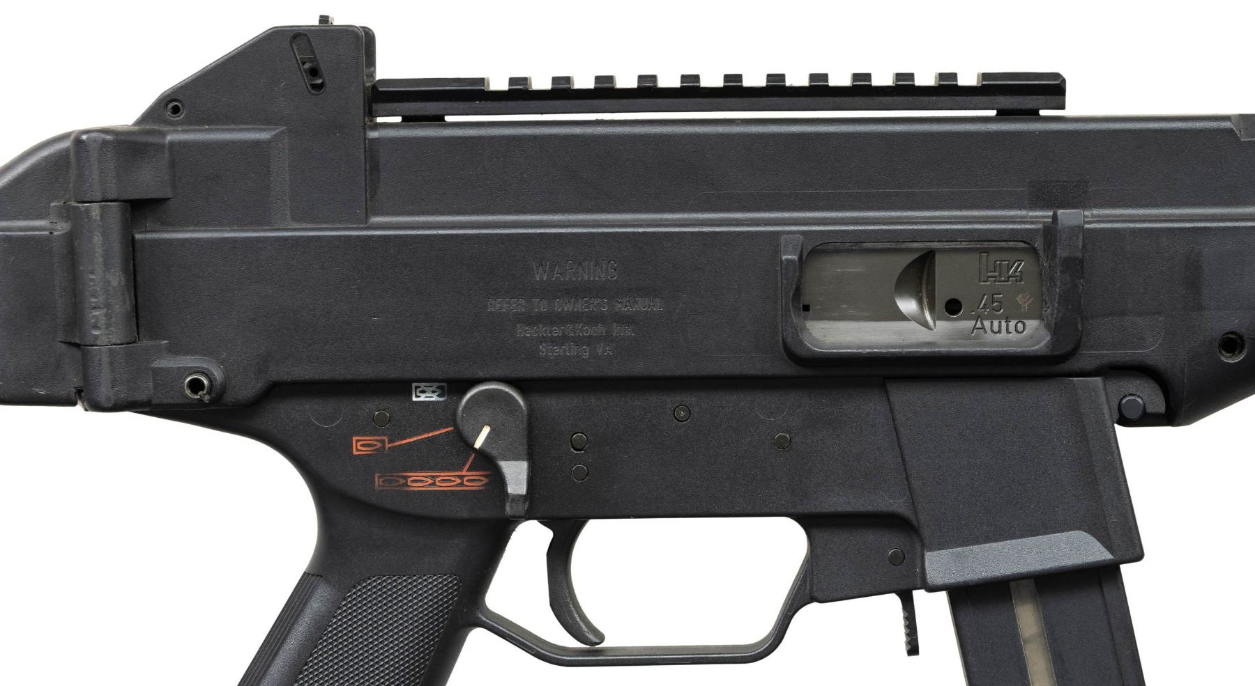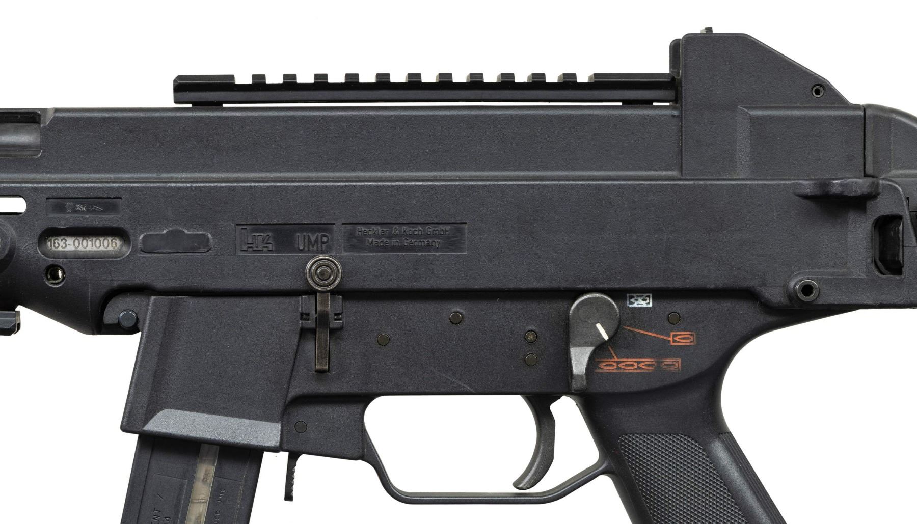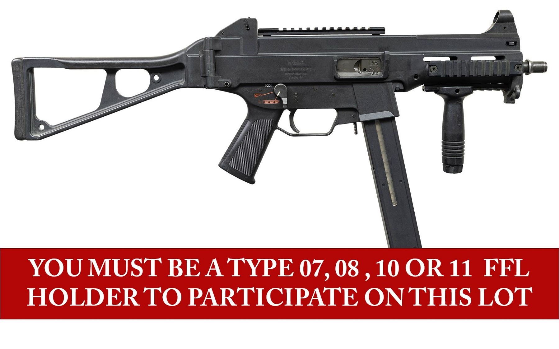 GUN. ***BIDDERS INTERESTED IN THIS LOT MUST CURRENTLY HOLD A TYPE 07, 08, 10, OR 11 FFL.*** Cal 45 ACP. S# 163-001006. Bbl 8". Here is an opportunity to transfer in the modern successor to the iconic HK MP5 submachine gun. Left side is marked "Eagle-N HK Antler Proof, Made in Germany". Right side is marked "Heckler & Koch. Sterling VA". Folding stock. Knights Armament vertical foregrip. MAGS: 1-25 rd. CONDITION: overall very good with some scuffing and handling marks. There is bulge at the midpoint of the barrel. Bore has some pitting and wear to the rifling. POST 1986 DEALER SAMPLE MACHINE GUN WITH NO LAW (DEMO) LETTER REQUIRED TO TRANSFER. RESTRICTED REGISTRATION POSSESSION LIMITED TO CONTINUED COMPLIANCE WITH PROVISIONS OF PUBLIC LAW 99-308. IF YOU ARE AN 07, 08, 10, or 11 FFL/SOT YOU MAY TAKE TRANSFER OF THIS FIREARM UPON APPROVAL OF TRANSFER. PROVENANCE: Military Museum Collection of Shooters Outpost, Hooksett NH. THIS ITEM WILL BE AVAILABLE FOR PREVIEW BY APPOINTMENT AT THE SHOOTERS OUTPOST MUSEUM IN HOOKSETT, NH. TO SET UP AN APPOINTMENT, PLEASE CALL 207-453-2114. (50-1868/ZAL). MODERN CLASS III. $2,500-5,500.