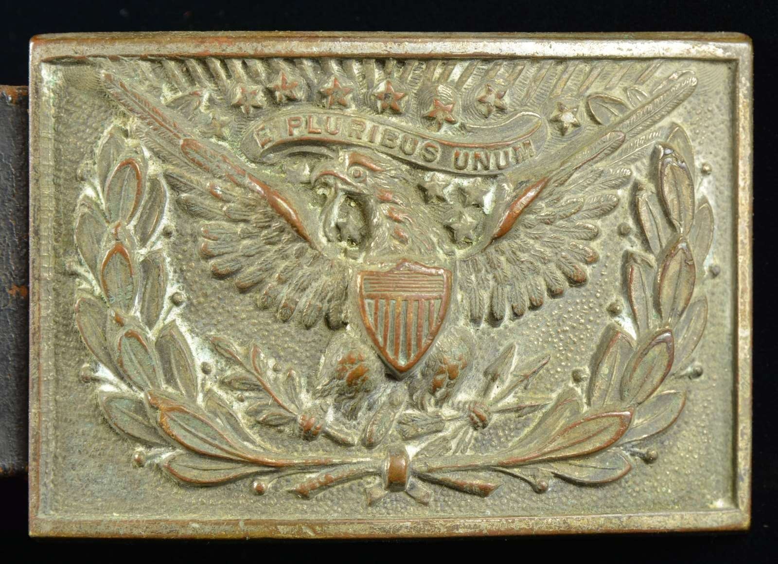 An enlisted grade belt plate of standard M1851 design. Reverse has a brass bar and very wide tongue. Buckle has been mounted to a non-standard replacement leather belt. CONDITINON: buckle shows light wear. Belt shows moderate wear and is a bit stiff. (02-18108/BF). $75-125.