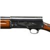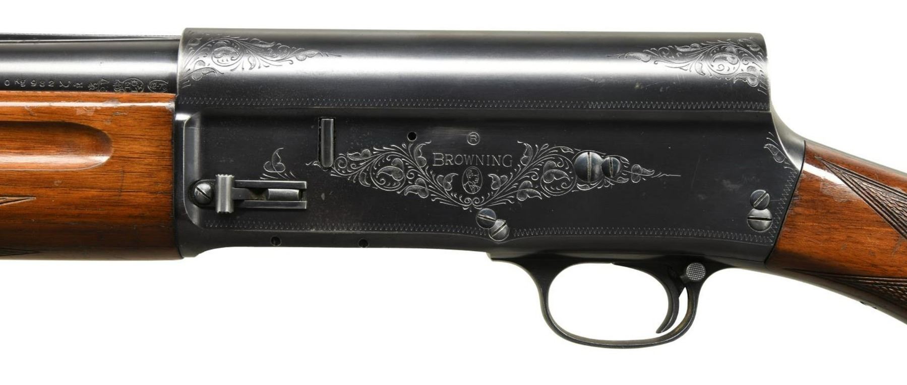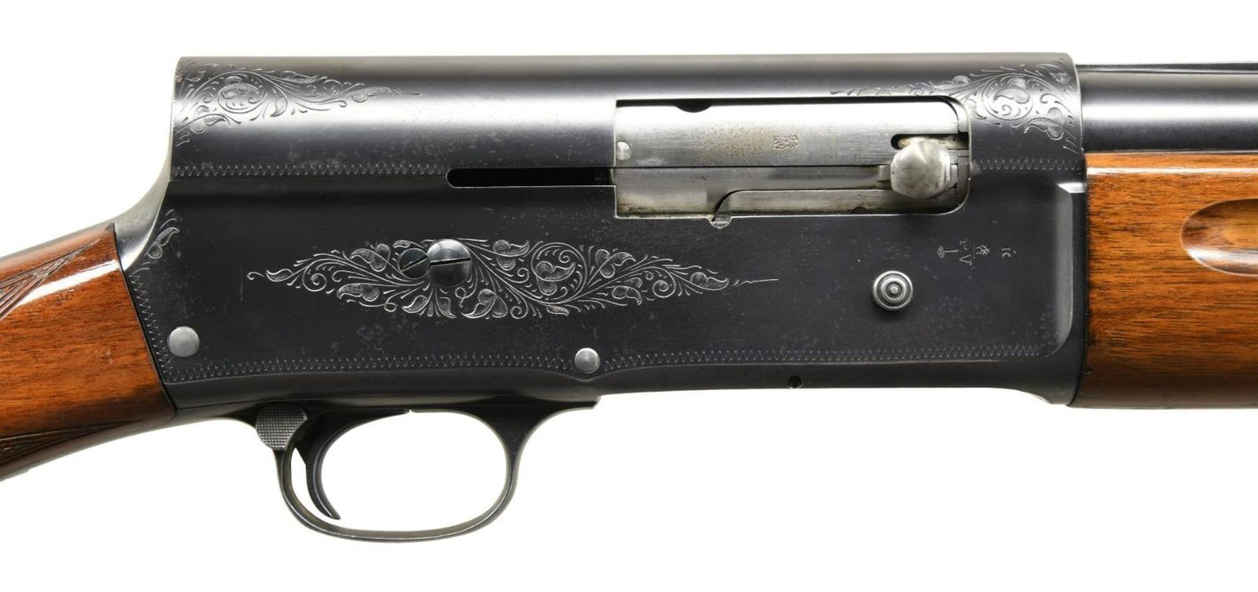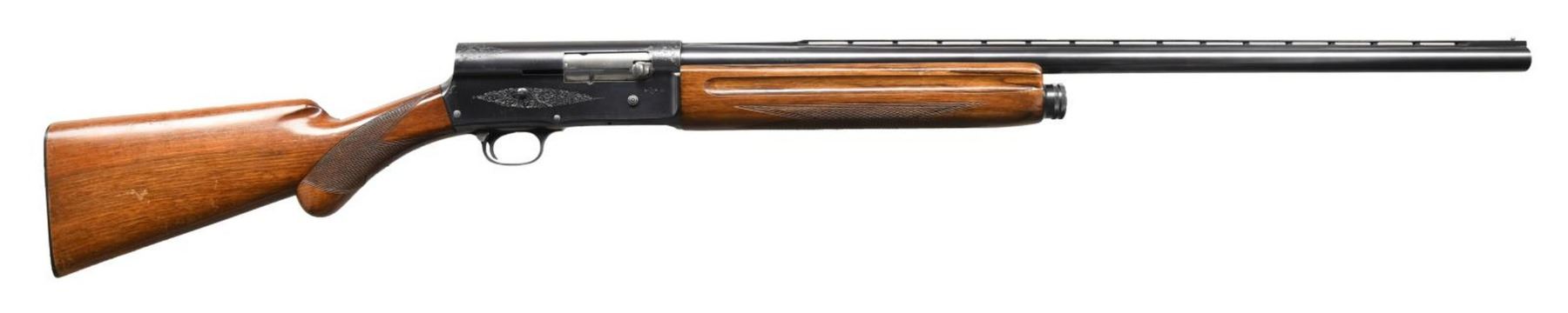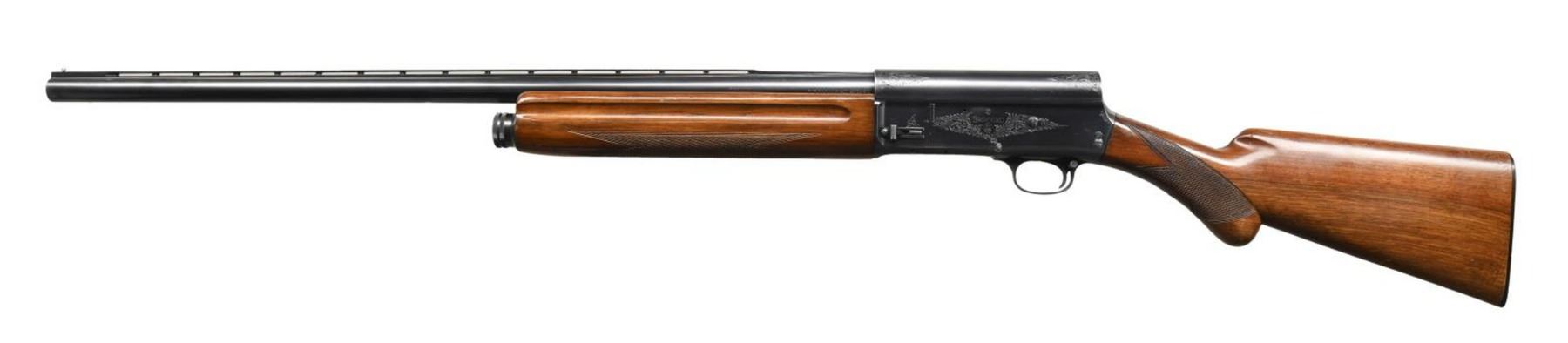 SHOTGUN. Cal. 12 GA. S# 365134. Bbl 27 5/8". A5 semi-automatic shotgun manufactured by Fabrique Nationale and imported by Browning Arms Company of St. Louis, MO. The left side of the bbl. is marked with Browning's importer information, with "MADE IN BELGIUM" on the right. Left and right sides of receiver exhibit light floral pattern engraving, with wavy line accents. Belgian proofs are present on the receiver, bolt, and bbl. Metal components exhibit a blued finish. Checkered wood round knob buttstock, with checkered wood forend. Knurled vent rib with aluminum bead front sight. CONDITION: metal components retain the majority of their original factory blue finish, exhibiting some areas of mild wear and thinning that show through to gray and brown patinas, as well as areas of moderate freckling overall. Mirror bore. Wood furniture shows scattered marks and some small impressions from storage and handling, but otherwise remains sturdy and serviceable. PROVENANCE: The Collection of Gun Sport Ltd owned by Jon R. Thomas. (23-3707/MLW). CURIO. $500-700.