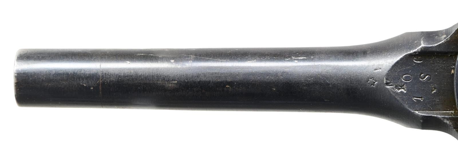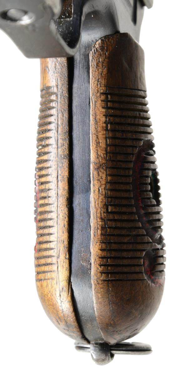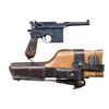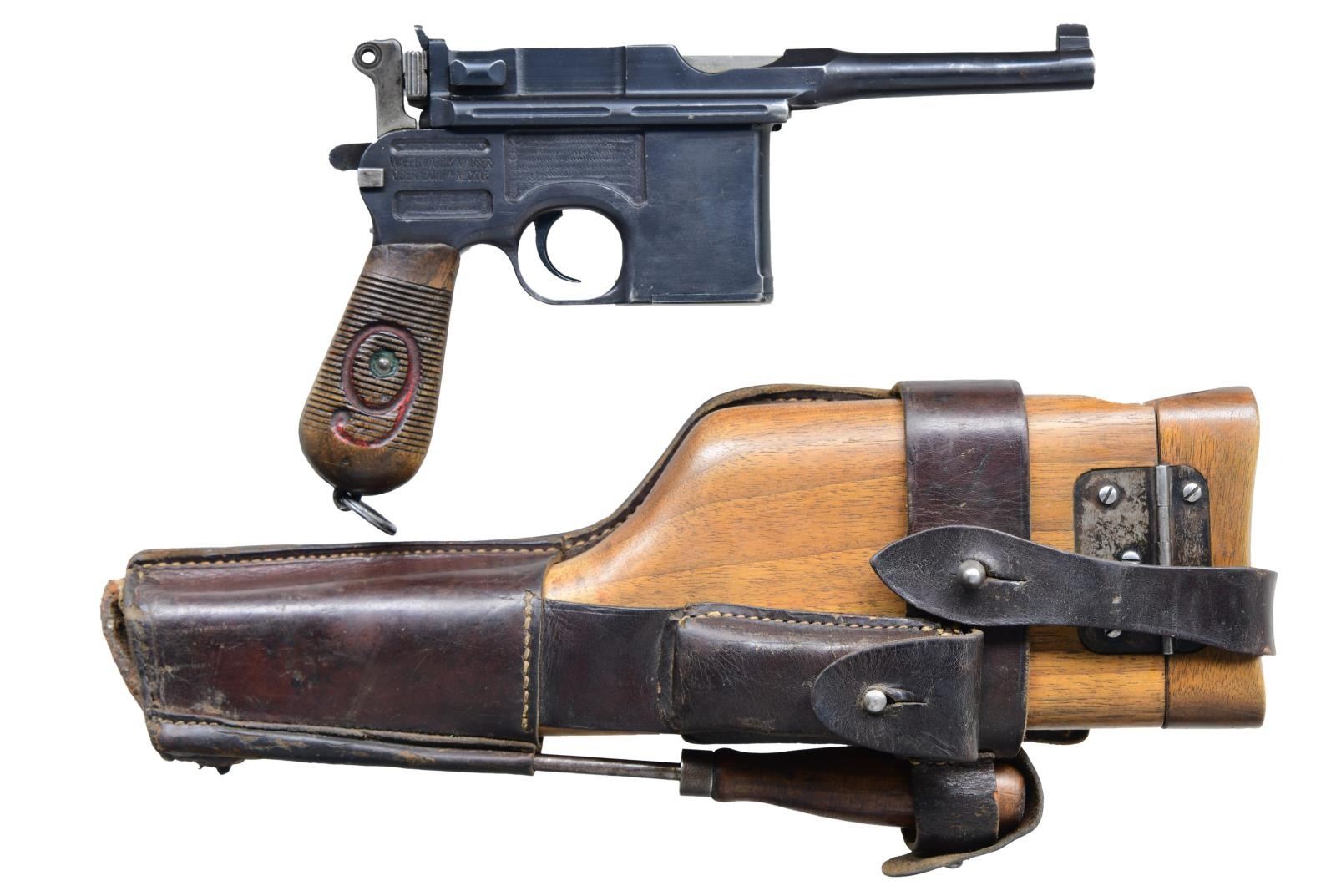 PISTOL WITH STOCK & HARNESS. Cal. 9x19mm Parabellum. S# 69274. Bbl. 4". Originally mfg. by Mauser as a standard-configuration C96 "Red 9" semi-automatic pistol, this example was retained and subsequently converted to be in accordance with the Treaty of Versailles. Arsenal modifications include the shortening of the bbl. and the replacement of the rear tangent sight with a fixed "V" notch sight. The top flat of the faceted breech is stamped "1920" next to Mauser's mfg. information, with the S# marked on the left quarter flat, a double crown "U" proof marked on the left flat, and an Imperial German military acceptance proof stamped on the right flat. Right side of the frame is marked with Mauser's mfg. information. Metal components exhibit a reapplied blue finish, which was likely applied at the time of reworking. Frame is mounted with 2-piece grooved wood red "9" grips. All numbers are matching and include the frame, floorplate, lock frame, sear, hammer, bbl./bbl. extension, bolt, bolt stop, as well as the grips. UNATTACHED ACCESSORIES: non-matching shoulder stock with a brown leather harness marked "C. HOLSTE&Co./ MUNCHEN/ 1917" on the rear, containing a cleaning rod and spare follower spring. CONDITION: metal components retain the majority of their arsenal reapplied blue finish, exhibiting some wear and thinning that shows through to gray patina, with some scattered handling marks overall. Bolt and hammer exhibit spots of age-related discoloration. Bright bore, exhibiting light pitting and retaining good rifling throughout. Grips exhibit some scattered marks and impressions from handling and storage overall. Stock shows scattered marks and minor impressions from handling and storage, with some wear to the varnish overall. Harness exhibits wear with age-related cracking and crazing overall, with a hole present at the stock lug area and some losses to the stitching at the toe. PROVENANCE: the collection of Curtis H. Halvorson. (23-5815/MLW). CURIO. $1,500-2,200.