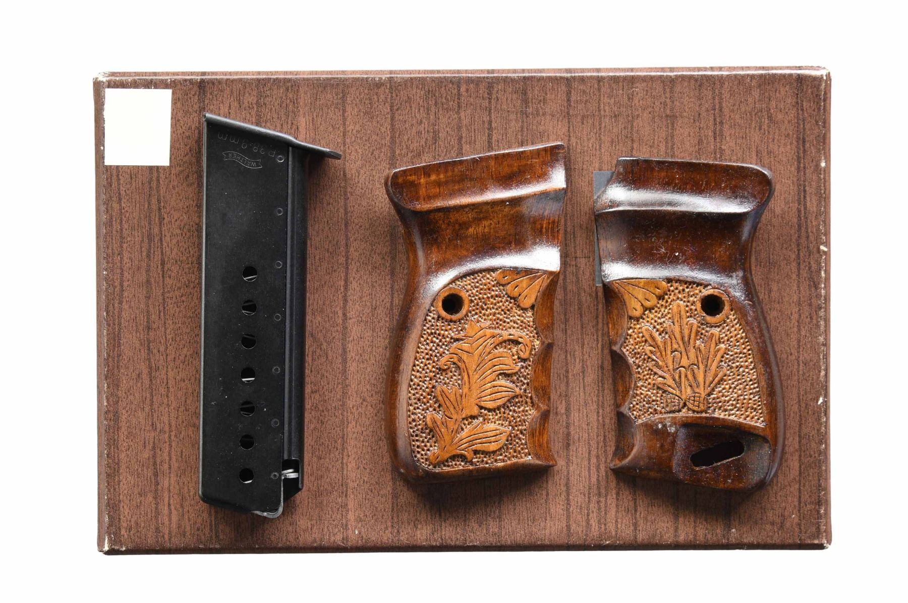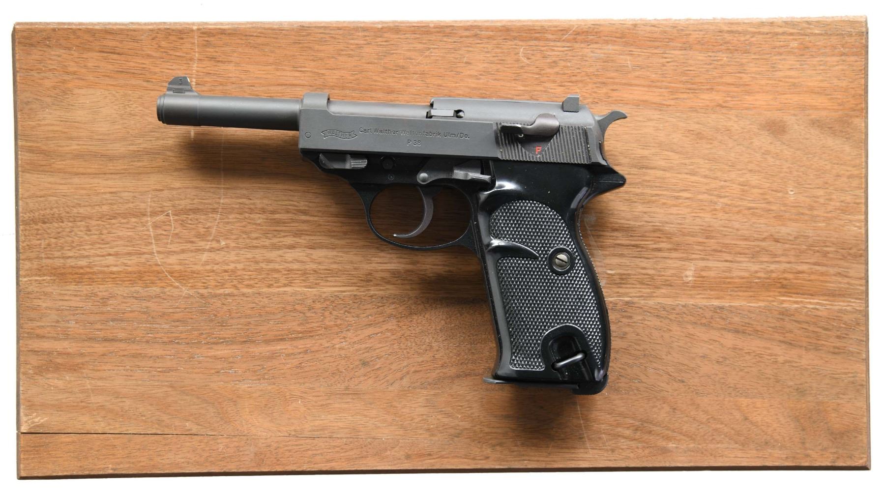 MATCHING FACTORY BOX, PAPER TEST TARGET, & ACCESSORIES. Cal. 9x19mm Parabellum. S# 472471. Bbl. 5". P.38 semi-automatic pistol, mfg. in Germany by Walther in 1992. Left side of the slide is marked with the Walther banner logo, followed by Walther's mfg. information, above "P 38", with the S# and "MADE IN GERMANY" stamped on the right. Right side of the frame is marked with an Eagle/N commercial nitro proof, followed by a "KC" (92) date code, and an Ulm Proof House antler. Aluminum frame exhibits a black/blue anodized finish, with steel components exhibiting a parkerized finish overall. Frame is mounted with 2-piece checkered black plastic grips. White dot blade front sight with wide U-notch rear sight. MAGS: two 8-rd. UNATTACHED ACCESSORIES: display case, as well as a matching factory box containing one spare mag., a set of wood oak leaf pattern grips, cleaning rod, manual, as well as a matching factory paper test target. CONDITION: fine, with metal components retaining virtually all of their original factory finishes overall, save for a few light superficial handling marks. Brilliant mirror bore, exhibiting well-defined rifling throughout. Grips are excellent. Box shows mild exterior wear but otherwise remains very good overall. (24-1304). MODERN. $1,400-1,600.