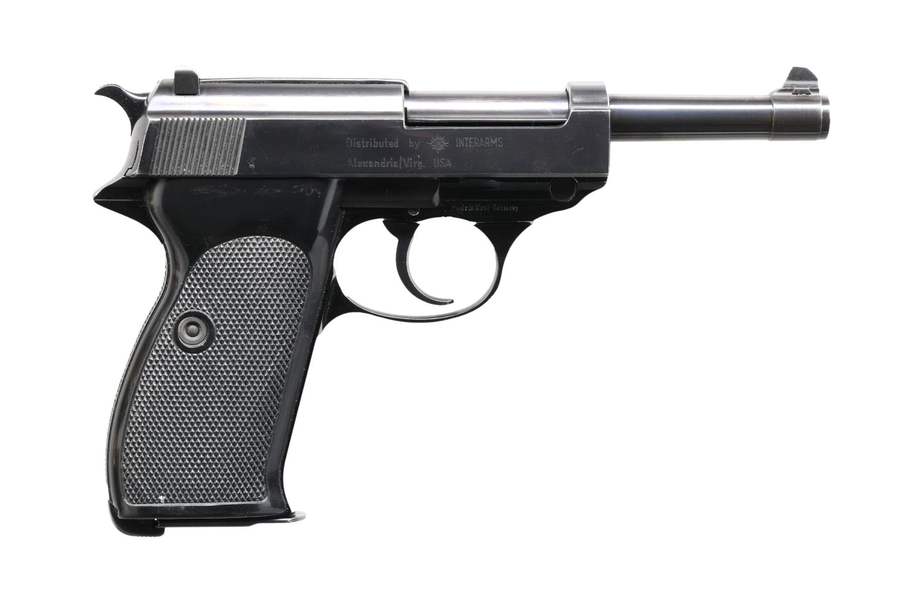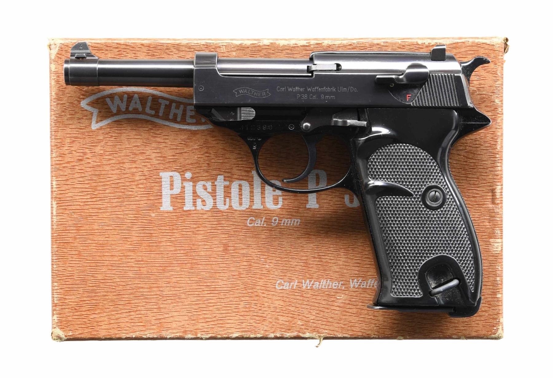 MATCHING FACTORY BOX & PAPER TEST TARGET. Cal. 9x19mm Parabellum. S# 312390. Bbl. 5". P.38 semi-automatic pistol, mfg. in West Germany by Walther and imported by Interarms in 1968. Left side of the slide is marked with the Walther banner logo, followed by Walther's mfg. information above the model and cal. designations, with Interarms' importer information marked on the right. Left side of the frame is marked with the S# above a "68" date code, Ulm Proof House antler, as well as an Eagle/N commercial nitro proof. Aluminum frame exhibits a black finish, with steel components exhibiting a high polish blue finish overall. Frame is mounted with 2-piece checkered black plastic grips. Matching numbers are present on the frame and bbl. Slide and locking block are unnumbered. MAGS: two 8-rd. UNATTACHED ACCESSORIES: matching factory wood grain box containing one spare mag., a cleaning rod, manual, as well as a matching factory paper test target. CONDITION: metal components retain bountiful amounts of their original factory finishes, exhibiting some very light edge wear, with some light superficial handling marks present overall. Mirror bore, exhibiting well-defined rifling throughout. Grips are very good, showing some smoothing and a few scattered nicks. Box exhibits mostly cosmetic wear from handling and storage, with a tear present at one corner of the lid. (24-1308/MLW). CURIO. $800-1,200.