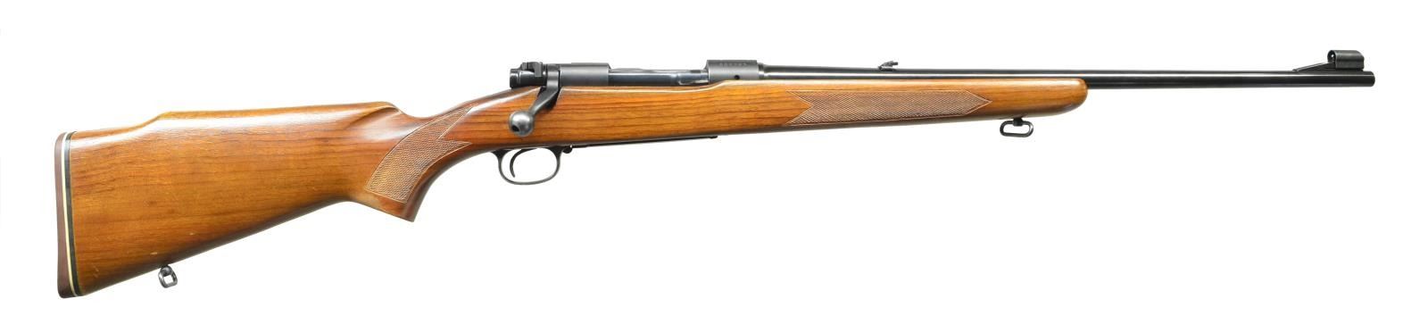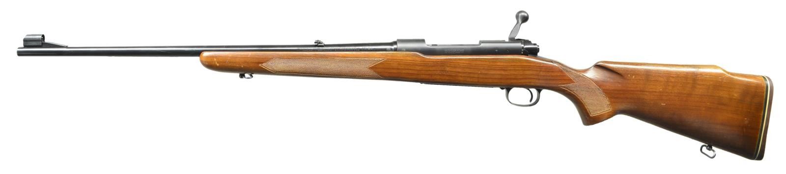 Cal. 270 Win. S#558283. Standard configuration w/ 22" featherweight bbl. fitted w/ folding rear & bead front sights has Winchester info on left side toward action. Late style Model 70 action has alloy floorplate. Pistol grip walnut Monte Carlo stock is fitted w/ "Whiteline" rifle pad. Grip & forend are hand checkered & sling loops are installed. CONDITION: very fine. Metal parts retaining about 95% original blue w/ some operation wear, silvering on bolt handle & at front part of floorplate. Stock is very fine w/ some minor scratches & lifting of finish at top of comb. Bright, shiny bore. Mechanically good. (22-1837/MGM). CURIO. $1,000-1,500.