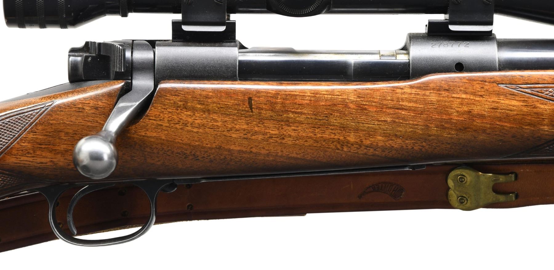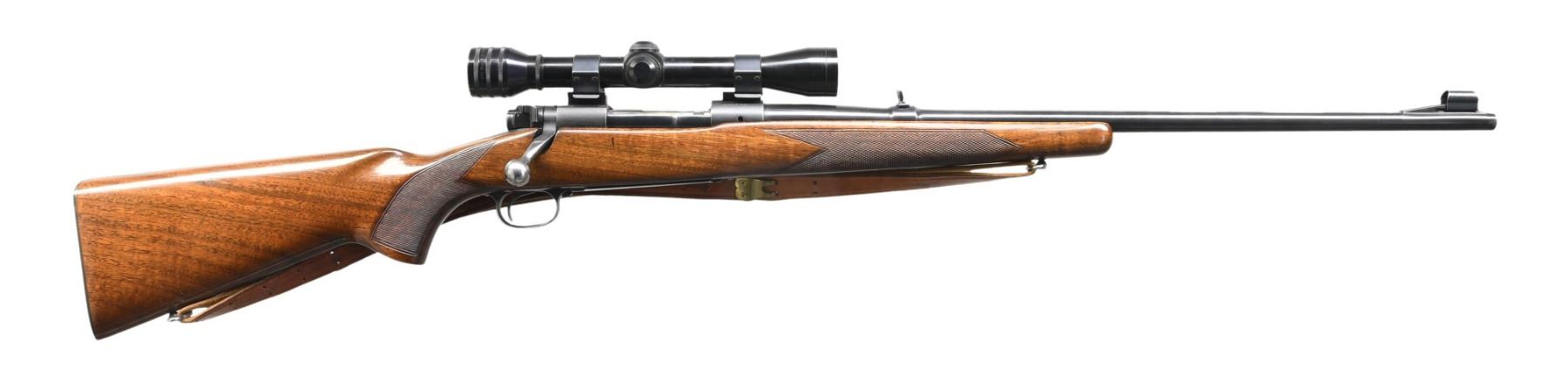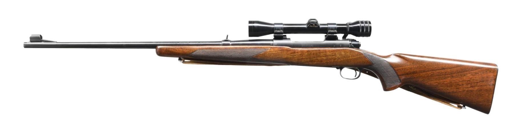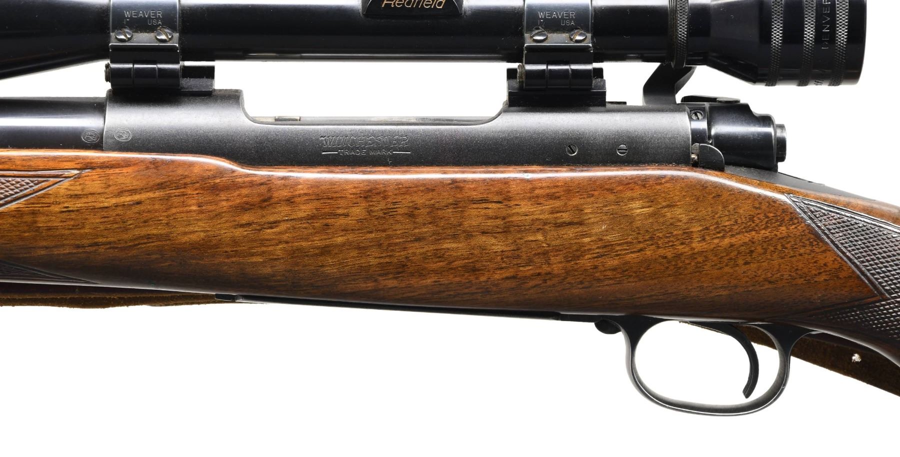 Cal. 30-06. S# 278772. Bbl. 24". Model 70 bolt action rifle, mfg. by Winchester in 1953. Left side of the bbl. is marked with Winchester's mfg. information, followed by the Winchester trademark logo, as well as the model and cal. designations. Left side of the receiver is marked with the Winchester trademark logo, with the S# marked on the right side of the chamber. Receiver exhibits a matte blue finish, with remaining metal components exhibiting a standard blue finish overall. Bolt body is polished in-the-white. Checkered wood pistol grip buttstock with flat checkered steel buttplate. Ramped and hooded blade front sight, with flip-up U-notch rear sight. Receiver is mounted with a Redfield 4x scope. UNATTACHED ACCESSORIES: scope lens caps. CONDITION: metal components retain the majority of their original factory blue finishes, exhibiting some light to mild wear and thinning, with some scattered superficial handling marks present overall. Bolt handle exhibits wear through to a gray patina. Mirror bore, exhibiting a few spots of light pitting towards the muzzle while retaining well-defined rifling throughout. Stock exhibits a few superficial marks from handling and storage but otherwise remains very good to excellent overall. Scope retains a clear optic. (24-5730/MLW). CURIO. $800-1,200.