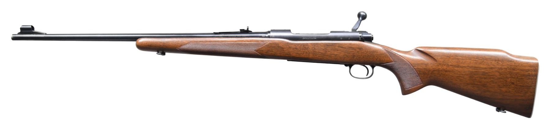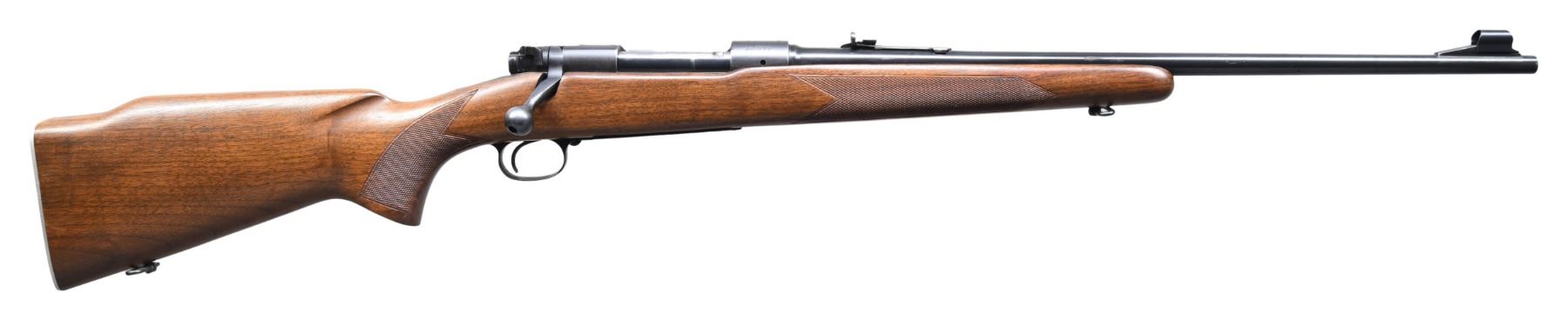 ACTION RIFLE. Cal. 270 Win. S# 340777. Bbl. 21 3/4". Model 70 Featherweight bolt action rifle mfg. by Winchester in 1955. Left side of the bbl. is marked with the Winchester trademark logo, followed by the model and cal. designations. Receiver and bolt handle exhibit a matte blue finish, with the bbl. and bolt shroud exhibiting a standard blue finish. Bolt body is polished in-the-white. Aluminum trigger guard and floorplate exhibit a black enamel type finish. 1-piece checkered wood Monte Carlo pistol grip stock, with checkered aluminum buttplate. Ramped, hooded, and aluminum beaded blade front sight, with dovetailed U-notch rear sight. Receiver is drilled and tapped. Bolt matches the receiver via the full S#, which is electro-penciled on the underside of the bolt body. CONDITION: metal components retain the vast majority of their original factory finishes, exhibiting a few spots of light to mild thinning overall. Bbl. exhibits a few spots of light surface oxidation. Bolt knob shows light to mild thinning that shows through to gray patina. Near mirror bore, exhibiting some scattered spots of light to mild pitting, while retaining well defined rifling throughout. Stock shows some superficial marks from handling and storage, but otherwise remains very good overall. PROVENANCE: Estate of Russell Dickerman. (25-1943/MLW). CURIO. $800-1,200.