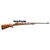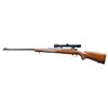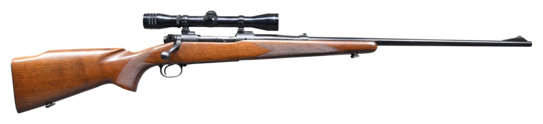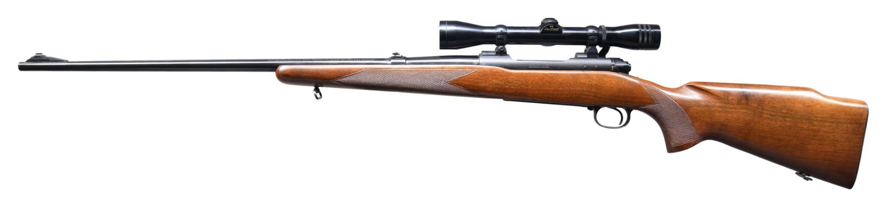RIFLE. Cal. 300 H&H. S# 368709. Bbl. 26" tapered rnd. Ramp mounted replacement Lyman white bead front sight, with original folding leaf rear sight. Redfield 4x40 gloss finished Widefield scope, with duplex reticule on early Leupold bases. Action features a claw extractor and a 3-position safety. Monte Carlo walnut stock, with hand checkering, sling swivels, and checkered steel buttplate. Mfg. in 1956. CONDITION: near excellent, retaining over 98% original blue. Very good original stock finish shows a few small scratches and marks. Bright, near excellent bore. Scope has clear optics. PROVENANCE: Estate of Russell Dickerman. (25-1952/DS). CURIO. $2,000-2,750.