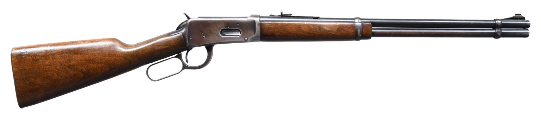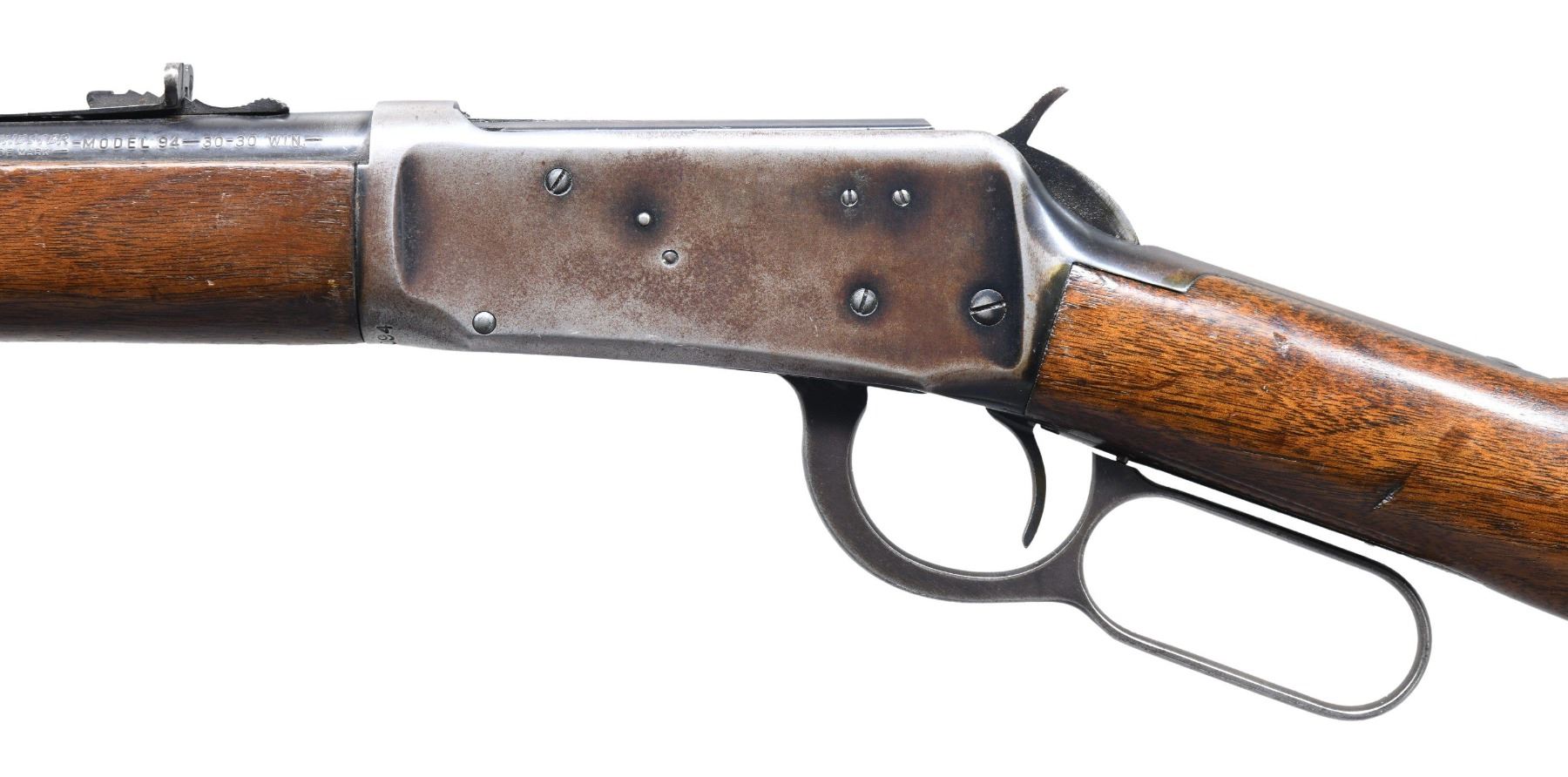 Cal. 30-30. S# 1968094. Bbl. 20". Model 94 lever action rifle mfg. by Winchester in 1953. Left side of the bbl. is marked with Winchester's mfg. information, followed by the Winchester trademark logo, as well as the model and cal. designations. Metal components exhibit a blue finish overall. Plain wood straight grip buttstock and forend have been sanded and revarnished at one time. Ramped aluminum beaded blade front sight, with dovetailed U-notch rear sight. Left side of the receiver is drilled and tapped. CONDITION: receiver retains traces of its original blue finish, with the balance exhibiting a gray and brown patina, light pitting, as well as light surface oxidation overall. Remaining metal components retain the large amounts to the majority of their original factory blue finish, exhibiting areas of wear and thinning that show through to gray and brown patinas, as well as scattered spots of light to mild surface oxidation. Mirror bore, exhibiting some light pitting, while retaining well defined rifling throughout. Wood furniture shows scattered marks and impressions from handling and storage, but otherwise remains sturdy and serviceable. (25-2005/MLW). CURIO. $600-900.