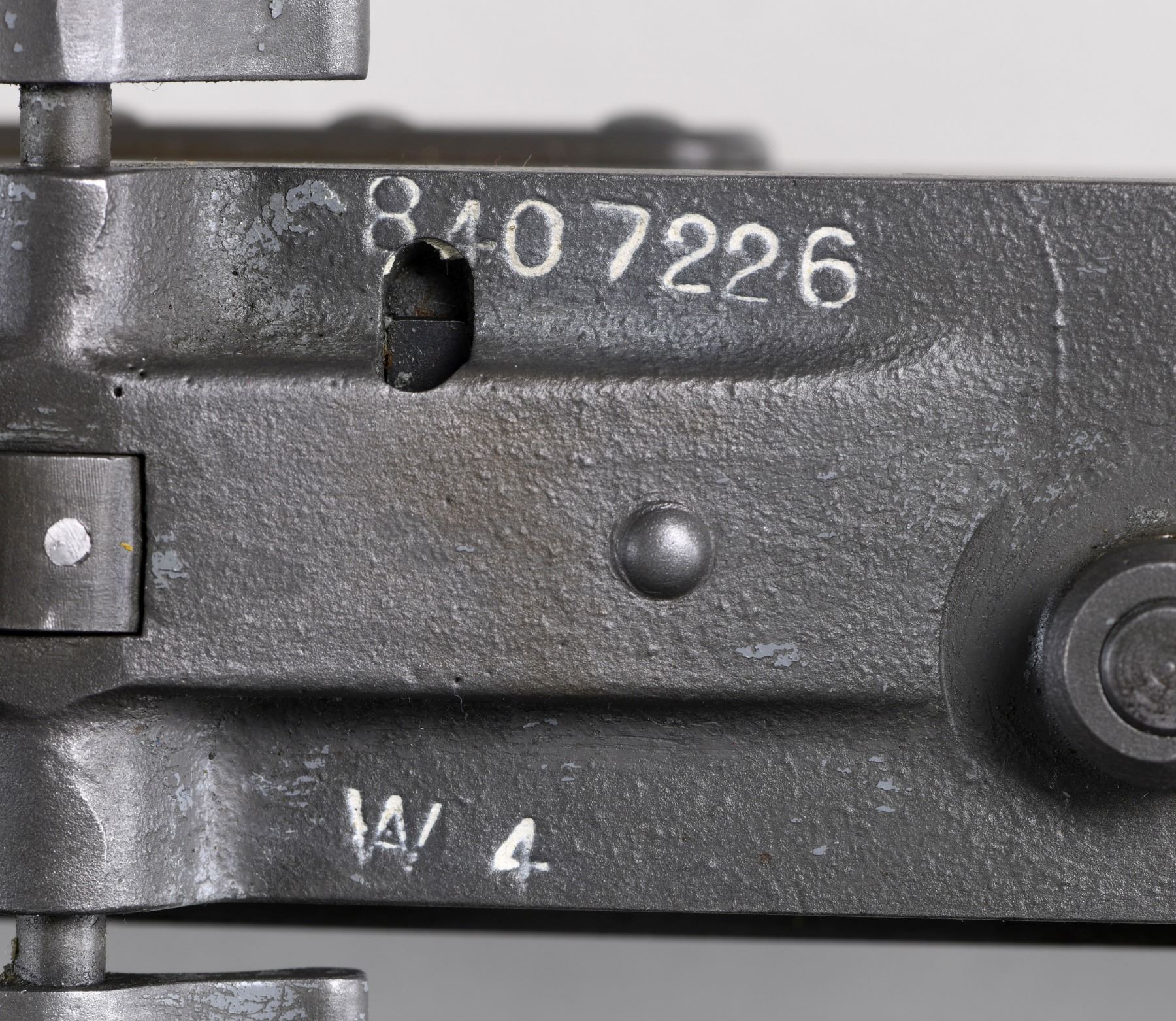 MACHINE GUN. U.S. PROPERTY MARKED. Cal. 30-06. S# 2091. Bbl. 24". The M37 is an evolution of the Browning Machine Gun introduced in the late 1940's as a tank gun. It was designed to have the ability to be fed from both the left side & right side through the use of duel slots on the bolt, similar to the Browning 50 caliber M2. At first glance it might be mistaken for a Model 1919 A6, due to the carry handle located forward of the front trunnion & the familiar ventilated barrel shroud. Closer inspection will reveal the rear mounted cocking handle in place of the typical stubby handle that is typically located in the center of the receiver. Elevation adjustable rear peep sight, marked from 300 yards to 1500 yards. Unprotected post front sight. Right sideplate markings include serial number "2091 / U.S. INSP. EB / GUN, MACHINE, CAL. 30. M37 / US PROPERTY / MFD. BY ROCK ISLAND ARSENAL". Parkerized finish on all exposed metal parts. BATF Paperwork states manufacturer as "Saco / Lowell". MAGS: 1 new cloth belt. CONDITION: finish coverage complete & consistent. Factory markings clear & easy to read, many filled w/ white for ease in reading. Clean bore w/ strong rifling. Fire control mechanism appears to function correctly when cycled by hand. PRE-86 DEALER SAMPLE (KEEPER). NATIONAL FIREARMS ACT MG REQUIRING BATF TRANSFER BEFORE TAKING POSSESSION. YOU MUST BE A CURRENT NFA/SOT DEALER IN ORDER TO TAKE POSESSION OF THIS FIREARM. PROVENANCE: From the Lifelong Collection of Brian Linde. (03-1829/JZ). MODERN. CLASS III. $7,500-12,500.