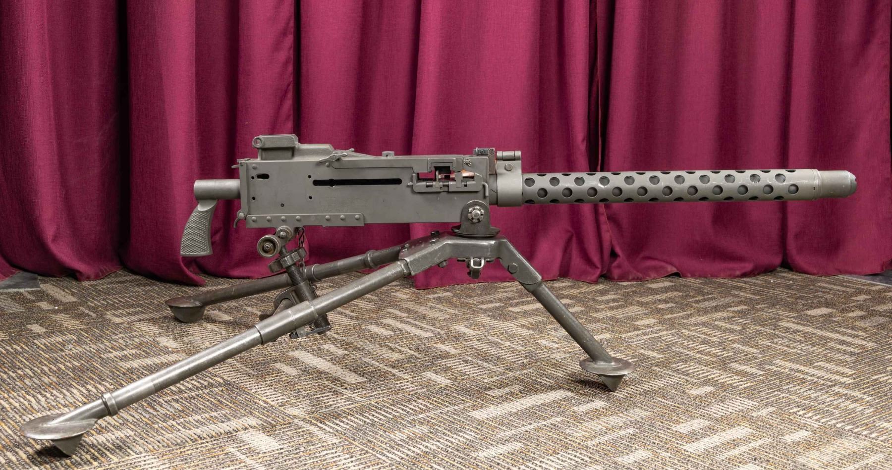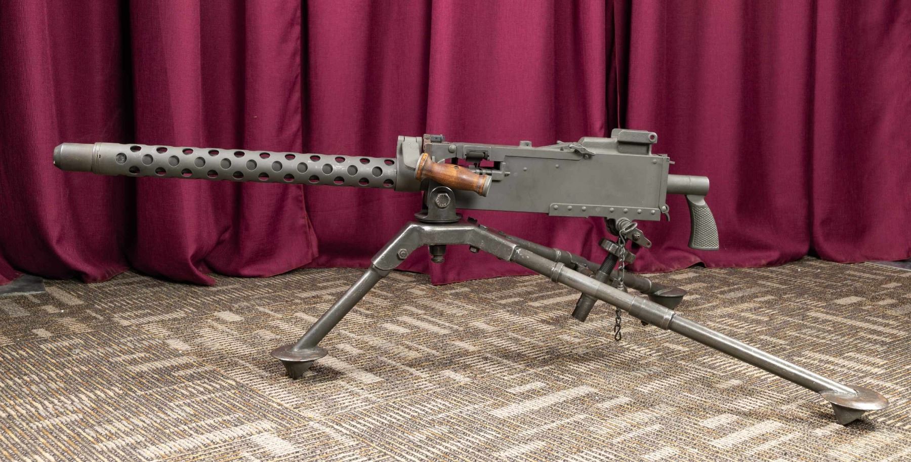BELT FED MACHINE GUN WITH TRIPOD. Cal 30. S# 15235. Bbl is 24" shrouded. The M37 is an evolution of the Browning Machine Gun introduced in the late 1940's as a tank gun. It was designed to have the ability to be fed from both the left side & right side through the use of dual slots on the bolt, similar to the Browning 50 caliber M2. At first glance it might be mistaken for a Model 1919 A6, due to the carry handle located forward of the front trunnion & the familiar ventilated barrel shroud. Closer inspection will reveal the rear mounted cocking handle in place of the typical stubby handle that is typically located in the center of the receiver. Adjustable flip up blade front sight. Abscent rear sight. Feeding mechanism is present however there is no bolt or other internal components. Right side plate is marked "No.15235 U.S.INSP. RBA/Gun, Machine, Cal.30,M37/U.S. Property/MFD Sako-Lowell Shops/ BA4/4-69". And In Tram American Sacramento CA import marking. Tripod marked TE/C59336/AMC/Mount Tripod/M122/No.3475".CONDITION: overall very good reparkerized metal finish on firearm with a few scattered light handling marks and some mild handling wear. Bright bore with sharp rifling. Tripod has scattered scratches, dings and shows sings of use. PROVENANCE: Military Museum Collection of Shooters Outpost, Hooksett NH. PRE-86 DEALER SAMPLE (KEEPER). NATIONAL FIREARMS ACT MG REQUIRING BATF TRANSFER BEFORE TAKING POSSESSION. YOU MUST BE A CURRENT NFA/SOT DEALER IN ORDER TO TAKE POSESSION OF THIS FIREARM. (03-2004/ZAL). MODERN. CLASS III. $10,000-15,000.
