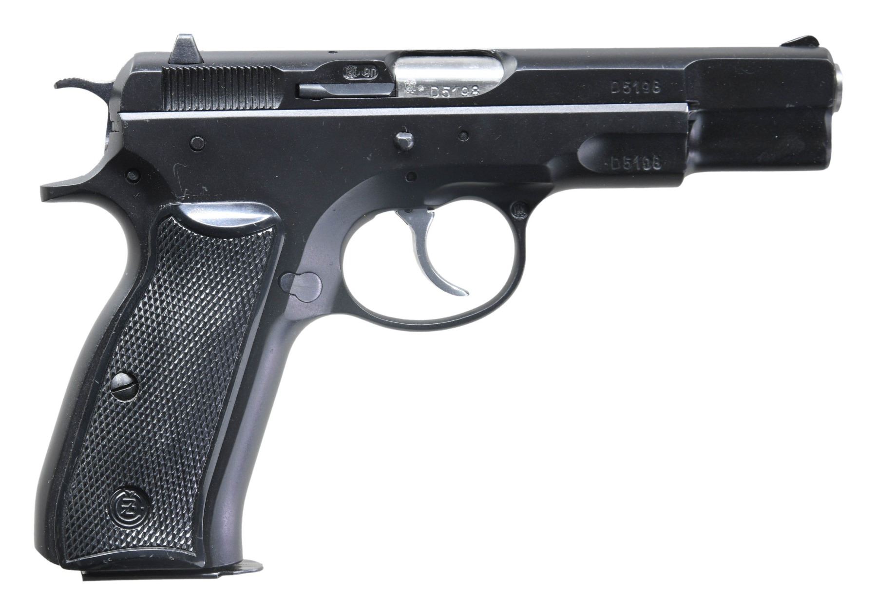 Cal. 9mm Luger. S# D5198. Bbl. 4 3/4". Ramped blade front sight with white highlight. Two dot rear sight. Matching numbers on slide, bbl. & frame. 1990 made CZ-75 pistol. No visible US import markings, possibly brought home by US Serviceman stationed in Germany. Black enamel finish. Checkered black grips with CZ monograms. Left grip panel displays a poor fit & may need some attention to fit better. MAGS: 1-15 rd. CONDITION: grips show light handling marks. Metal retains 95% black enamel with some scattered handling marks & flaking. Action functions properly when hand cycled. Bright near excellent bore. (25-4927/MJC). MODERN. $250-400.
