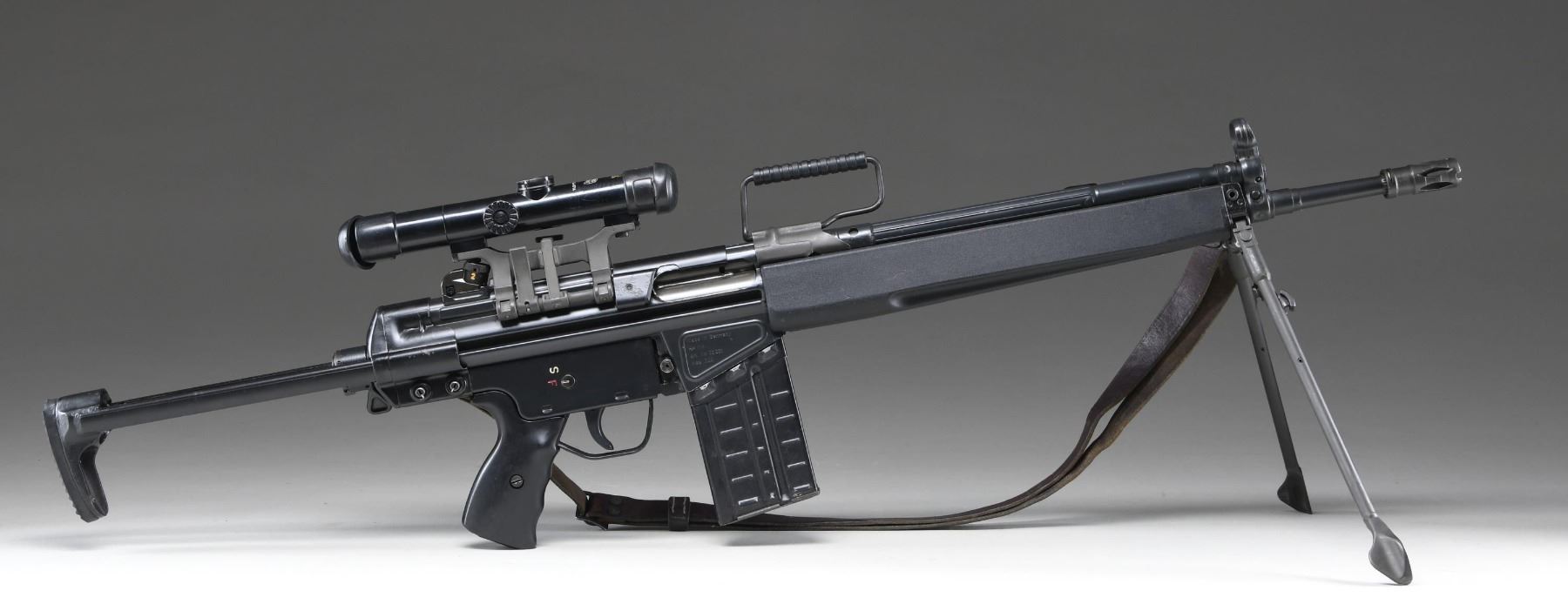 Cal. 308. S# A024246. Bbl. 17.7" w/ factory flash hider. HK model 91 w/ A-3 style, retractable shoulder stock. Black plastic wide forend w/ folding factory bipod. Factory 4 position drum style rear sight assembly. Hooded post front sight. Right side folding carry handle. Push button mag. release w/ S-F metal clip on trigger housing. Magwell right side marked, "Made in Germany / HK Inc. / Arl. Va. 22201 / Kal. .308". Left side magwell marked, "HK 91, A024246" w/ the proof codes: eagle, IA, antler signifying 1980 manufacture. German "SchuBrichtung" scope mount sporting Hensoldt Wetzlar w/ lateral graduation grid reticle. Snap-on ejection port buffer. Left side sling swivels, currently sporting brown leather sling. MAGS: 5 aluminum 20 rd. UNATTACHED ACCESSORIES: Digital camo pattern nylon transport case. CONDITION: dark black factory finish coverage complete & consistent w/ some thinning in areas of mechanical intervention & high spots. Shoulder stock locks tightly in both extended & collapsed positions. Scope glass is clear w/ sharp retical. Bore is bright w/ strong rifling. Fire control mechanism appears to function correctly when cycled by hand. (25-985/JZ). MODERN. $2,750-3,750.