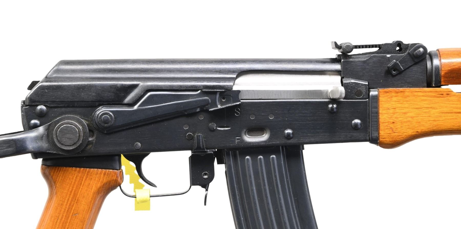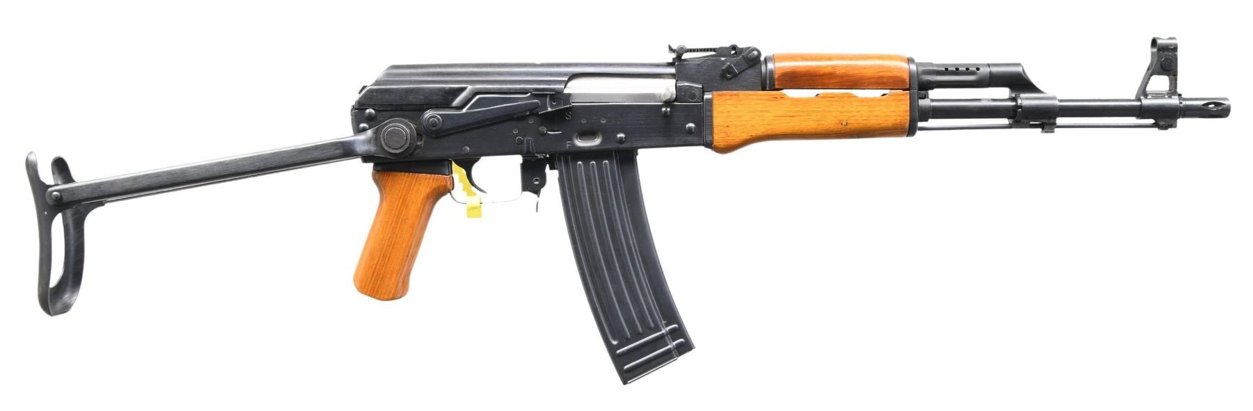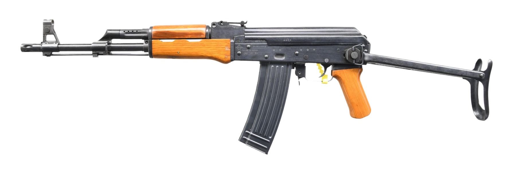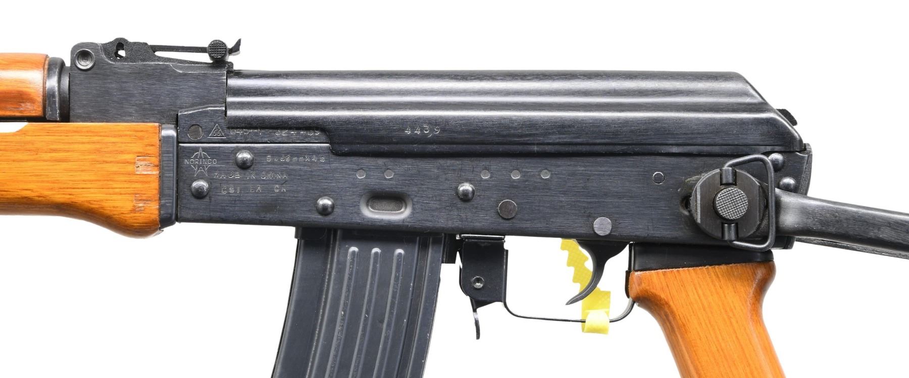 Cal. 5.56x45. S# 324439. Bbl. 16 1/2" with flash hider. Post front sight with protective hood. Tangent rear sight graduated to 800m. Desirable high-quality Chinese AKM style rifle imported for one year only before the Bush era ban. Matching numbers on receiver, recoil spring, bolt & top cover. Left side of receiver has Norinco & Triangle "66" markings. Blued finish. Asian hardwood handguard & pistol grip. Under folding stock. Cleaning rod present. MAGS: 3-30 rd. & 1-10 rd. Total of 4. UNATTACHED ACCESSORIES: matching numbered box with inserts, bayonet, scabbard, oil bottle, manual, sling & cleaning kit. CONDITION: handguard shows a few storage dings. Wood & metal otherwise show some light handling wear. Action functions properly when hand cycled. Bright near excellent bore. PROVENANCE: Lifelong Collection of Terrence McCarty. (24-469/MJC). MODERN. $1000-1500.
