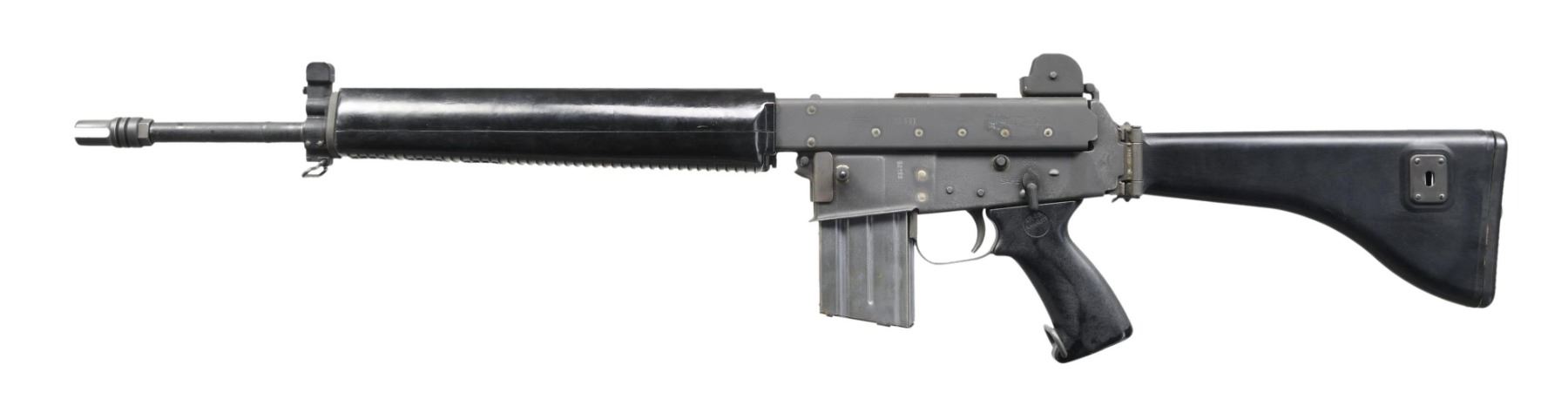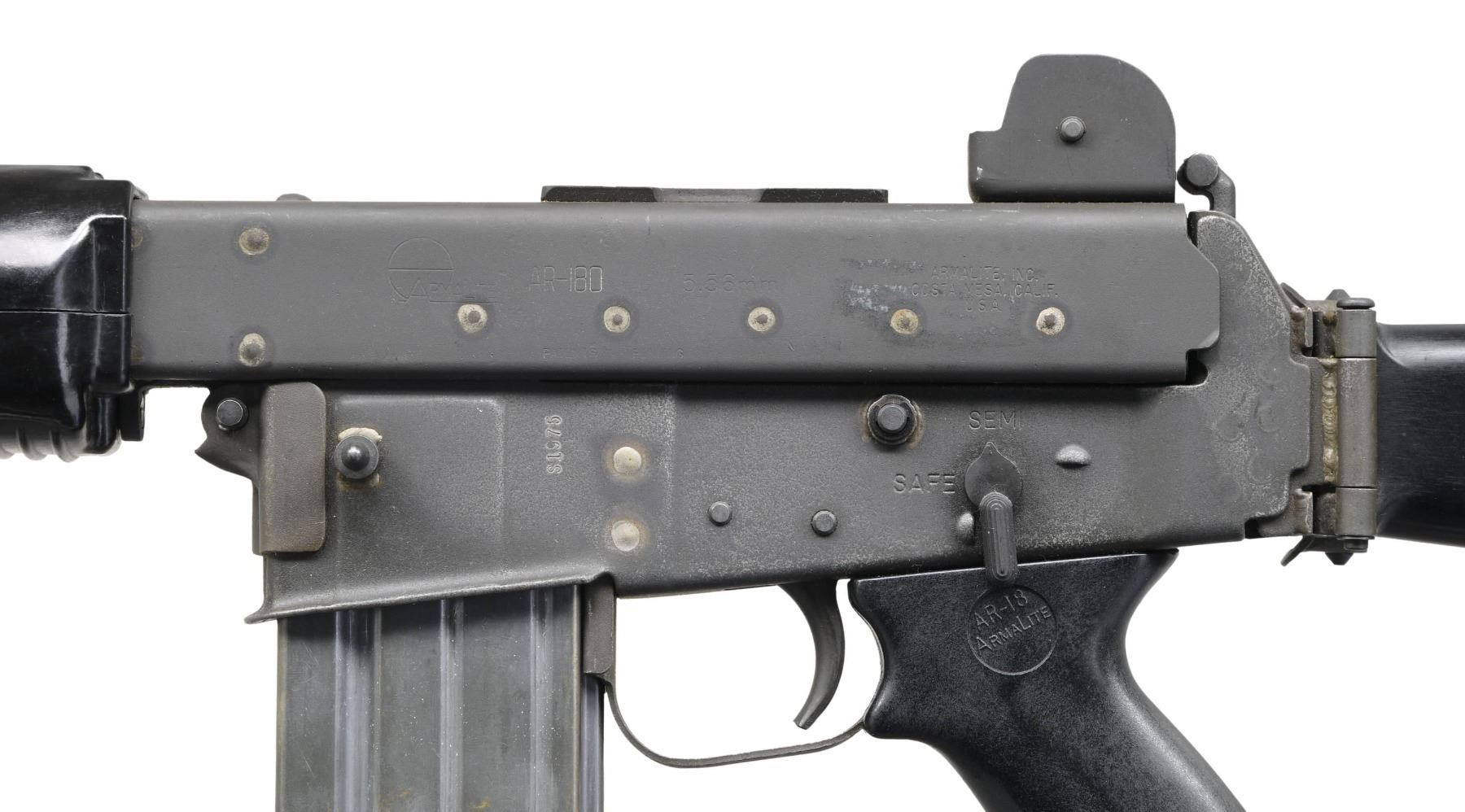 AR-180 MG. Cal. 5.56mm. S# S1975. Bbl. length 18". The original ArmaLite AR-18 was designed in 1963 in CA. as a potential alternative for the U.S. military. When it started to look as though it would not be adopted as a standard service rifle, production was licensed to Howa Machinery Co. in Japan where they began production in 1967. Because military sales to U.S. were effected by American-Japanese treaty agreements that forbid Japan in selling to arms to "belligerent nations", it was determined rifles could not be sold to the U.S. due to our involvement in Vietnam. In 1974 ArmaLite & Sterling Ltd. in England signed a production agreement to manufacture both the AR-18 (Select-Fire version) & the AR-180 (the semi automatic commercial version) & started manufacturing rifles in 1975. This particular example was manufactured by ArmaLite Inc. of Costa Mesa, CA. Serial number located on lower receiver. It is a gas operated piston driven select fire rifle w/ a left side folding stock. Front sight is an elevation adjustable protected post. Rear sight is a windage adjustable dual aperture peep sight marked 200 & 400. The rifle is charged by a reciprocating handle on the right side of the rifle. Ambidextrous safety selector controls, black plastic furniture. Proper muzzle brake forward of bayonet lug. Sling swivels front & rear. MAGS: 2 aluminum 20 rd. w/ ArmaLite floorplate. CONDITION: Finish complete & consistent on exposed metal surfaces w/ gentle thinning on some high spots. No excessive thinning even in areas of mechanical intervention. Stock locks tightly in open & closed positions. Bore is bright w/ strong rifling. Fire control mechanism appears to function correctly when cycled by hand. (24-5443/JZ). MODERN CLASS III. $1,000-1,500.