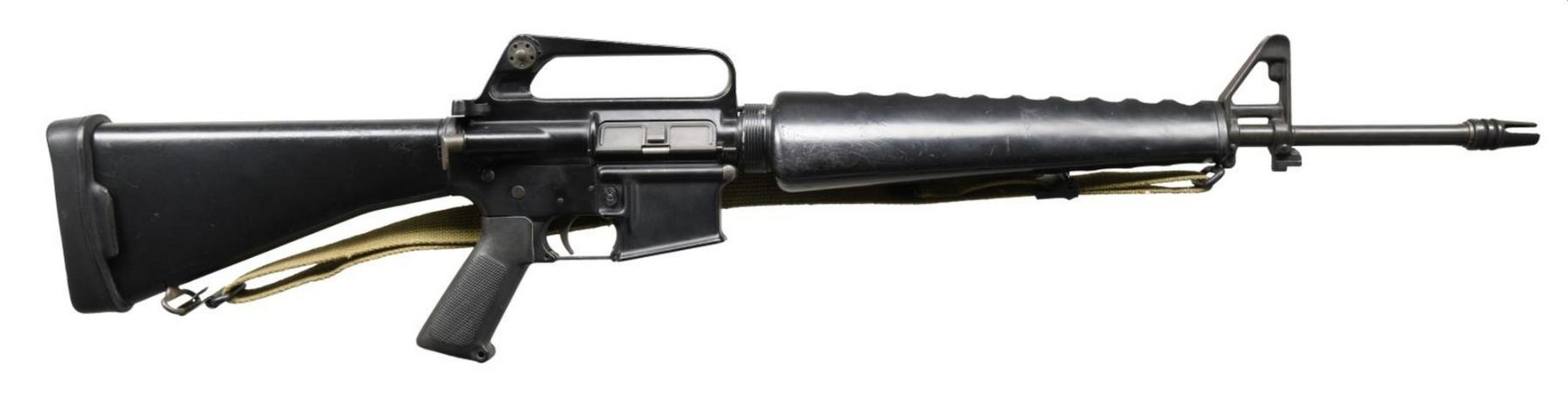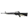Cal.5.56mm. S# 21290. Bbl. 20". Matte black finish. Threaded muzzle w/ 3 prong flash hider. Barrel may be an early Colt given the stamp "12" behind flash hider. Protected post front sight / bayonet lug / gas block. Beavertail handguards secured w/ strait delta ring. Dual aperture rear peep sight in carry handle. Teardrop forward assist. No brass deflector. Full length buttstock w/ trap door, currently terminated w/ slip-on rubber recoil pad. Green canvas sling. CONDITION: Dark finish on receivers, some thinning in high areas. Bore is bright w/ good rifling. Fire control mechanism appears to function correctly when cycled by hand. (23-2025/JZ). MODERN. $1,200-1,800.00