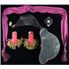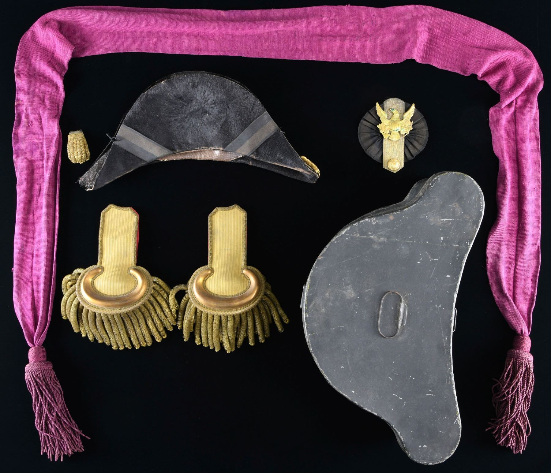 ORIGINAL TIN BOX, EPAULETTES, AND SASH. This interesting group includes a beaver chapeau showing a detached 5" black cloth cockade with an M1832 eagle, a 5 1/2" bullion tape, and a staff button. There is a full sweatband and red silk liner. Looking through the liner, a blue label in the crown bears the name "Jas. S. Smith". A military good manufacturer located at 15 Dutch St. in New York City. Also included in the lot is a pair of slide-on epaulettes with no rank insignia and red undersides and a maroon officer's sash. CONDITION: the chapeau is generally solid but has been crushed. The bottom edges, top, and ends show wear. One tassel is detached, as is the cockade and insignia. The tin box shows moderate wear but is relatively dent free. The epaulettes are tarnished and a bit soiled. The sash is generally free from problems but does show a bit of fading. (02-23624/BF). $1,000-1,400.