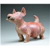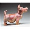 This large, fat red Pre-Columbian Colima dog figure with bone in its mouth. During this period, many of the dogs were raised to eat, this being an extra fat one would have been an example of one to be eaten. SIZE: 14" l x 7" w x 11" h. CONDITION: scattered losses on red surface. The underside of the body with a fracture line running from the neck to the belly. One ear with ancient chip, the other having ancient chips and an old repair to the tip of the ear. (05-1100/JJ). $1,000-2,000.