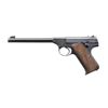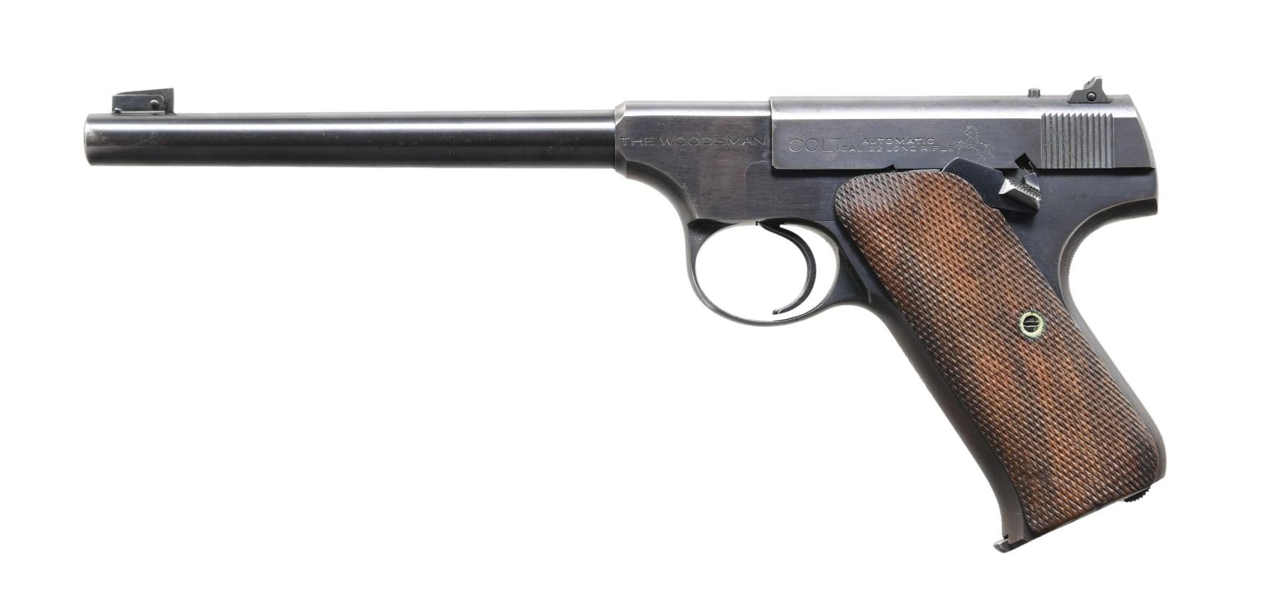 Cal. 22 LR. S# 137147. Bbl. 6 5/8". Woodsman semi-automatic pistol, mfg. by Colt in 1940. The top of the bbl. is marked with Colt's mfg. and patent information, with "THE WOODSMAN" marked on the left side of the breech. Left side of the slide is marked "COLT", followed by the cal. designation and the Rampant Colt logo. Front grip strap is marked with the S#. Metal components exhibit a blue finish overall. Frame is mounted with 2-piece checkered wood grips. Patridge front sight, with adj. square notch rear sight. MAGS: one 10-rd. CONDITION: metal components retain the majority of their original factory blue finish, exhibiting some areas of wear, some superficial handling marks, as well as scattered spots of light surface oxidation and spots of cleaned surface oxidation overall. Grip straps exhibit wear and thinning that shows through to gray and brown patinas. Mirror bore, exhibiting strong rifling throughout. Grips show some smoothing, as a few scattered marks and minor impressions from handling and storage, but otherwise remain sturdy and serviceable. (24-5158/MLW). CURIO. $700-1,000.