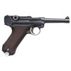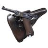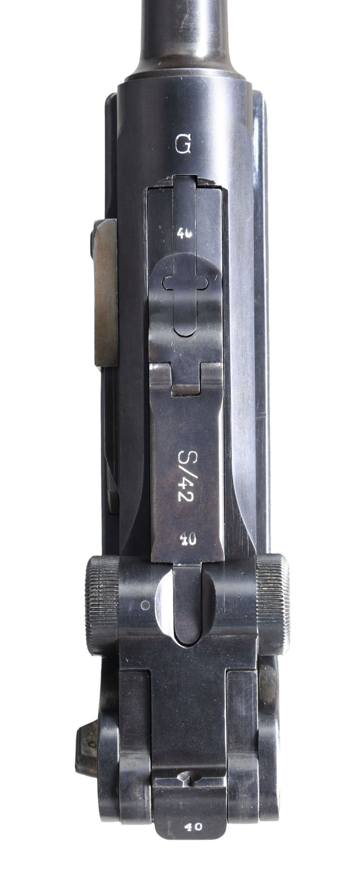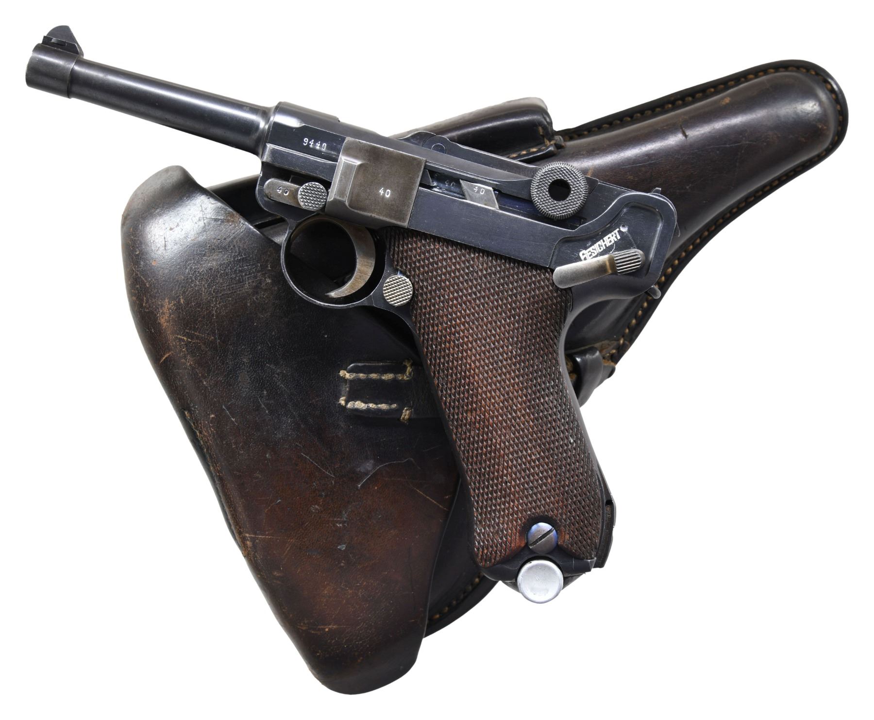PISTOL WITH HOLSTER. Cal. 9mm Luger. S# 9440h. Bbl. 4". P.08 Luger semi-automatic pistol mfg. by Mauser in 1935 clandestinely for the German military. The bbl. extension is marked with a "G" (1935) date code over the chamber, with Mauser arsenal proofs marked on the right. Toggle is marked with Mauser's "S/42" mfg. code. Metal components exhibit a reapplied blue finish overall, with some small parts exhibiting a straw or nitre blue finish. Frame is mounted with 2-piece checkered wood grips. Nearly all serialized parts are matching and include the frame, takedown lever, sideplate, trigger, safety lever & bar, hold-open latch, bbl. extension, trigger bar, breechblock, extractor, firing pin, toggles, as well as the rear toggle pin. Grips are unnumbered. Bbl. is a proper Mauser proofed bbl., with the second "4" in "9440" being stamped over a "5". MAGS: 2 aluminum bottom 8-rd. 1 non-matching and 1 marked "MADE IN GERMANY". UNATTACHED ACCESSORIES: brown leather holster marked "CHEINICHEN/ DRESDEN." followed by a droop Eagle/WaA142 and "1935" on the rear. Holster contains a loading tool. CONDITION: metal components retain the majority of their reapplied blue finish, exhibiting some spots of light wear and thinning, some areas of light surface oxidation, as well as some spots of light pitting beneath the bluing. Sideplate retains a mostly gray patina. Strawed parts are good, showing some wear and thinning, with worn areas exhibiting spots of age related discoloration. Near mirror bore, exhibiting some light pitting, while retaining strong rifling throughout. Grips are good, showing mild smoothing, as well as some scattered nicks and marks to the diamonds. Holster remains malleable, exhibiting wear, scattered handling marks, as well as some spots of age related cracking and crazing. (24-6904/MLW). CURIO. $1,500-2,000.