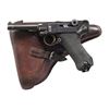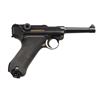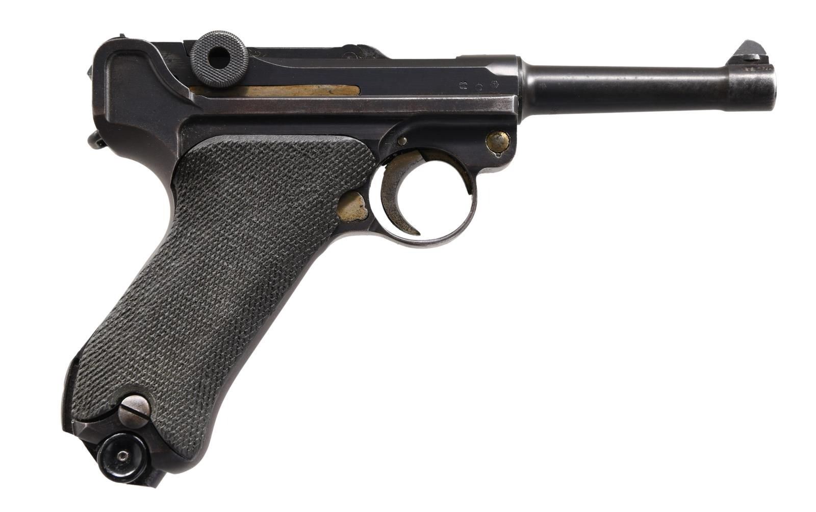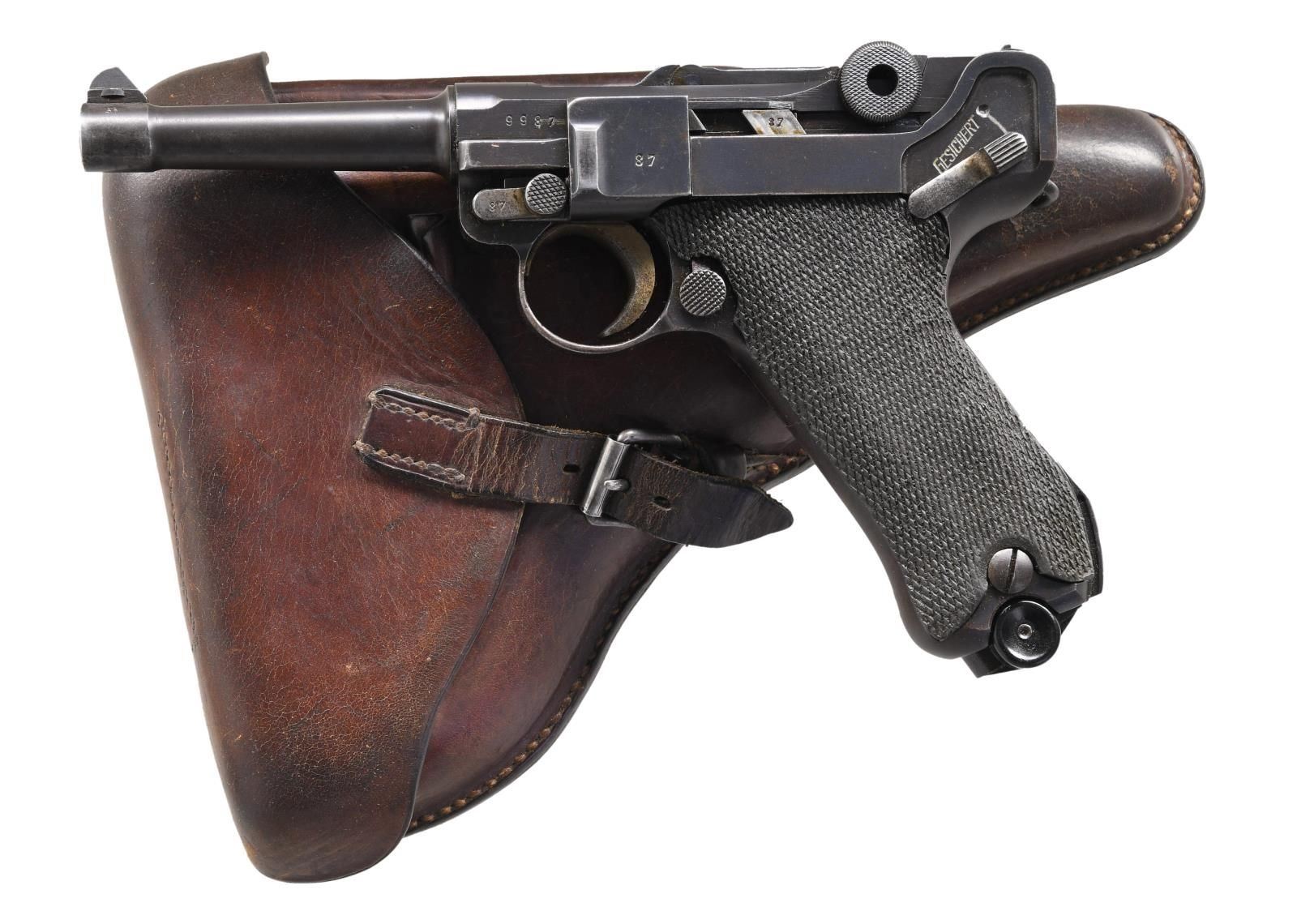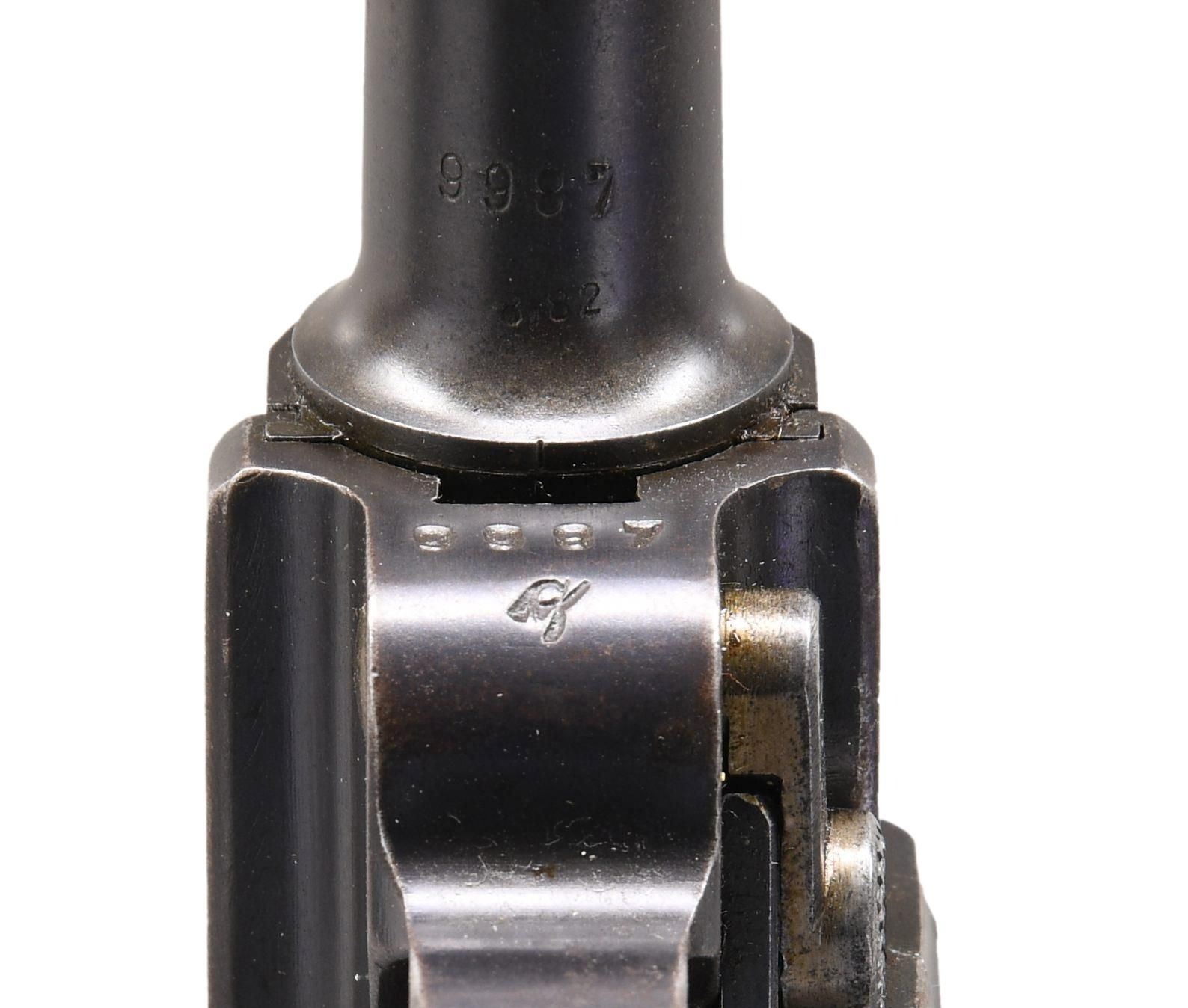 SEMI-AUTOMATIC PISTOL WITH HOLSTER. Cal. 9x19mm. S# 9987q. Bbl. 4". P.08 Luger mfg. at the Mauser arsenal in 1937. The bbl. extension is marked "1937" over the chamber, with Mauser Eagle/63 acceptance proofs and an eagle firing proof stamped on the right. Toggle is marked with Mauser's "S/42" mfg. code. Major metal components exhibit a blue finish, with some smaller components including the takedown lever, trigger, safety lever, and ejector exhibiting a straw finish. Frame is mounted with 2-piece checkered wood grips. All numbers are matching with the exception of the hold-open latch and grips, which are unnumbered. Blued "fxo" marked mag. with black plastic bottom. MAGS: 2 8-rd. UNATTACHED ACCESSORIES: brown leather holster marked "GENSCHOW&Co. A.G./ BERLIN", followed by an Eagle/WaA387 proof, and "1937" on the rear, and containing 1 spare non-matching aluminum bottom mag. and an unmarked loading tool. CONDITION: metal components retain large amounts of their original factory blue finish, exhibiting areas of wear and thinning that show through to gray and brown patinas, with light surface oxidation present overall. Exterior and interior of pistol exhibits areas of grease. Strawed components exhibit varying degrees of wear, with worn areas exhibiting spots of age related discoloration. Poor bore, exhibiting pitting and fair to good rifling throughout. Grips exhibit smoothing and some scattered handling marks, with chipping present along the edges of the panels. Holster remains malleable, exhibiting some light wear, with age related cracking present overall. PROVENANCE: From the Collection of Joel Thone. (24-1487/MLW). CURIO. $1,200-2,000.