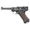 SEMI-AUTOMATIC PISTOL, WITH MATCHING MAGAZINE. Cal. 9mm Luger. S# 8791m. Bbl. 4". P.08 Luger semi-automatic pistol mfg. by Mauser in 1938 for the German military. Top of the bbl. extension is marked with the 4-digit year of mfg. "1938", with Mauser Eagle/63 proofs marked on the right. Toggle is marked with Mauser's "S/42" mfg. code. Metal components exhibit a salt blue finish overall. Frame is mounted with 2-piece checkered wood grips. Dovetailed blade front sight, with fixed V-notch rear sight. All serialized parts are matching and include the frame, takedown lever, sideplate, trigger, safety lever & bar, hold-open latch, bbl., bbl. extension, trigger bar, breechblock, extractor, firing pin, toggles, as well as the rear toggle pin. Grips are unnumbered and are devoid of Mauser proofs. MAGS: 1 blue 8-rd. mag., with matching aluminum bottom marked "8791/ m/ +" above a Mauser Eagle/63 proof. CONDITION: metal components retain large amounts of their original arsenal salt blue finish, exhibiting wear and thinning that shows through to gray patina, with scattered spots/areas of light to mild pitting present overall. Grip straps retain a dull gray patina, with consistent light to mild pitting. Fair bore, exhibiting consistent mild pitting and scattered areas of dark pitting, while retaining strong rifling throughout. Grips show smoothing, as well as scattered superficial marks and impressions from handling and storage, but otherwise remain sturdy and serviceable. Left grip exhibits a chip in the usual area, on the top right corner of the panel beside the safety lever. PROVENANCE: The Estate Collection of Charles Wagner. (25-456/MLW). CURIO. $1,200-1,500.