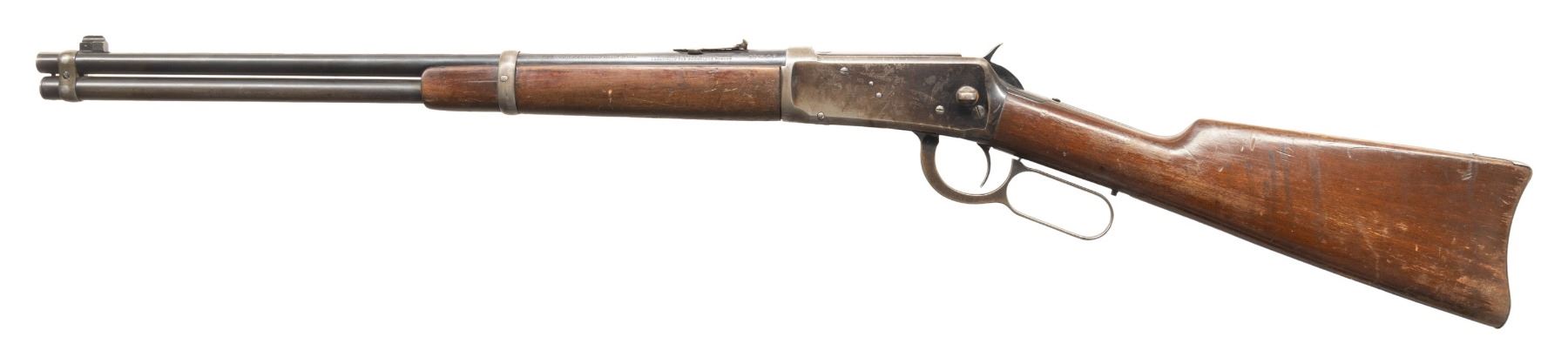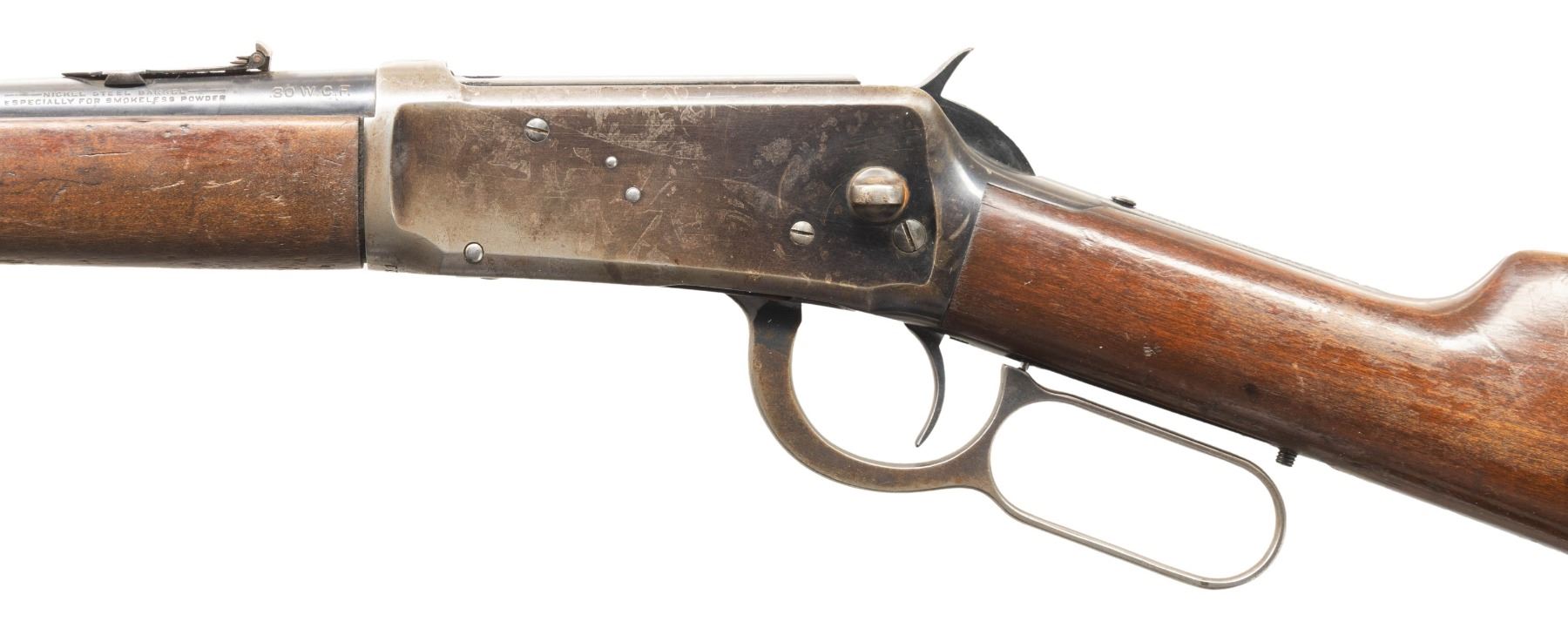 RING CARBINE. Cal. 30 WCF. S# 882611. Bbl. 20". Model 1894 lever action saddle ring carbine mfg. by Winchester in 1921. Left side of the bbl. is marked with Winchester's 2-line mfg. information and patent information, with the cal. designation marked towards the breech. Upper receiver tang is marked "MODEL 1894/ -WINCHESTER-". Lightly sanded and refinished plain wood forearm and straight grip buttstock with steel carbine buttplate. Marbles No. 94C blade front sight with dovetailed 3-leaf V-notch rear sight. Left side of the receiver features a saddle ring stud, with 4 added holes and plug screws added to the right side, likely for a scope mount attachment. Receiver has been notched on the top at the forward edges of the chamber. Rear receiver tang screw is a oversized replacement. Upper receiver tang has been drilled and tapped with an added screw for a previously mounted tang sight attachment. Rear bbl. band screw has been replaced with a peened steel pin. CONDITION: metal components retain good amounts of their original factory blue finish, exhibiting areas of wear and thinning fading to gray and brown patinas, with scattered spots and patches of light surface oxidation. Bright bore, exhibiting scattered spots and patches of light to mild pitting, while retaining strong rifling throughout. Proper manual mechanics. Wood furniture shows scattered marks and impressions from handling and storage, as well as scattered areas of flaking to the varnish on the buttstock, but otherwise remain sturdy and serviceable. (25-6717/MLW). CURIO. $600-800.