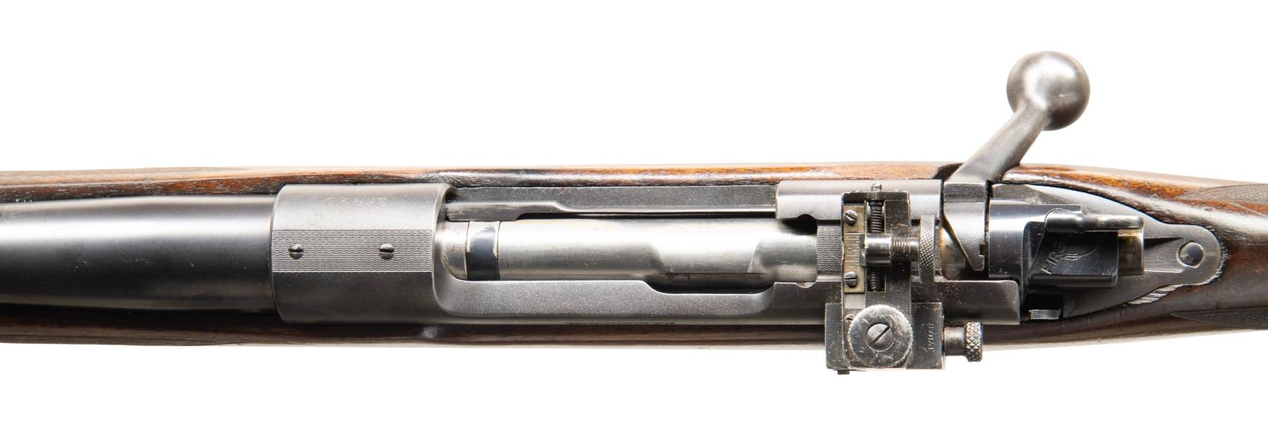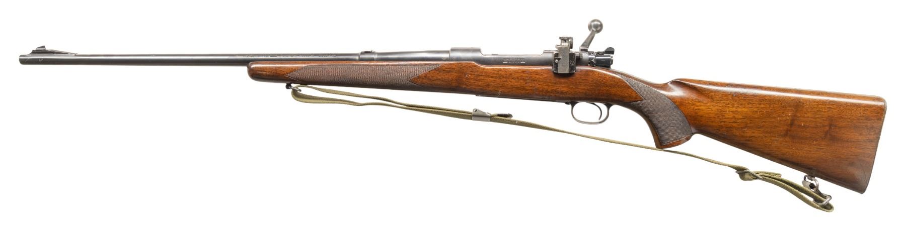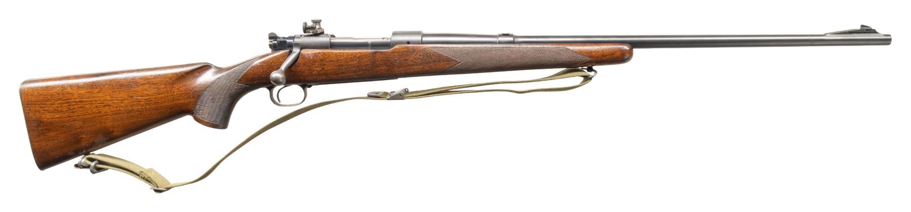 Cal. 30-06. S# 36920. Mfg. early 1941. Tapered 24" bbl. Ramp mounted replacement blade front sight, filler in rear dovetail & Lyman receiver sight. Matching numbered bolt has first style safety. Control feed action w/ drilled & tapped over chamber. Checkered walnut stock w/ checkered alloy buttplate; Swivels hold green M1 Garand sling. CONDITION: very good original blue on receiver & barrel with scattered peppery oxidation & muzzle wear. Good wood finish with numerous dings & scratches, worn checkering, chipped wood around action & crack from rear floorplate screw. Bore shows strong rifling with light frosting begining around muzzle. PROVENANCE: Estate Collection of John "Jack" Dhooghe. (25-5549/MD). CURIO. $800-1,200.