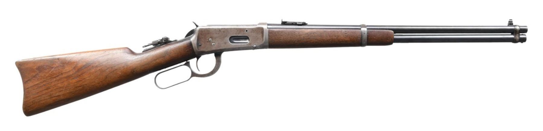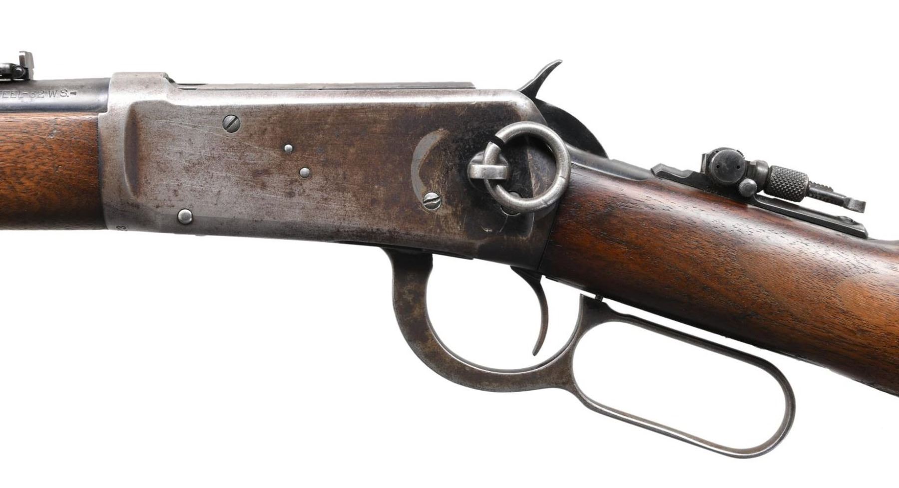 SADDLE RING CARBINE. Cal. 32 WS. S# 983633. Bbl. 20". Model 94 lever action saddle ring carbine mfg. by Winchester in 1926. Left side of the bbl. is marked "-MODEL 94-", followed by the Winchester trademark logo and "-NICKEL STEEL- 32 W.S.-". Metal components exhibit a blue finish. Plain wood straight grip buttstock and forend. Marbles No. 6H blade front sight with U-notch ladder rear sight. Upper receiver tang is mounted with a Lyman aperture rear sight. CONDITION: metal components retain fair amounts of their original factory blue finish, with the balance exhibiting wear and thinning overall that shows through to gray and brown patinas, with areas of age-related discoloration and spots of surface oxidation/pitting present overall. Fair bore, exhibiting consistent scattered spots of moderate pitting while retaining strong rifling throughout. Wood furniture shows scattered marks and minor impressions from handling and storage, but otherwise remains sturdy and serviceable. (24-2555/MLW). CURIO. $600-900.