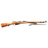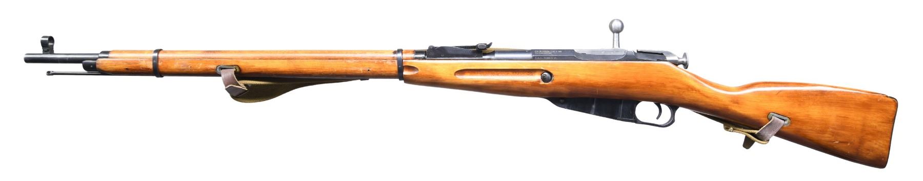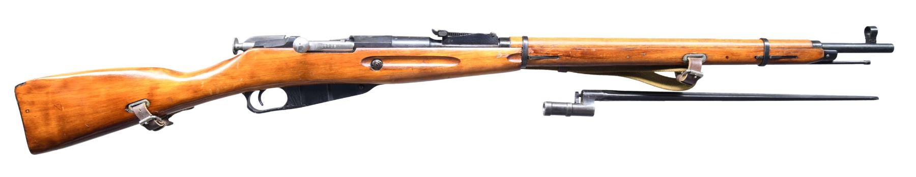 ACTION MILITARY RIFLE. Cal. 7.62X54R. S# 9130420503 as applied by importer. Bbl. 28 3/4". Hex receiver carries only import mark. Original S# 80041 marked on barrel, bolt, floorplate and buttplate. Barrel markings include Tula "arrow in star, 1 in triangle and 1935". Tangent rear sight graduated to 2000 meters. Post front sight w/ protective hood. Cleaning rod is present. Hardwood stock set. Green web sling w/ leather collars. UNNATTACHED ACCESSORIES: 17" spike blade socket bayonet. Socket slightly modified to fit rifle. CONDITION: Rifle has nice appearance with an arsenal rework finish on the wood and metal. Finish has light wear and handling marks. Bore has worn lands with frosted grooves. (25-994/RW). CURIO. $300-500.