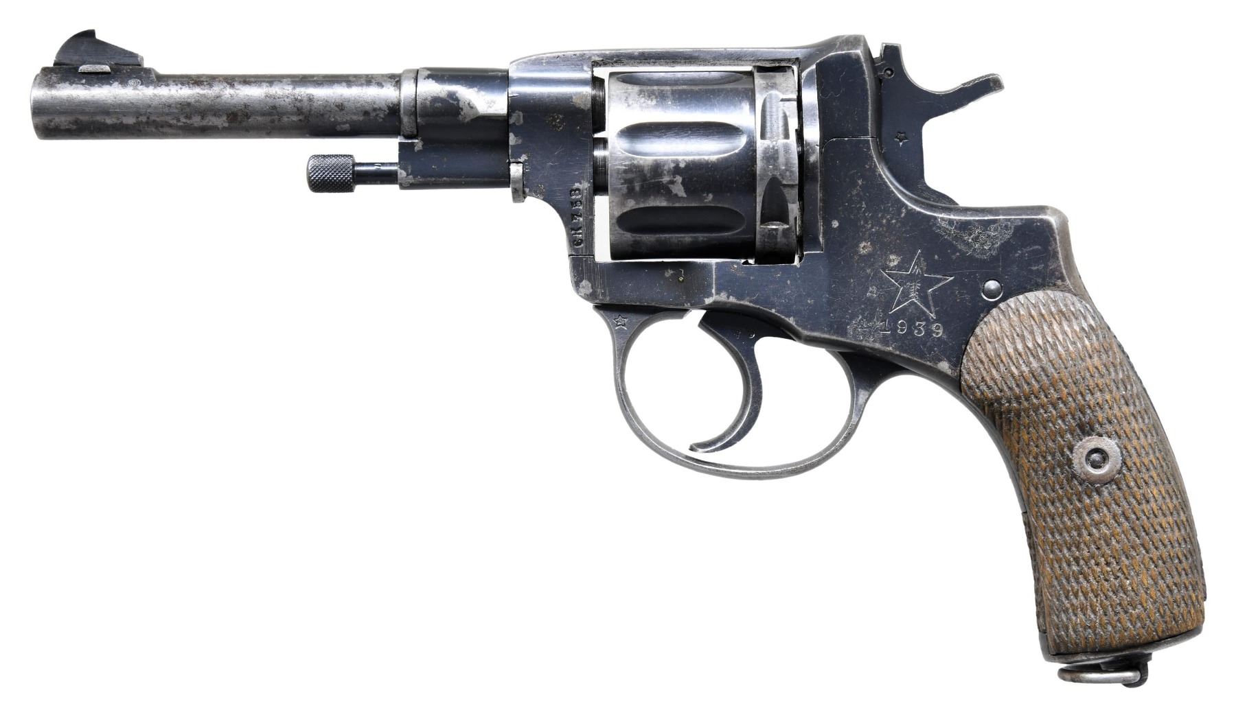Cal. 7.62 Nagant. S# SK758. Bbl. 4 1/2". Blade front sight. Fixed rear sight. Matching numbers on sideplate & cyl. No visible import marks appears to be non-refurb example. Left rear of frame has Tula star with 1939 date. Original blued finish. Checkered hardwood grips. Lanyard ring present on bottom of grip frame. CONDITION: grips show some checkering wear, dings & handling marks. Metal retains 50% original blue with scattered fading to gray, light pitting, oxidation & edge wear. Action functions properly when hand cycled. Bore shows some light pitting & oxidation but strong rifling. (25-2689/MJC). CURIO. $200-300.