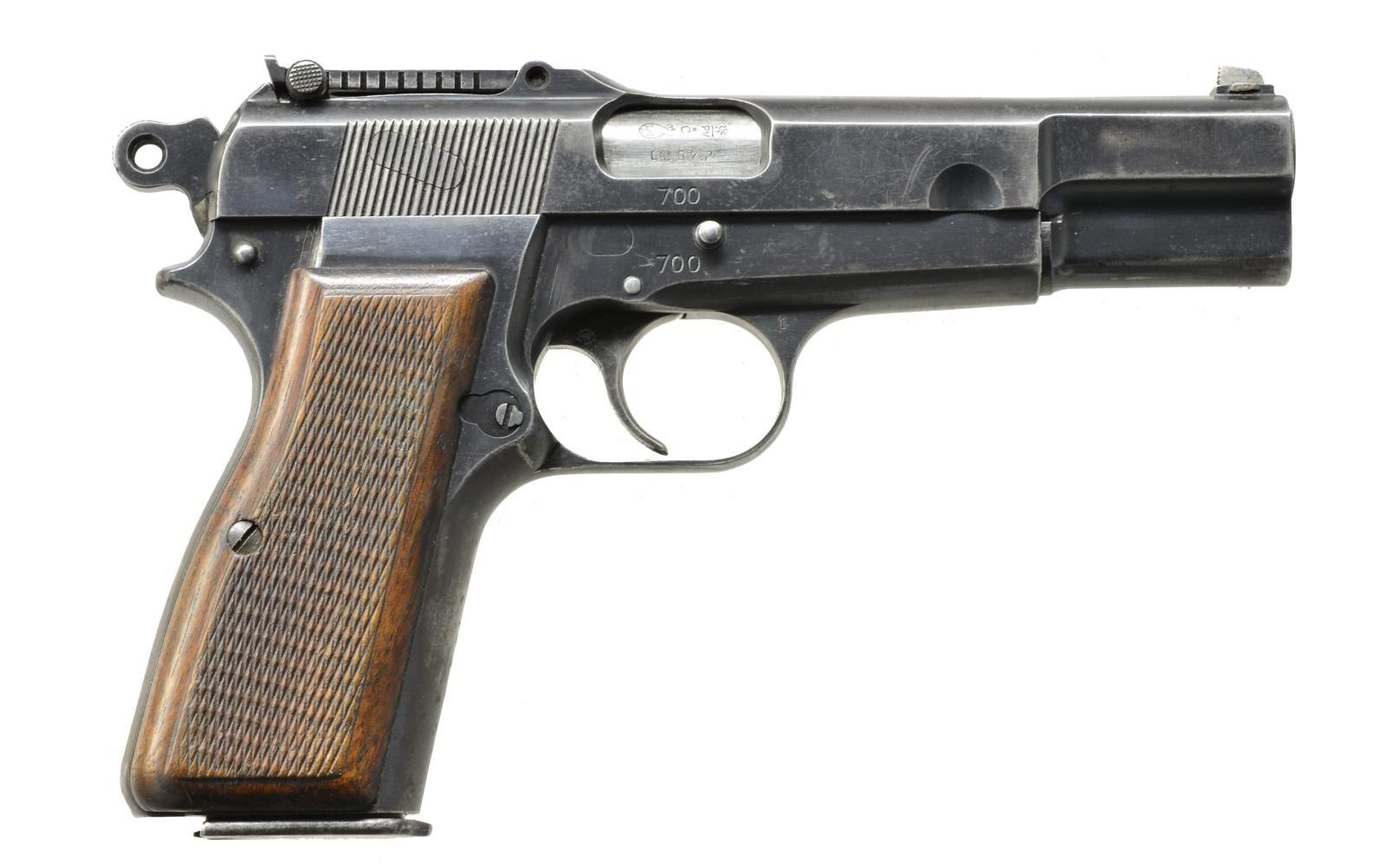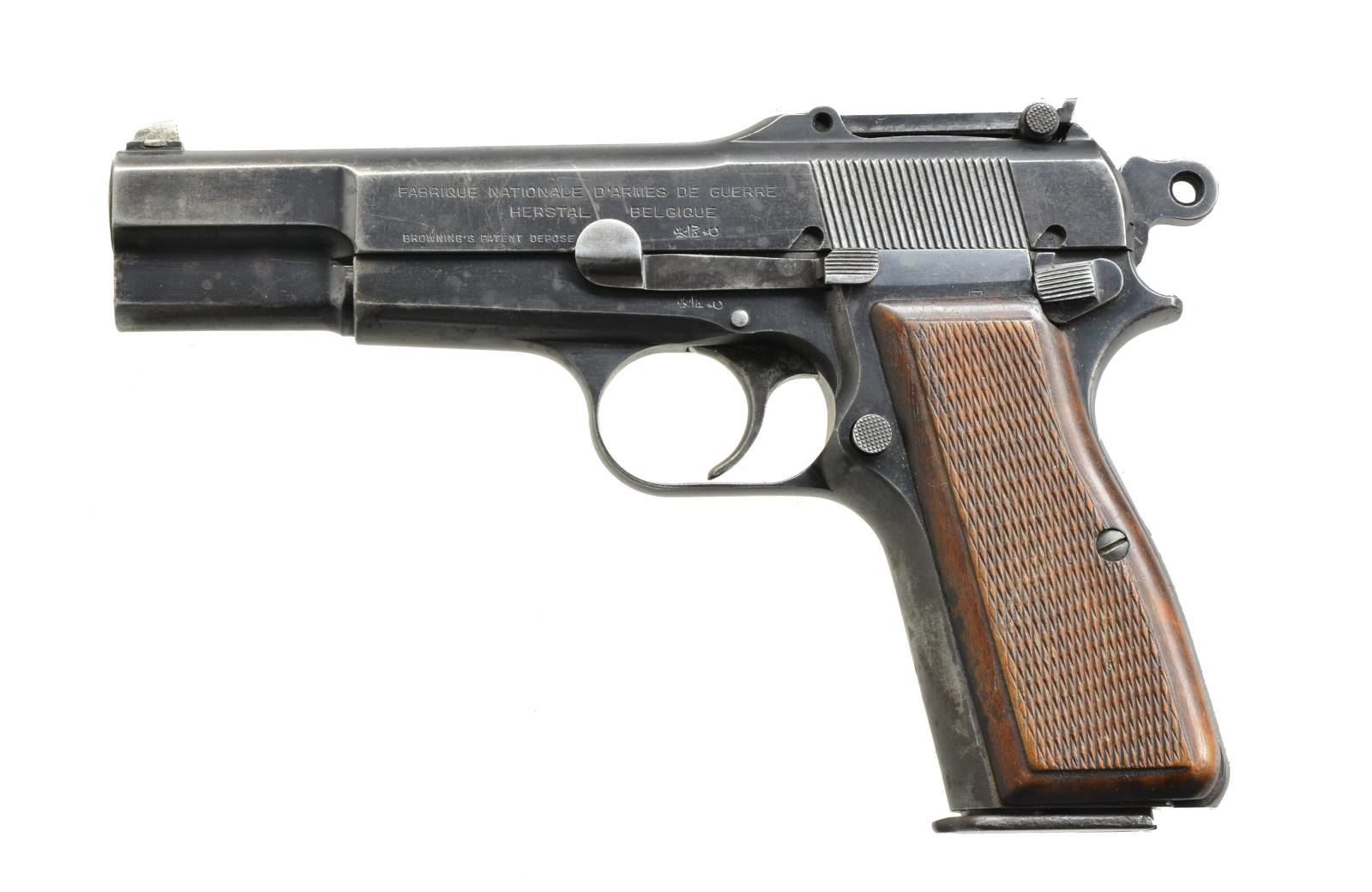 AUTO PISTOL. Cal. 9mm Para. S# 700. Bbl. 4.8". The Estonian Army received 3,038 pistols by Fabrique Nationale marked "E.V" for Eesti Vabarik (Republic of Estonia) prior to Dec. 1937 according to "FN Browning Pistols" by Vanderlinden. All pistols ordered w/out shoulder stocks or holsters, although grip strap is slotted for shoulder stock. Slide is marked on left side "FABRIQUE NATIONALE D' ARMES DE GUERRE HERSTAL BELGIQUE BROWNING'S PATENT DEPOSE". Slide, frame & bbl. have Belgium proofs. Tangent rear sight graduated to 500m. Inverted V front sight. All visible numbers match. No mag. disconnect. Checkered walnut grips. MAGS: 1 unmarked 13 rd. CONDITION: grips have light wear, staining & slight flattening of diamonds throughout. Metal has 60% original thinning blue w/ light wear & scattered spots of oxidation & very fine pitting throughout. Fair worn bore turning dark in grooves. (20-4207/RW). CURIO. $1,500-2,500.