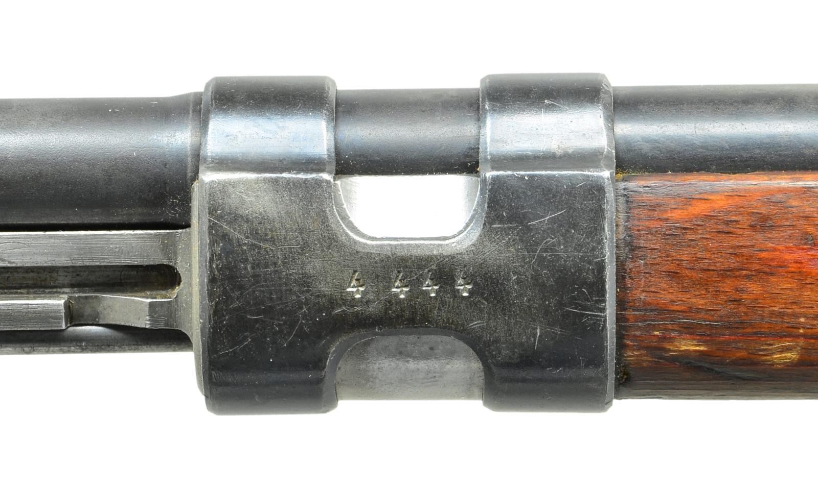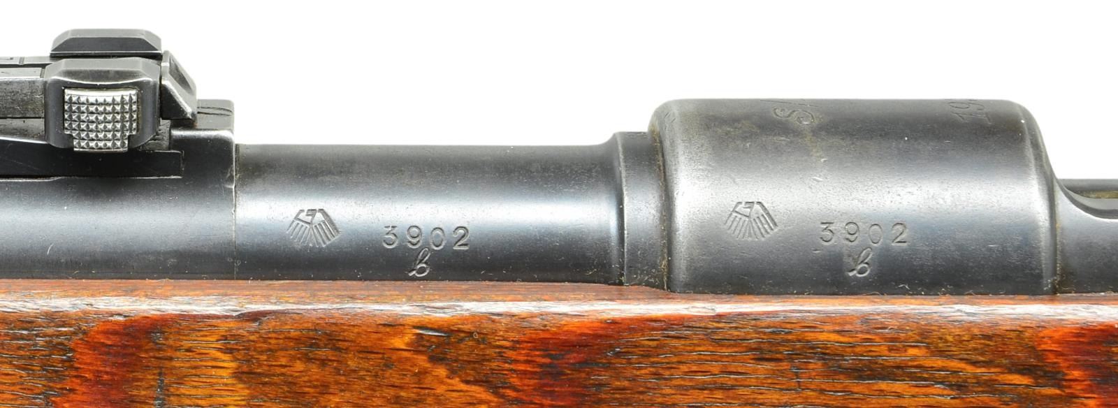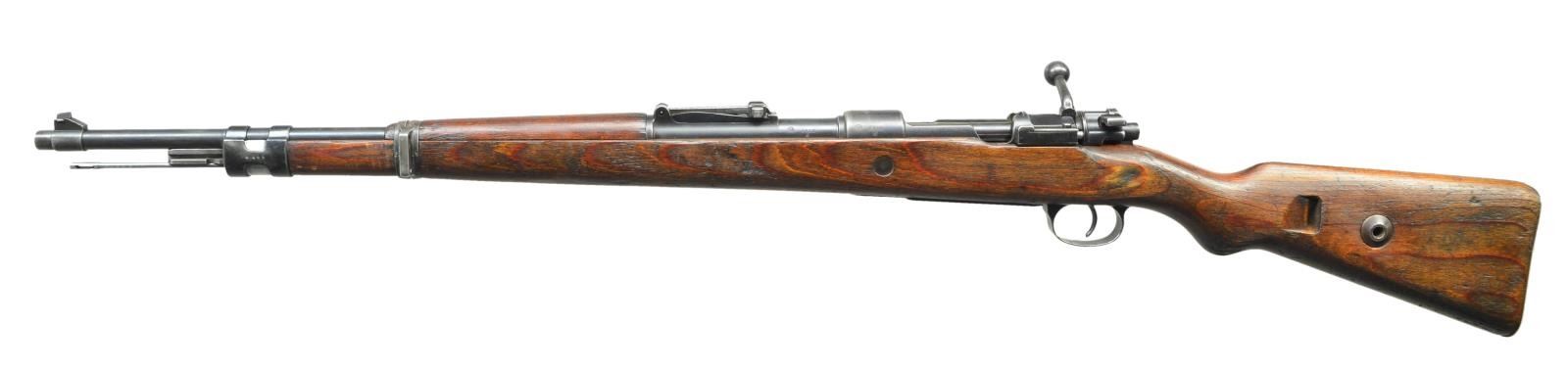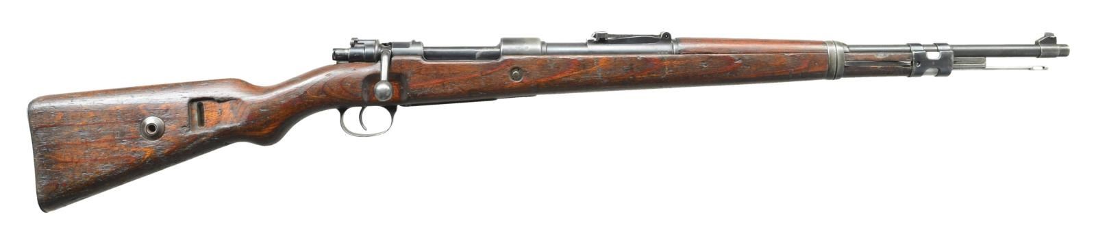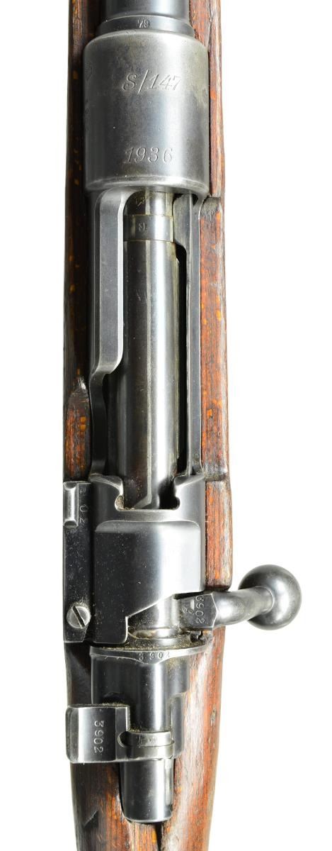 ACTION MAUSER MILITARY RIFLE. Cal. 8mm Mauser. S# 3902 b. Bbl. 23 5/8". Serial numbers match on receiver, bbl., bolt assembly, trigger guard, floorplate & rear sight. Receiver is marked on top w/ "S/147" "1936". Marked on right side w/ 3 droop wing eagles, one is 116, two are 214. Bbl. & receiver marked on left side w/ droop wing eagle proofs. Tangent rear sight graduated to 2,000 meters. Inverted V front sight. Bayonet bar & cleaning rod are present. All milled furniture. Bands retained by single spring. Unmarked laminated stock set w/ steel disassembly disk & flat type buttplate. CONDITION: stock set has moderate wear, dents & handling marks throughout. Metal retains 60% original blue finish w/ thinning & wear. Very good shiny bore. (22-516/RW). CURIO. $500-700.