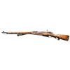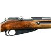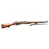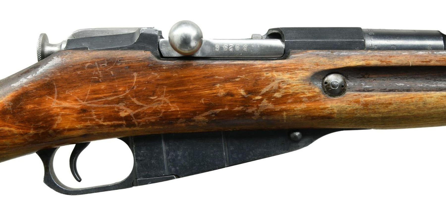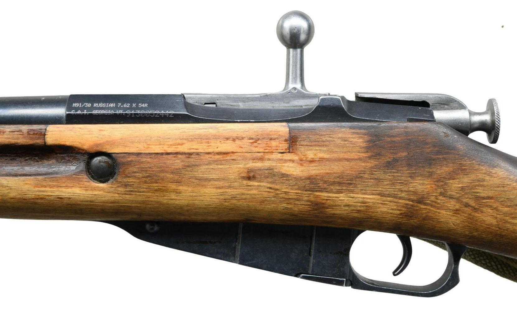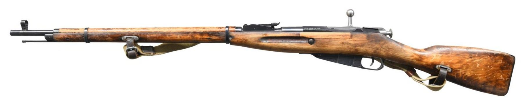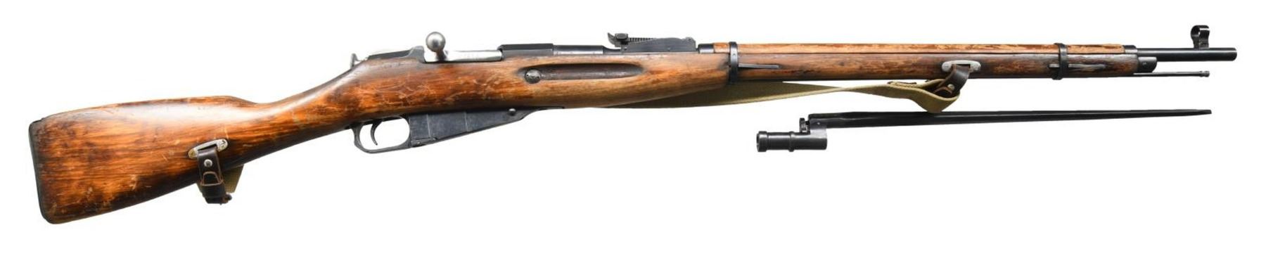 ACTION MILITARY RIFLE. Cal. 7.62x54R. S# 9130052442 import #. (original S#, 39296, matches on bbl., bolt, buttplate & floorplate.) Bbl. 29" marked on top over chamber w/ arrow & star. Tula arsenal marking dated "1933". Hex receiver is import marked on top left flap. Tangent rear sight graduated to 2,000 meters. Post front sight w/ protective hood. Post has been enhanced w/ white. Straight bolt handle. Hardwood stock set w/ sling slots. 2 bbl. bands retained by springs. Left side of stock has inletted replacement wood to fill scope base mortise. Cleaning rod is present. Green web sling w/ leather collars. UNATTACHED ACCESSORIES: 17" cruciform blade socket bayonet. Bayonet retains most of its blue finish w/ light wear & handling marks. CONDITION: stock set has lost a great deal of its arsenal rework finish leaving wear, staining & handling marks throughout. Metal retains 80% of its arsenal rework blue refinish w/ light wear. Bore is shiny but w/ moderately worn lands. (23-4907/RW). CURIO. $400-600.