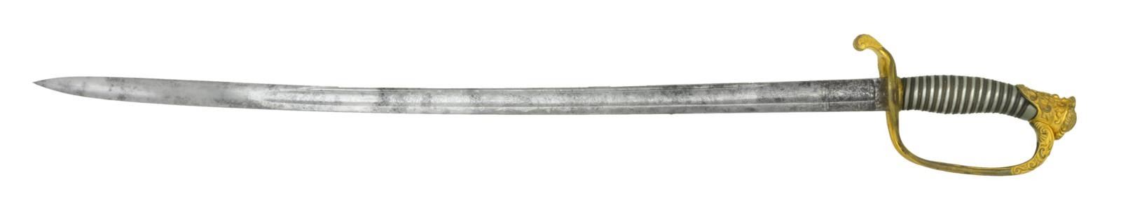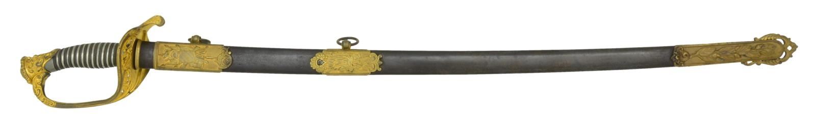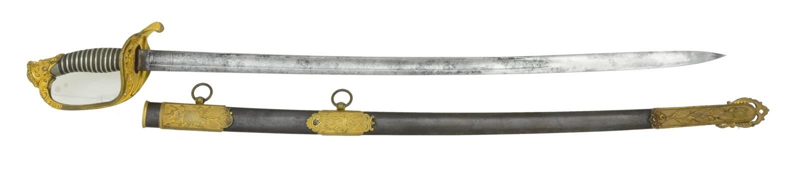 SWORD BY HORSTMANN OF PHILADELPHIA. This sword measures 39 1/2" overall with a 31 1/2" blade. Blade has a single wide fuller with a single narrow fuller near the spine. Blade is etched over half its length with various military, patriotic & foliate motifs. The blade was made by Gebruder Weyersberg and retailed by Horstmann. There is an etched mark near the ricasso that reads “WH HORSTMANN & SONS PHILADELPHIA”. Gilded brass hilt with heavily embellished pierced Foot Officer’s style guard. Knuckle bow is initially plain, but embellished 2” from the pommel. Pommel is heavily sculpted with floral & foliate motifs. Solid silver grip with multi-twist brass wire wrap. Plum brown finished iron scabbard with gilded brass classical mounts showing arms on the top & middle mount with acorns & leaves at the drag. CONDITION: blade has a medium gray mottled patina with scattered areas of discoloration. Hilt is quite nice with most of the original gilded finish remaining. Grip is undamaged. Scabbard shows light overall wear with gilded finish remaining in the protected areas. (02-19423/BF). $1,800-2,500.