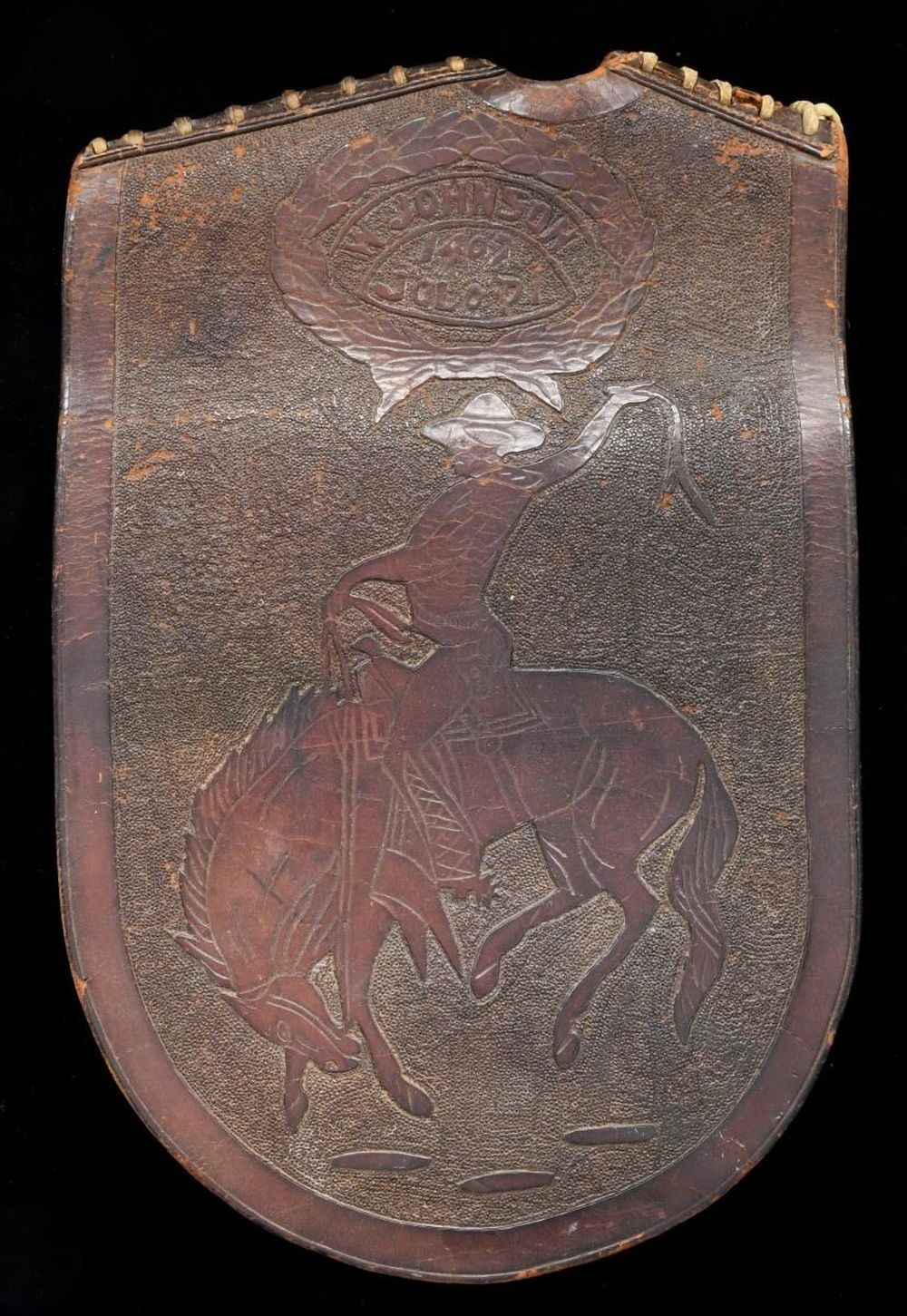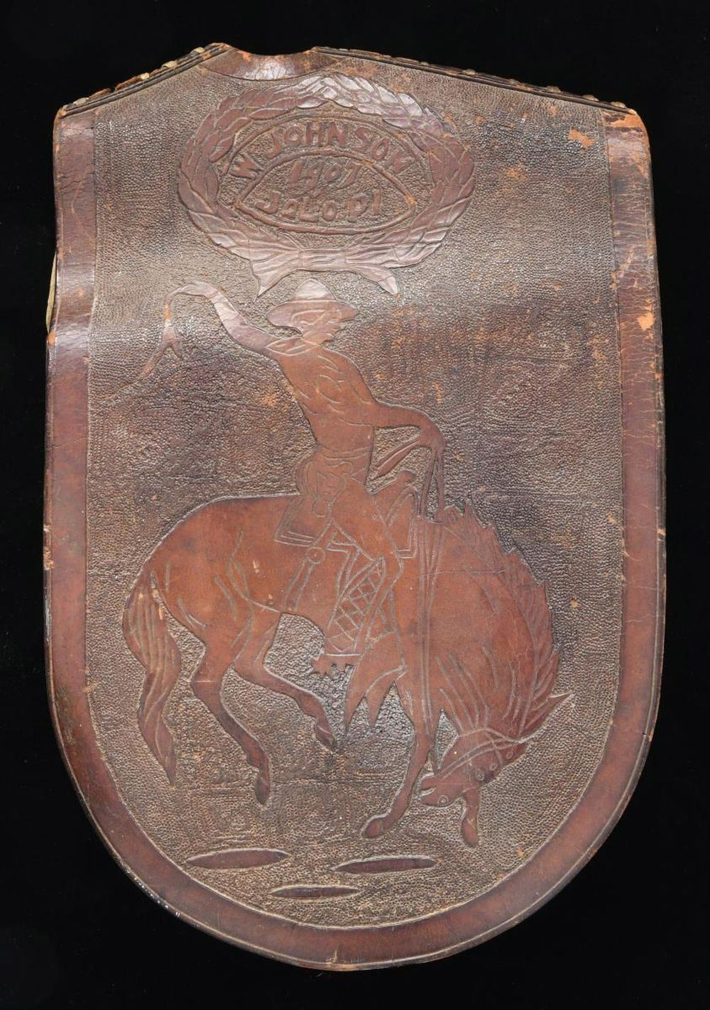 These carved and embossed, Mexican-style saddle bags, measuring approx. 13 1/2" x 9", feature a Bronco Buster on bucking horse motif, with a wreath below that reads "W JOHNSON 1907 JOLOPI". UNATTACHED ACCESSORIES: descriptive sheet. CONDITION: very good. PROVENANCE: Martin Lane Historic & Western Americana Lifetime Collection. (02-21644/JS). $400-600.