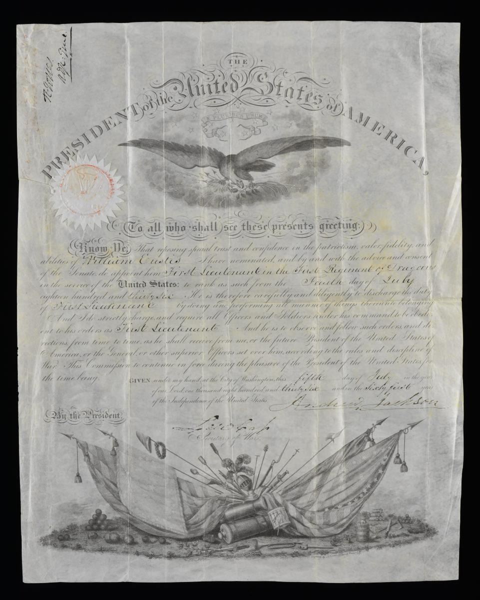 APPOINTMENT FOR WILLIAM EUSTIS OF THE 1ST DRAGOONS. This scarce presidential signed commission measures 13 3/4" x 17 1/4" & is signed by Andrew Jackson. The commission appoints William Eustis to the rank of 1st Lieutenant in the 1st Regiment of Dragoons. The commission is dated July 5, 1836. William Eustis attended the Military Academy at West Point from 1826-1830. He initially served on the Red River from 1830-31, Ft. Townsend 1831-1833 & Ft. Gibson 1834-1835. He was on recruiting duty from 1835-1836 & in Europe from 1836 to early 1837 when he returned for service at Ft. Des Moines. He was then posted to Ft. Leavenworth from 1837-1838 & then again in 1839 after a short post at Ft. Snelling. He then traveled to Europe w/ Philip Kearny & Henry Turner attending the Cavalry School at Saumur, France & translating French cavalry tactics books. From 1841 through 1846 he served at various forts around the Kansas frontier. He went to Mexico w/ the 1st Dragoons from 1846 to 1847. After the war, he served at the Jefferson barracks & on recruiting service. Eustis then became a farmer in Natchez, Mississippi where he was a Civil engineer & surveyor until 1875. He was also a distinguished member of the Society of Cincinnati. CONDITION: document is in fine condition & is filled out w/ a good legible hand. Signature is bold & sharp. (02-15778/BF). $1,800-2,500.