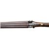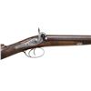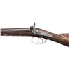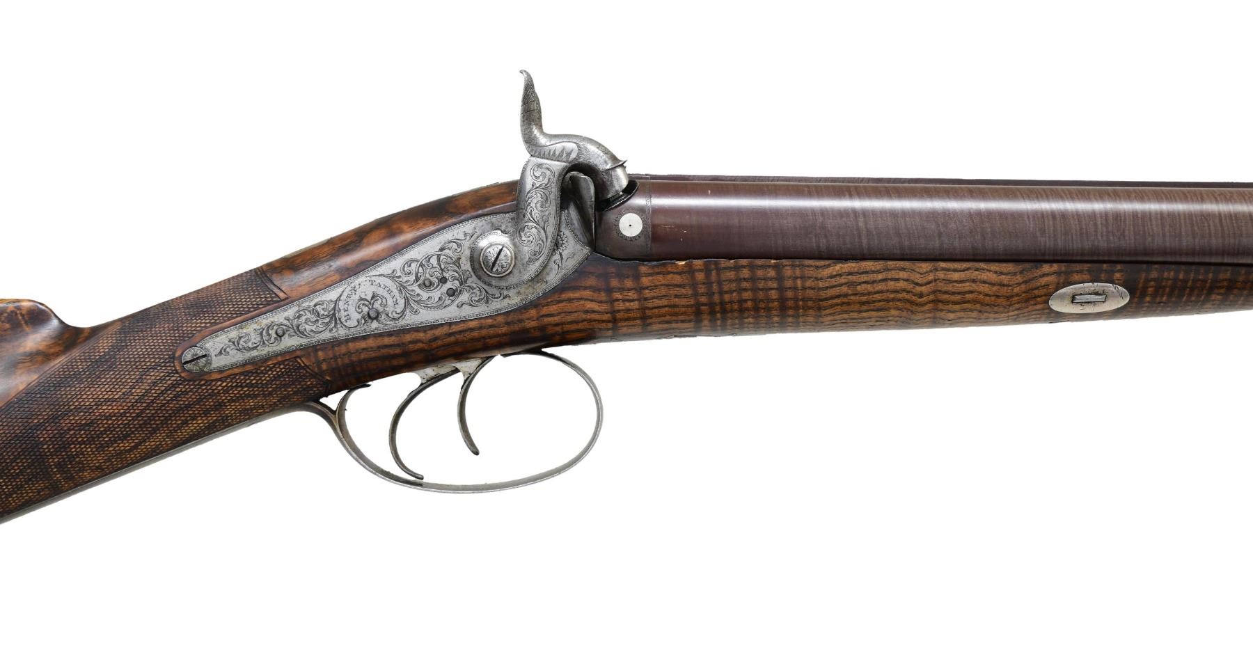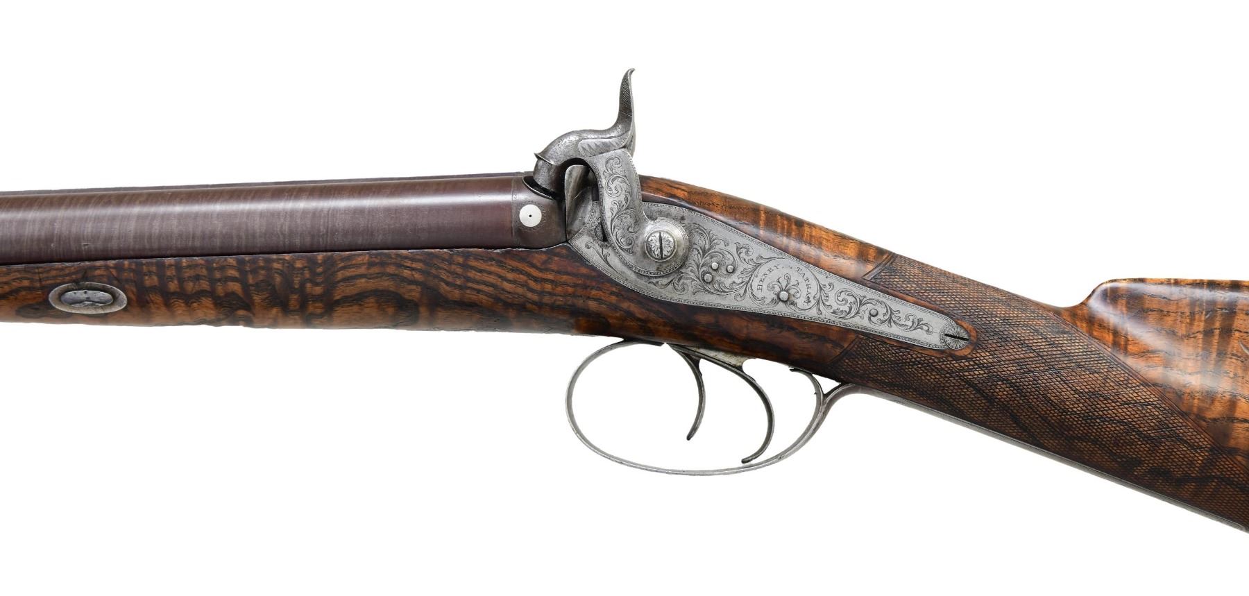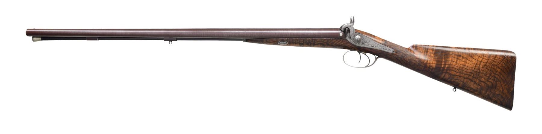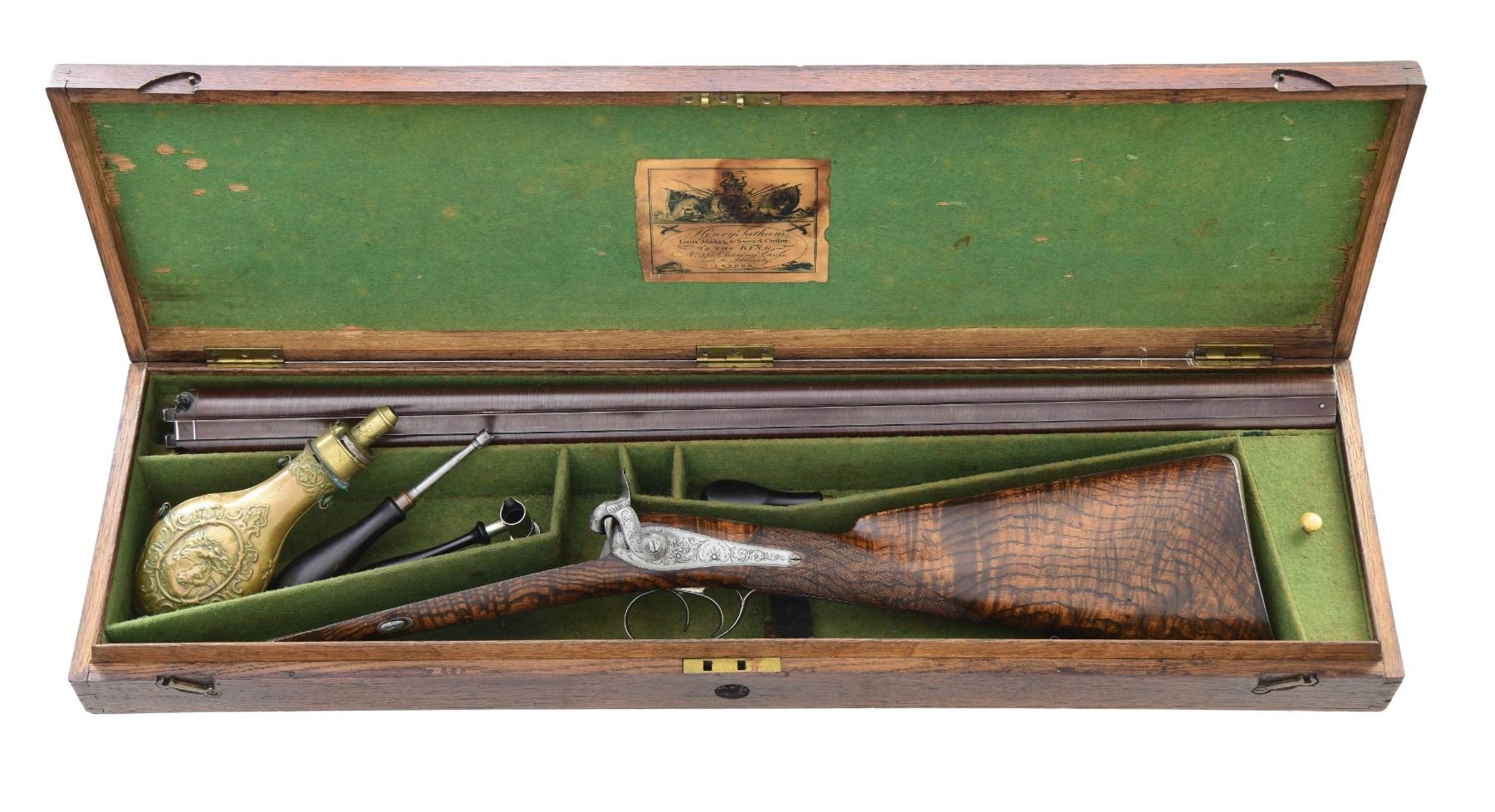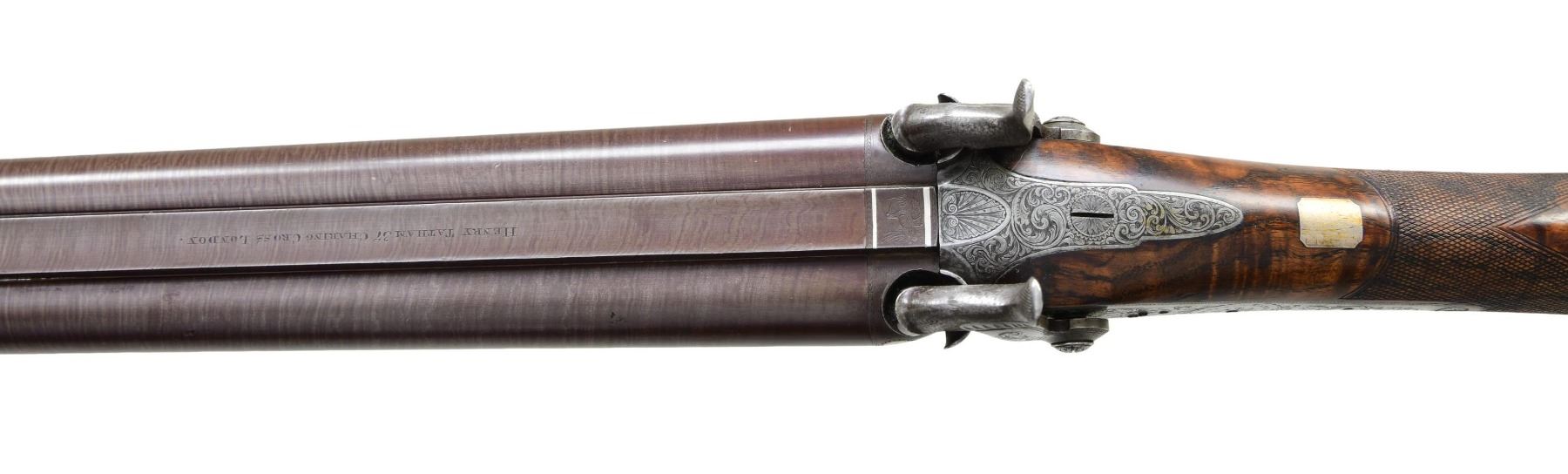 SHOTGUN WITH ORIGINAL CASE & ACCESSORIES. Cal. 14 Bore. S# 1618. The 30" twist barrels are engraved "Henry Tatham 37 Charing Cross London." on broad concave rib. Breech plugs with vented platinum blowouts have two platinum bands on rib extension which is engraved with a snipe. Bottoms of barrels are stamped with London black powder proofs. Breech iron with integral fences is engraved with well cut shaded scroll. Back spring locks with round bodied hammers having stylized dolphin heads are engraved with well cut open scroll. "Henry Tatham" is at the center of each lockplate. Stock of dramatically figured elm is iron mounted and measures 14-1/4" over iron buttplate with long top tang. Tang is engraved with open scrolls surrounding game birds. Trigger guard bow continues this theme. S# is on tang. Trigger plate has scroll engraved stylized pineapple finial. Stock also features closely spaced square checkering at grip and a truncated silver rectangle at top of grip. Stock attaches to barrels with captive side bolt though oval silver escutcheons. A mahogany ramrod with German silver tip and brass tail (worm under cap) mounts through two plain pipes and iron thimble that matches trigger plate. MEASUREMENTS: BBLS: Bore Diameter: L .686. R .686. Wall thickness: L .033. R .036. STOCK: DAH: 2". DAC: 1-1/2". CAST: neutral. LOP: 14-1/4". WEIGHT: 7 lb. 1 oz. UNATTACHED ACCESSORIES: gun is housed in what appears to be its original oak case with central brass medallion on top and pivoting brass hook closure. Case is lined in green cloth and has seldom seen Henry Tatham label in lid. Case contains a fancy brass bodied powder flask by Hawksley, ebony handled striker key, ebony handled nipple wrench and a powder measure. An empty covered compartment has bone knob. CONDITION: good. Barrels retaining nearly all of an old re-brown with fair to good definition to pattern. Locks show some cleaning to silver gray. Furniture is uncleaned gray to brown. Stock retains most of its original oil finish with many marks and dings. Checkering re-cut with some over runs on left side. Bores are good, fairly shiny, heavily frosted throughout. Locks are crisp. Case is quite good; exterior with some oil added over original finish. Interior cloth is fair to good with some insect damage and fading. Label is fair to good, soiled, foxed and with some light rubs. Accessories are good. (01-25794/MGM). ANTIQUE. $3,000-5,000.