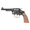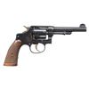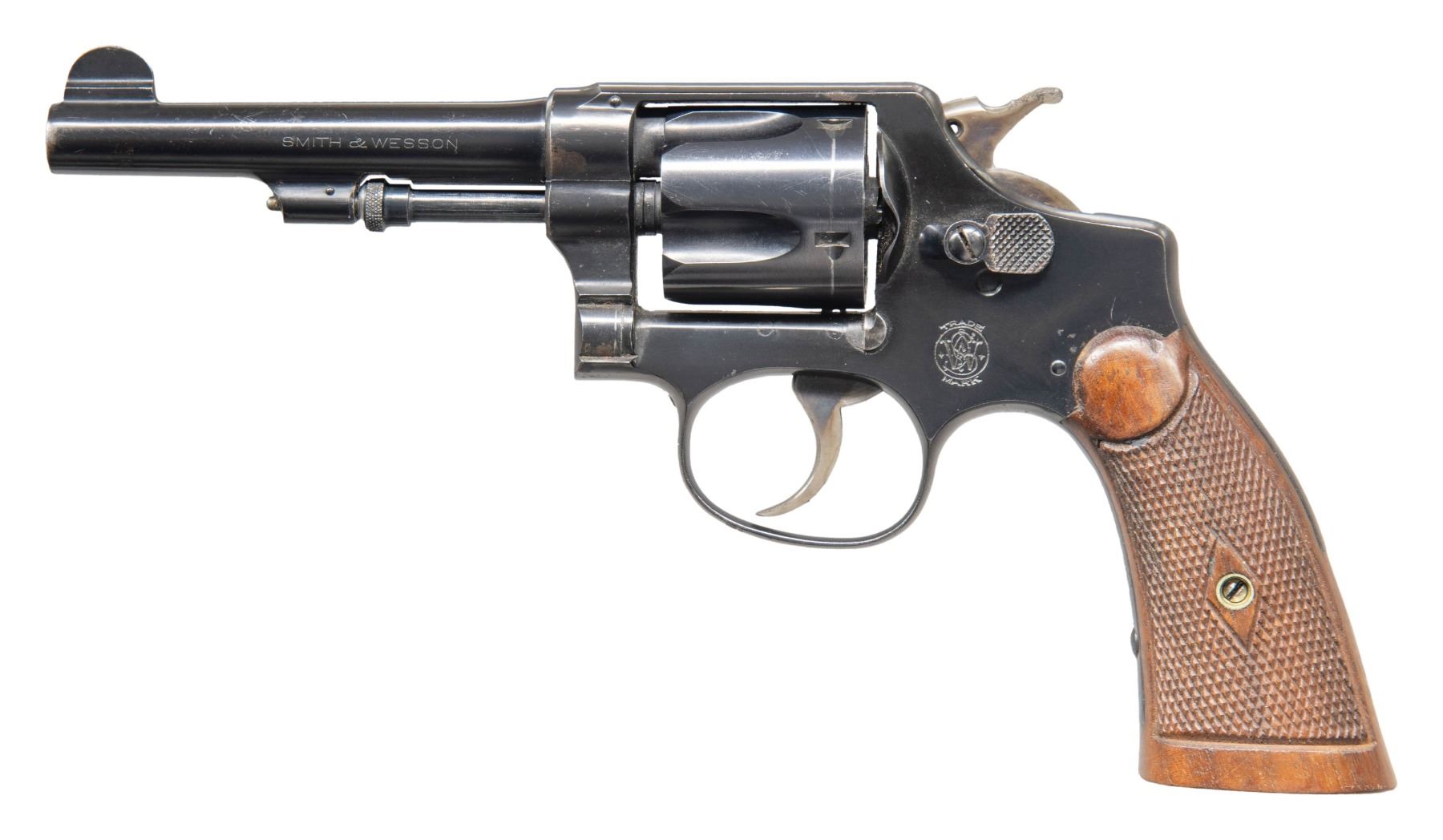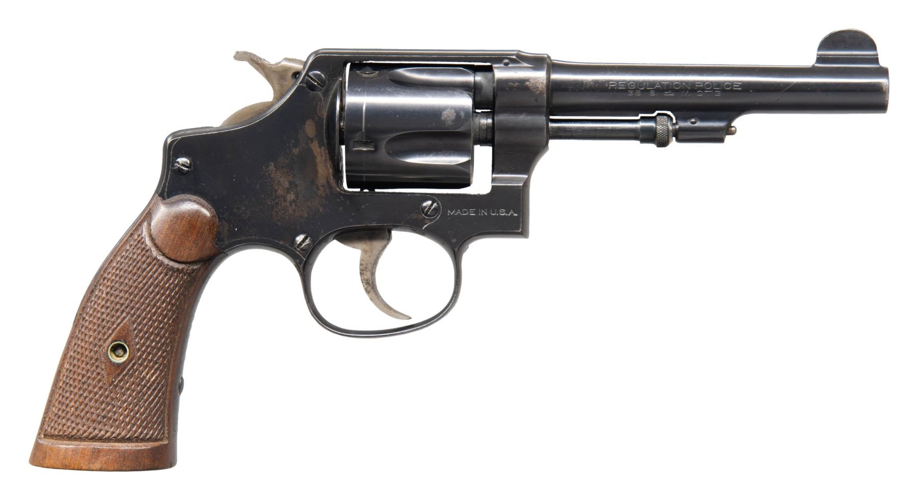 REVOLVER. Cal. 38 S&W. S# 25918. Bbl. 4". Round blade front sight. Fixed rear sight. Matching numbers on frame, bbl., extractor & cyl. Prewar 38 Regulation Police Revolver. 5-shot cyl. Blued finish with case colored trigger & hammer. Checkered walnut diamond center grips with June 5, 1917 patent date. Inside of right panel has faint penciled number that appears to match frame. CONDITION: grips show a couple dings & some handling marks. Hammer & trigger retain strong amounts of case colors with some fading & oxidation most notably on right side of trigger. Balance of metal retains 85% original blue with scattered flaking to brown mostly on exposed edges, some edge wear & light oxidation. Action functions properly when hand cycled. Bright near excellent bore. PROVENANCE: Estate of Groves Herrick. (25-5701/MJC). CURIO. $300-500.