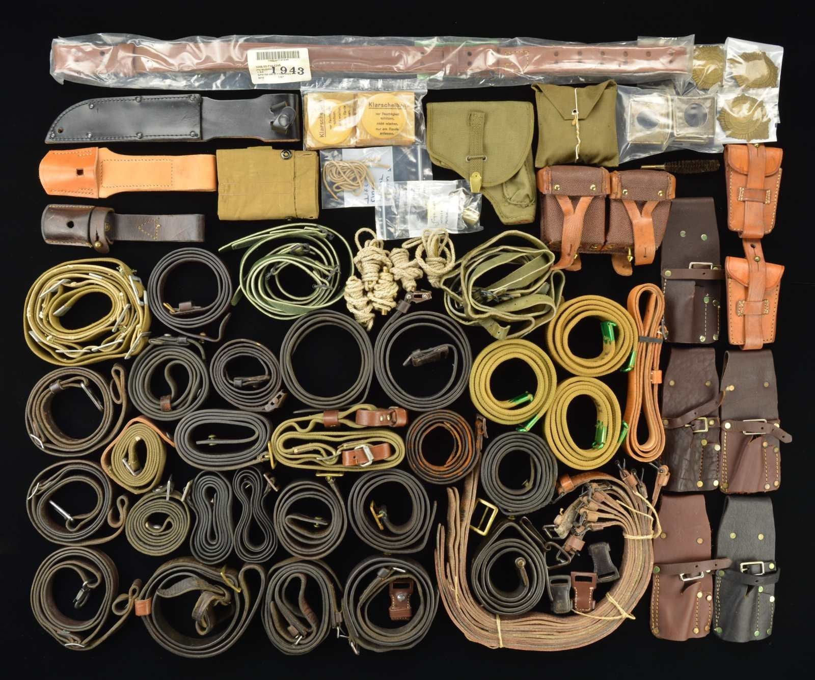 20 SLINGS: 14 Black leather slings: 2 marked w/ "SA" (Finnish) , 2 for Yugoslavian Mauser. / 1 Green web sling w/ Finnish "SKY" marking. / 1 Brown leather ammo pouch for Mosin-Nagant style rifles. / 1 Russian 91/30 Sling w/ leather dog collars. / 3 German G3 style brown leather slings. / Unknown brown leather sling. / 2 Lee Enfield tan web sling. / 10 brown leather pack straps; possibly Czech. / 5 Green straps. / 5+ Green Swedish pack straps. / 9 Clips for 88 Commission rifle. / 9 German WWII gas mask filters. / 3 Siam insignia for helmets. / 5 Tan pack straps; possibly Soviet. / 1 Unmarked brown leather sling. / 4 Cord pull through cleaning kits. / 2 Brown leather Argentine Mauser ammo pouches. / 1 US style brown leather sling. / German WWII liner tie. / 2 Rifle muzzle covers: Yugo & Mauser Export. / Brown leather frog for Yugo Mauser. / 1 Sm. green khaki holster for possibly Colt 1908 style pistol. / Yugoslavian Mauser cleaning kit. / 4 brown leather frogs for South African SMLEs. / CONDITION: good overall appearance w/ wear, patina & staining. (02-16672/MD). $200-400.