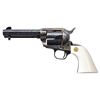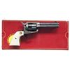 FRAME" ENGRAVING SAMPLER WITH ORIGINAL BOX. Cal. 45 Colt. S# SA73031. Mfg 1985. Colt reintroduced this Frontier Six Shooter with angled cyl retaining screw rather than the transverse push button which was introduced in 1896. Old style "bullseye" ejector rod head. This factory engraved sampler features the engraving styles of Former Colt engraving legends Cuno Helfricht (frame), Louis D. Nimschke (cyl.) & Richard Henshaw (trigger box & butt) along with contemporary factory engravers (bbl). Back strap engraved "Colt Engraving Sampler". Blued steel bbl., 6 shot fluted cyl. & grip frame. Case hardened frame. Hammer has polished sides & is blued on top and back. 1 Piece antique gold medallion Colt ivory grip. UNATTACHED ACCESSORIES: matching original maroon cardboard box with styrofoam inserts containing original paperwork. CONDITION: all aspects near excellent, appears unturned & unfired. box is in very good condition with slight corner wear. (25-1512/BH). MODERN. $3,500-5,500.