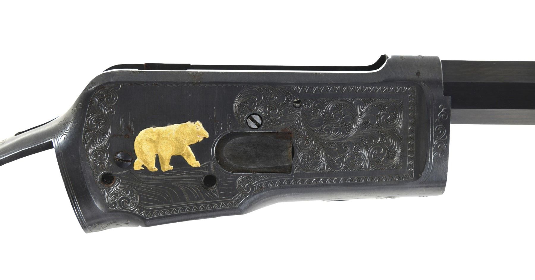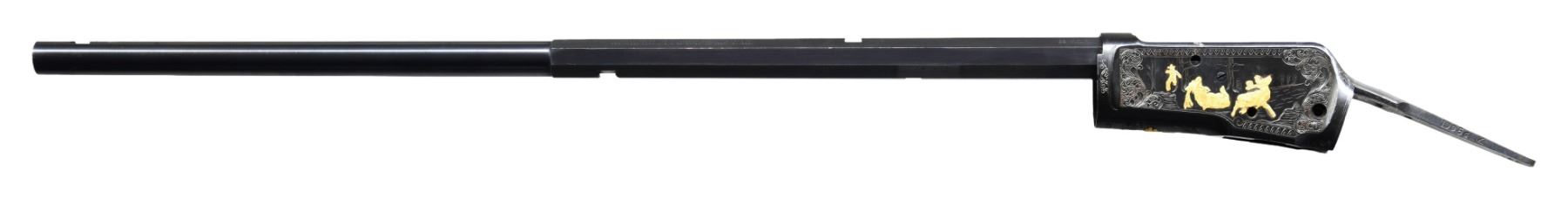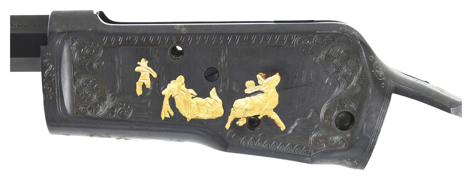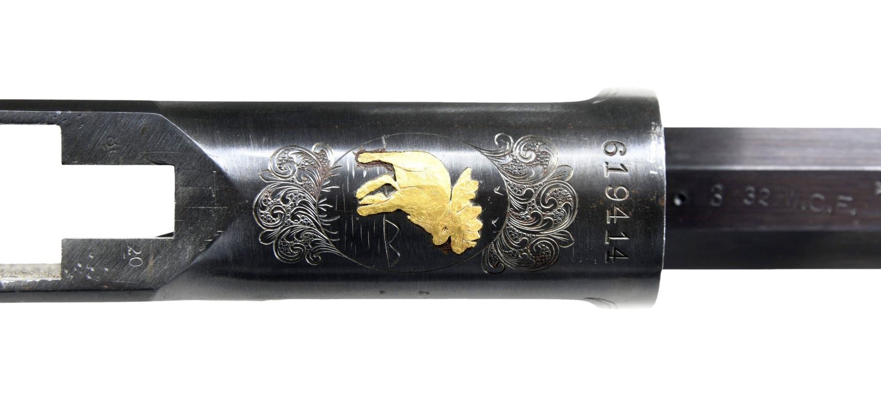 DELUXE BARRELED ACTION. Cal. 32 WCF. S# 619414. Bbl. 22". Model 1892 deluxe bbl.'d action mfg. by Winchester in 1911. The left quarter flat of the half-octagonal replacement bbl. exhibits Winchesters mfg. and patent information markings, with the cal. designation marked towards the breech. Underside of bbl. is marked with an encircled "VP" proof and the cal. designation. Left side of the upper receiver tang is marked "10056 X". The receiver features professionally executed scrollwork on a punch dot background with a gold inlaid scene of a hunter and 2 deer on the left, with matching scrollwork present on the right, and a scene of a gold inlaid bear. Underside of receiver features a small scene of a gold inlaid moose within an oval, with scrollwork present on the top and bottom. Receiver exhibits a reapplied blue finish overall. Lever link and internals are absent. CONDITION: receiver retains the majority of its reapplied blue finish, exhibiting some spots of wear, scattered spots of light to mild surface oxidation, as well as a few cleaned spots of mild pitting overall. Bbl. retains the vast majority of its blue finish, exhibiting some scattered spots/areas of oxidation. Mirror bore, exhibiting a few spots of what appears to be mild pitting, while retaining well defined rifling throughout. (25-1675/MLW). MODERN. $600-900.
