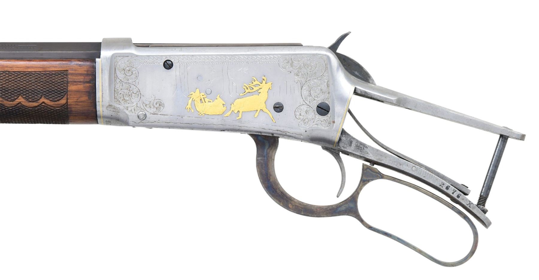 DELUXE BARRELED ACTION. Cal. 30 WCF. S# 334726. Bbl. 26". Model 1894 Deluxe bbl.'d action mfg. by Winchester in 1906. The top flat of the octagonal bbl. is marked with Winchester's mfg. and patent information, with the cal. designation marked towards the breech. Left side of the lower receiver tang is marked "2676 X". Left side of the receiver features scroll engraving, with an incomplete scene of 2 gold inlaid deer, with the right side featuring matching pattern scrollwork, with a gold inlaid bear (scene never started). Sides of receiver also feature a gold colored band at the front and rear edges. Receiver and forend cap are in-the-white, with the bbl. and mag. tube exhibiting a reapplied blue finish. Lever and hammer exhibit a case color hardened finish. Forend has been sanded and revarnished, featuring later added Fleur-de-lis style checkering. Bbl. is fitted with an aftermarket brass tipped blade front sight. Rear sight and mag. tube cap are absent. Trigger, lever, and bolt assemblies are present. CONDITION: receiver retains a bright appearance, exhibiting some scattered spots of surface oxidation, as well as some pitting overall. Bbl. and mag. tube retain the majority of their reapplied blue finish, exhibiting some areas of wear and thinning, as well as scattered spots of surface oxidation and pitting. Very bright bore, exhibiting scattered spots of moderate pitting, while retaining well defined rifling throughout. Forend exhibits scattered marks and minor impressions from handling and storage, but otherwise remains sturdy and serviceable. (25-1676/MLW). MODERN. $600-900.