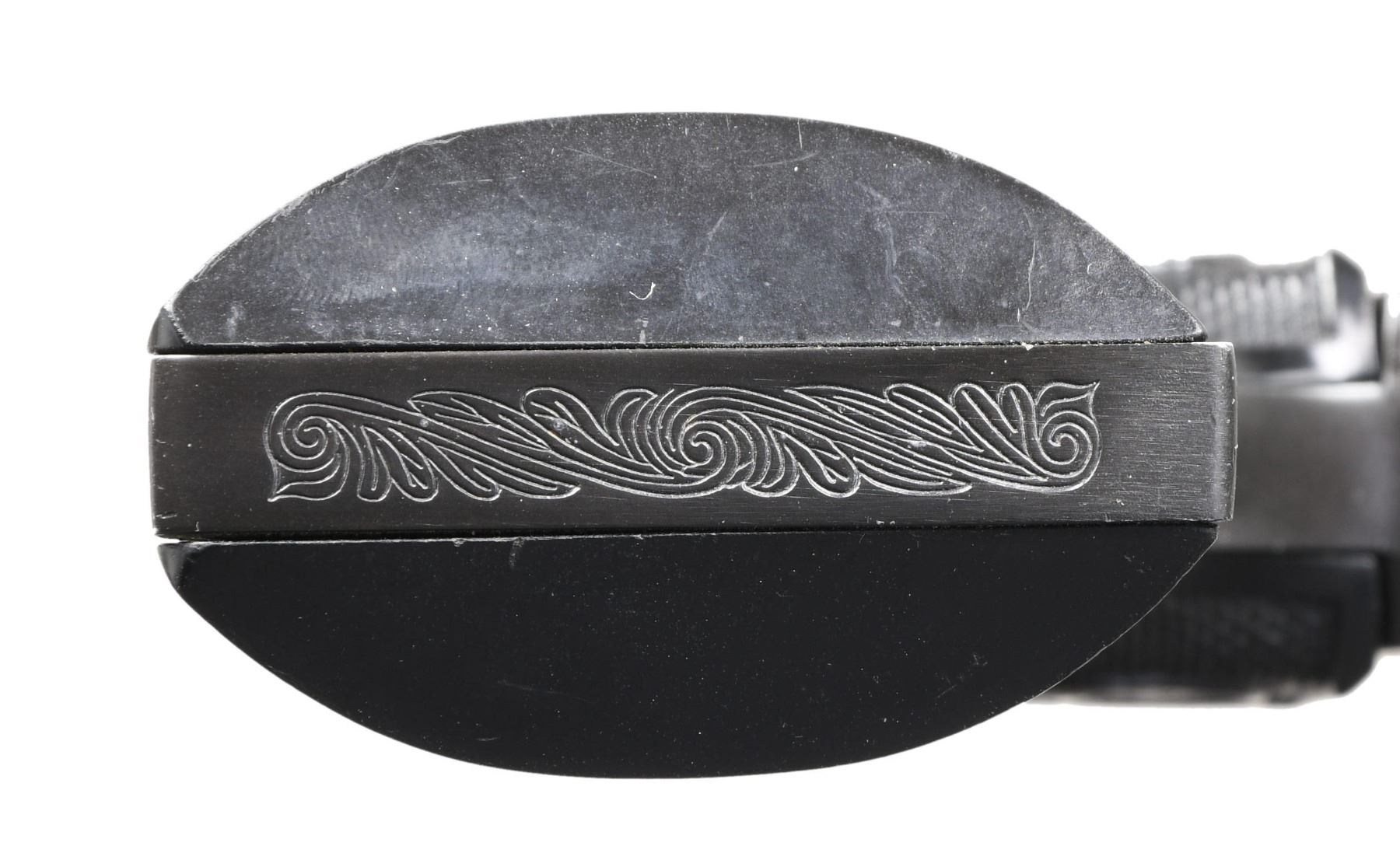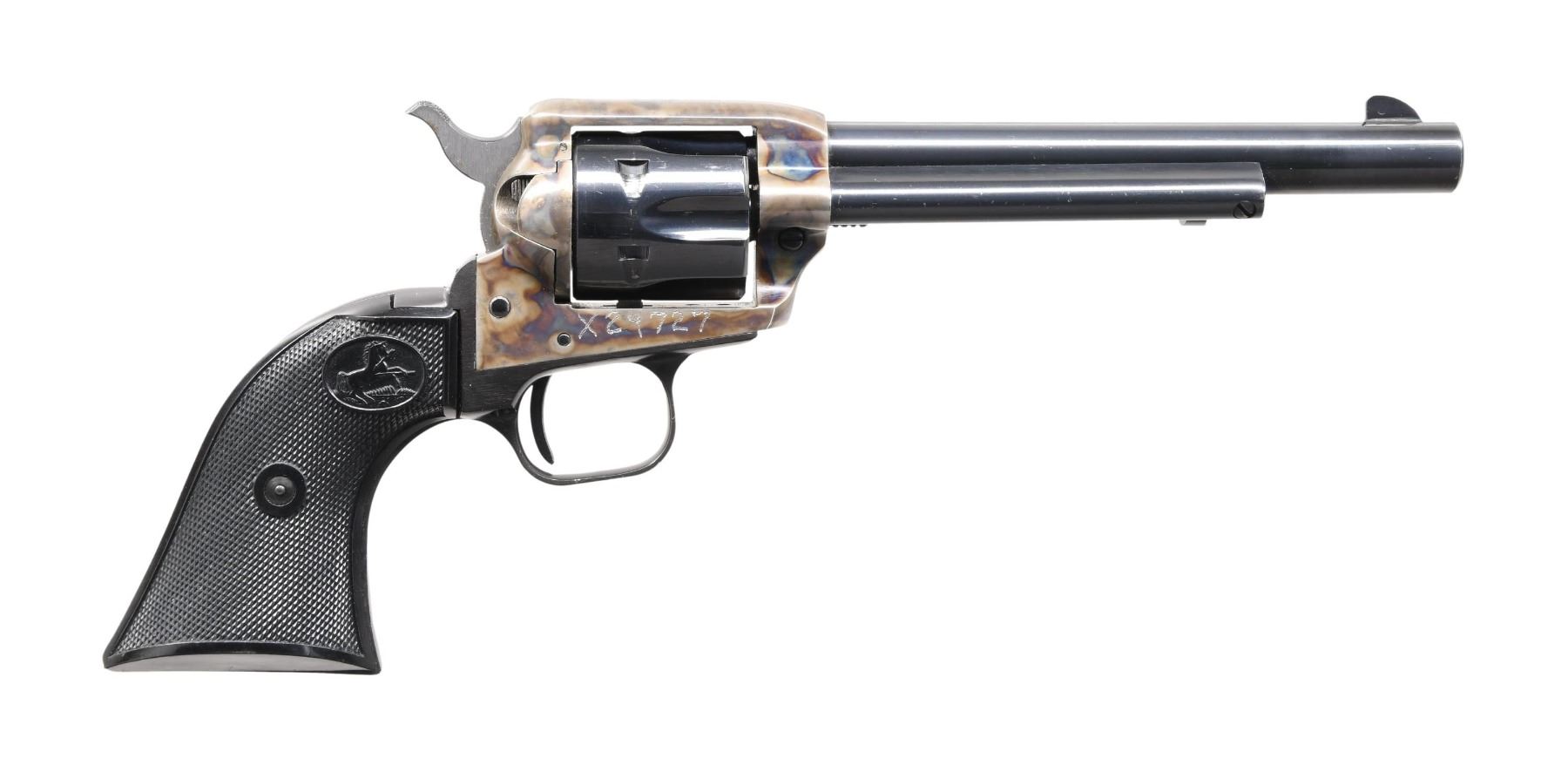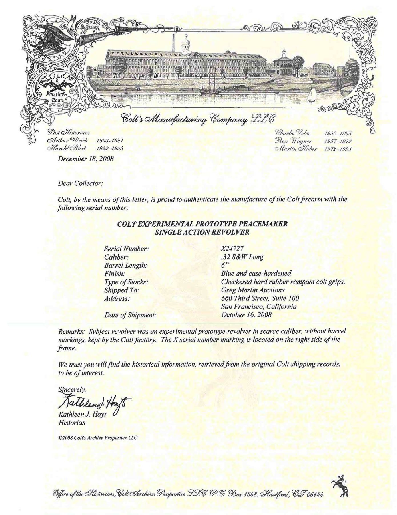 FACTORY LETTER. Cal. 32 S&W Long. S# X24727 electric-pencil marked on left side of frame. Possibly a one-of-a-kind revolver built on a Peacemaker 22 RF action. Frame is fitted w/ an experimental hammer block safety located in the loading slot. Serrated button is pushed-in to activate safety. Safety automatically comes off when revolver is cocked. Bbl. 6" w/ blade sight. Six shot fluted cyl. Blue & case colored finish. 2 piece checkered plastic rampant colt grips. Consignor supplied information implies 1979 mfg. UNATTACHED ACCESSORIES: letter from Colt Archive Properties detailing the following information, "Serial Number: X24727 / Caliber: .32 S&W Long / Barrel Length: 6" / Finish: Blue & case-hardened / Type of Stocks: Checkered hard rubber rampant colt grips / Shipped To: Greg Martin Auctions / Address: 660 Third Street, Suite 100 San Francisco, California / Date of Shipment: October 16, 2008". Includes a revolver is housed in a black leather covered oak case w/ green velour fitted interior for 2 Peacemaker revolvers. Inside case lid has a leather Colt Firearms label. Ebony handled accessories include cleaning rod, brush & turn screw. Case also holds brass oil bottle & case key. Foam-lined wood grain box is marked on end flap w/ S# & "731 Archives". CONDITION: 97% finish showing small marks, faint edge wear & a light cyl. drag line. Sound mechanics. Near excellent bore. PROVENANCE: From the lifelong Collection of Jim Williams. (24-2632/DS). CURIO. $2,500-5,000.
