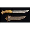 11.5" overall, pictured on page 243 of James R. Johnston's "ACCOUTREMENTS IV", 7" single edged blade, made from a file, carved and nicely patinaed crown stag grip. Well-fit leather sheath accompanies with sewn leather extensions for attachment. CONDITION: very good overall, blade point blunted, sharpened, blade has mottled iron patina, sheath is sound and well fit, scuffed. PROVENANCE: James R. Johnston collection. (02-23248/JS). NON-GUN. $2,000-3,000.