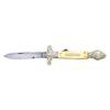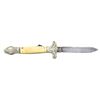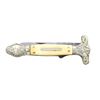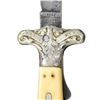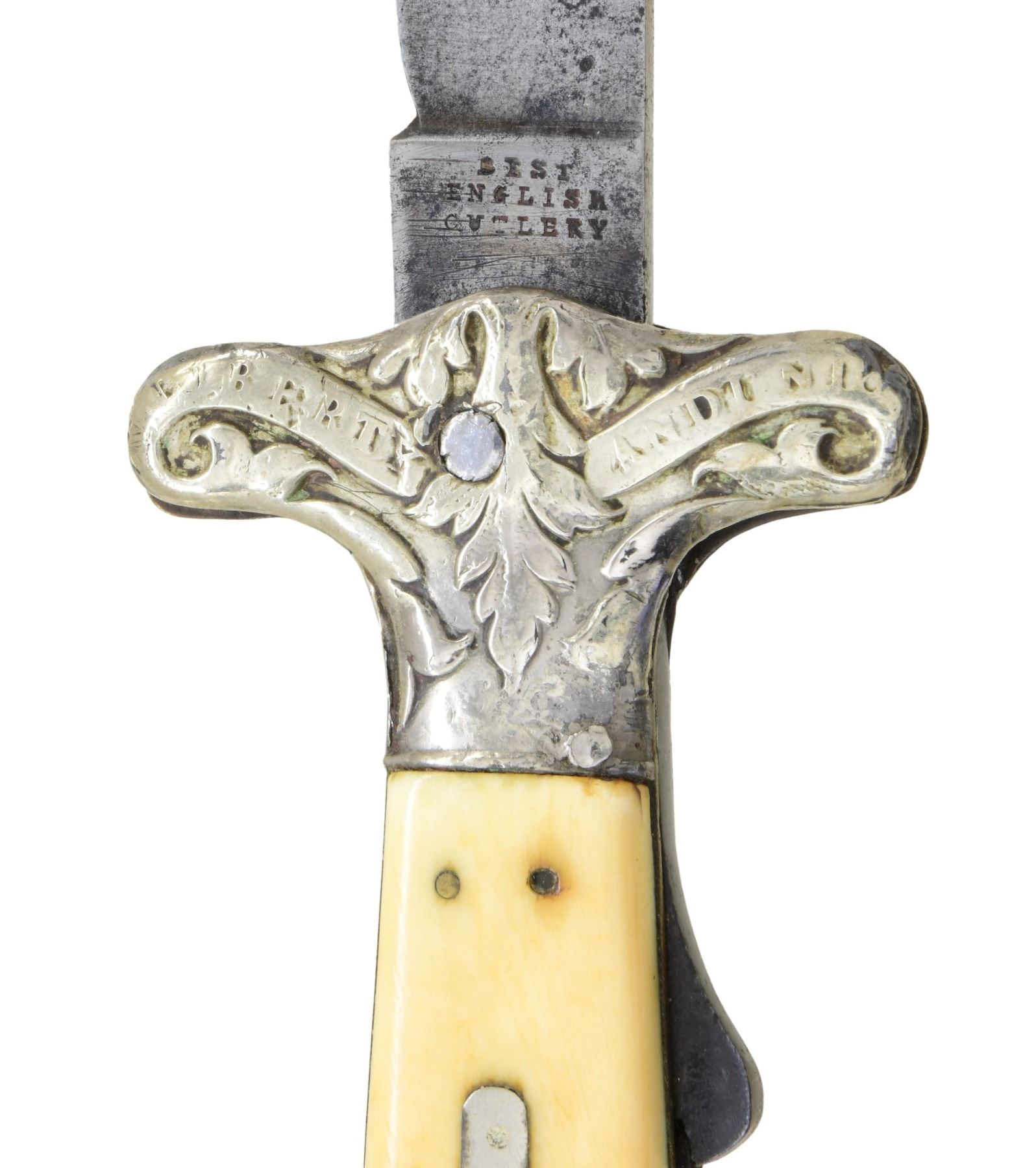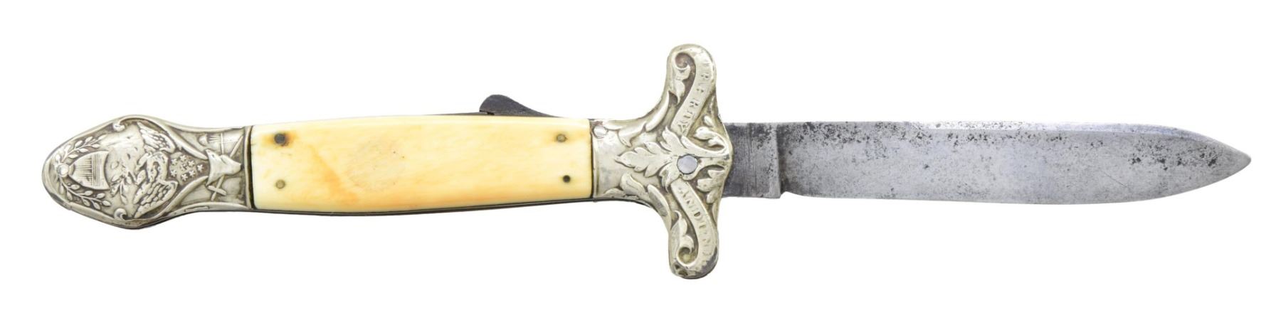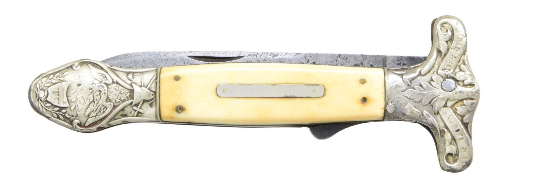 FOLDING KNIFE. 9.5"overall, 4.25"spear point blade, marked "BEST ENGLISH CUTLERY", unknown maker. German silver bolsters, cross guard "LIBERTY AND UNION", pommel bolster has liberty cap, stars, eagle, and patriotic shield, ivory slab handle. The English cutlery makers picked up the phrase "Liberty and Union" as a patriotic slogan to appeal to Americans, taking it from a Daniel Webster's 1830 quote. UNATTACHED ACCESSORIES: Custom protective sleeve. CONDITION: good to very good overall, gray blade, stained, pitted. PROVENANCE: Garry Zalesky, Steve Miller. Pictured in Steve Miller's "Folding Bowie Knives", American Blade, July-August 1973; Pictured in Garry Zalesky's "English Knives in the American West", Antique Trader, January 31, 1974, pages 52-5; Gun Report, July 1977; Larry W. Williams lifetime collection-purchased 1978. (02-23255/JS). NON-GUN. $1,500-2,000.
